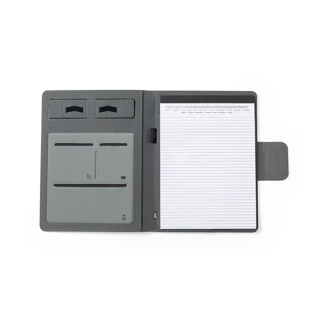 - All’interno, supporto per smartphone e vari scomparti per carte, tra cui un portapenne e un blocco note A4 con 20 fogli con layout a righe