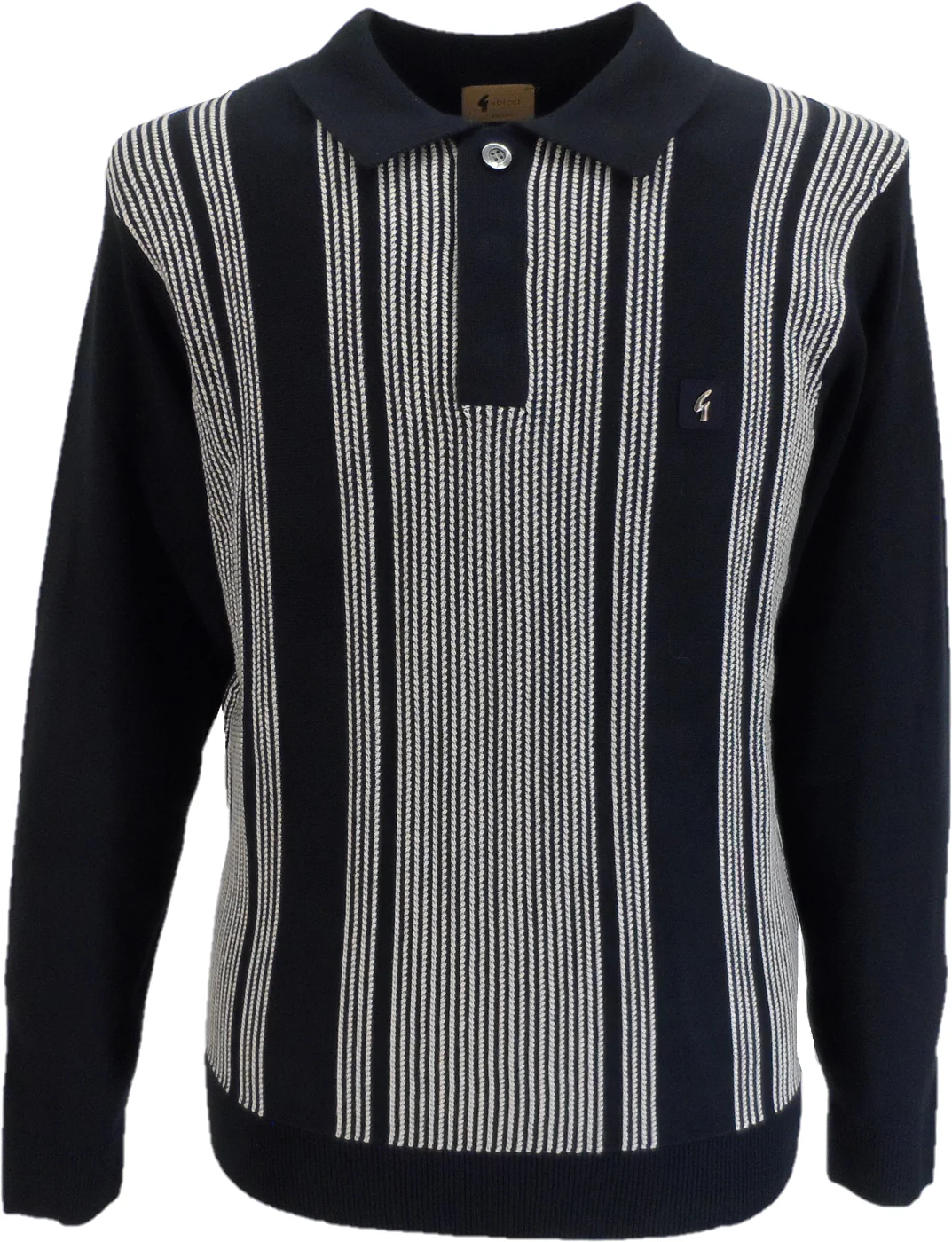 Gabicci Vintage Multi Stripe Textured Knit Mod polo. An authentic Mod design this polo takes inspiration from the classic 60s polo cardigan, typically seen with vertical stripes down the front. Contrasted adorn the front of this long sleeve polo. The ribbed fold-down collar adds the overall Mod feel. Ribbing to cuffs and hem make this perfect for any occasion through the colder months
