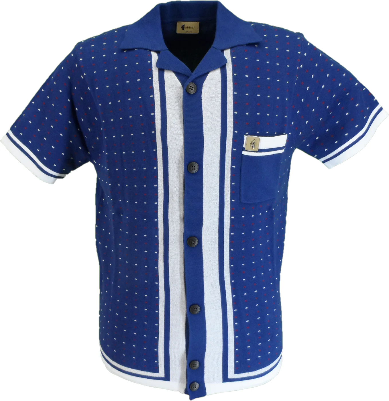 Gabicci Vintage men’s cardigan featuring a striking geometric and stripe pattern with signature branding on the chest pocket. Crafted from a comfortable 60% cotton and 40% acrylic blend, this short-sleeve piece offers versatile layering for casual and smart-casual occasions.