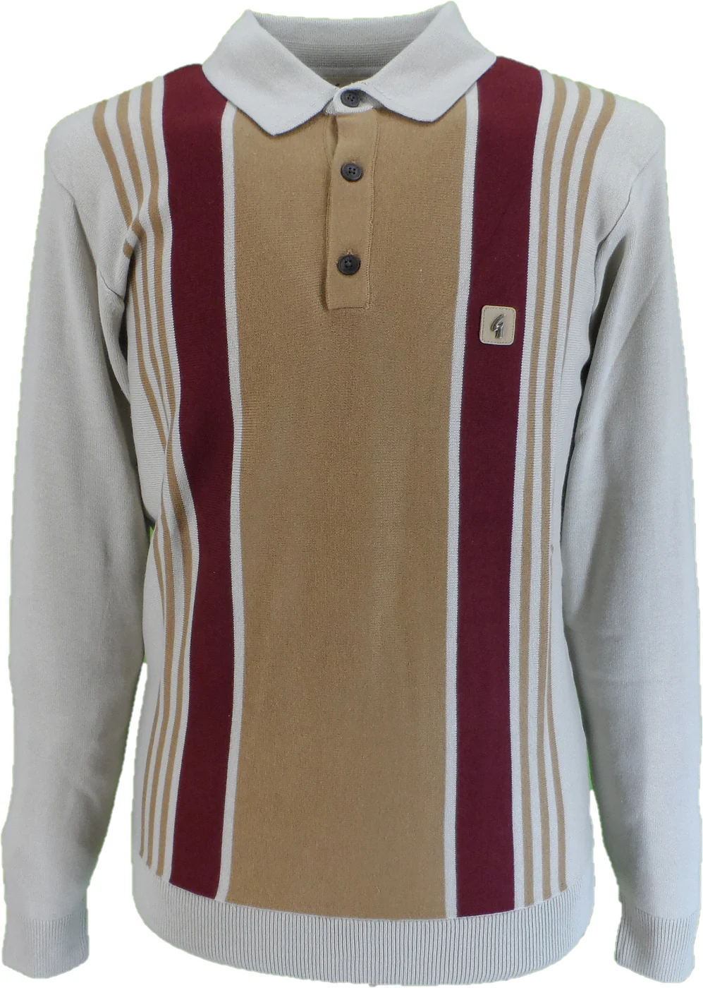 Gabicci Vintage ‘Searle’ Multi Stripe Mod polo. An authentic Mod design this polo takes inspiration from the classic 60s polo cardigan, typically seen with vertical stripes down the front. Contrasted adorn the front of this long sleeve polo. Ribbed fold down collar adds the overall Mod feel. Ribbing to cuffs and hem make this perfect for any occasion through the colder months