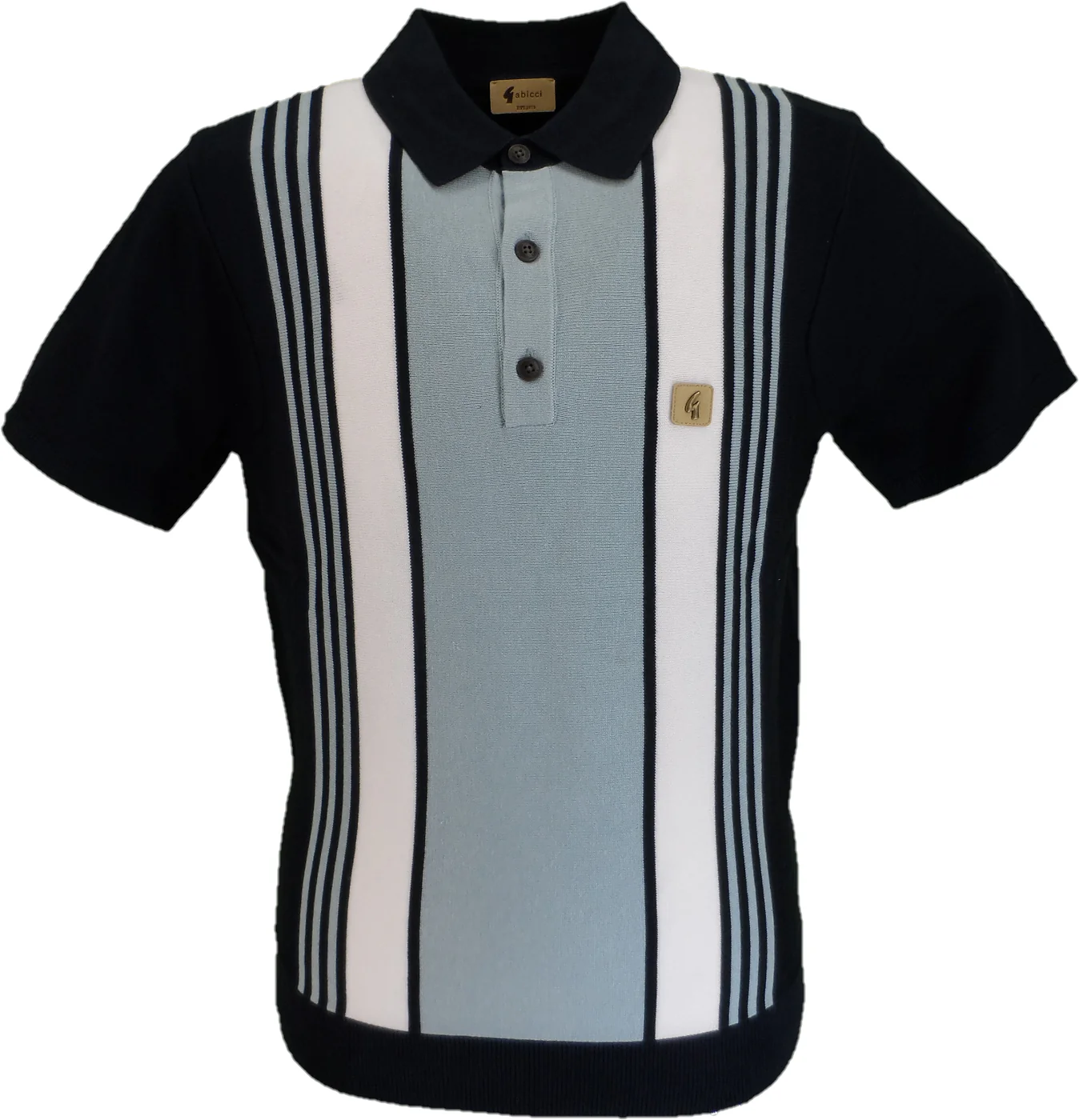 Gabicci Vintage Stripe Mod polo. An authentic Mod design this polo takes inspiration from the classic 60s polo cardigan, typically seen with vertical stripes down the front. Contrasting stripes adorn the front of this short-sleeve polo. Ribbed fold down trimmed collar adds the overall Mod feel.