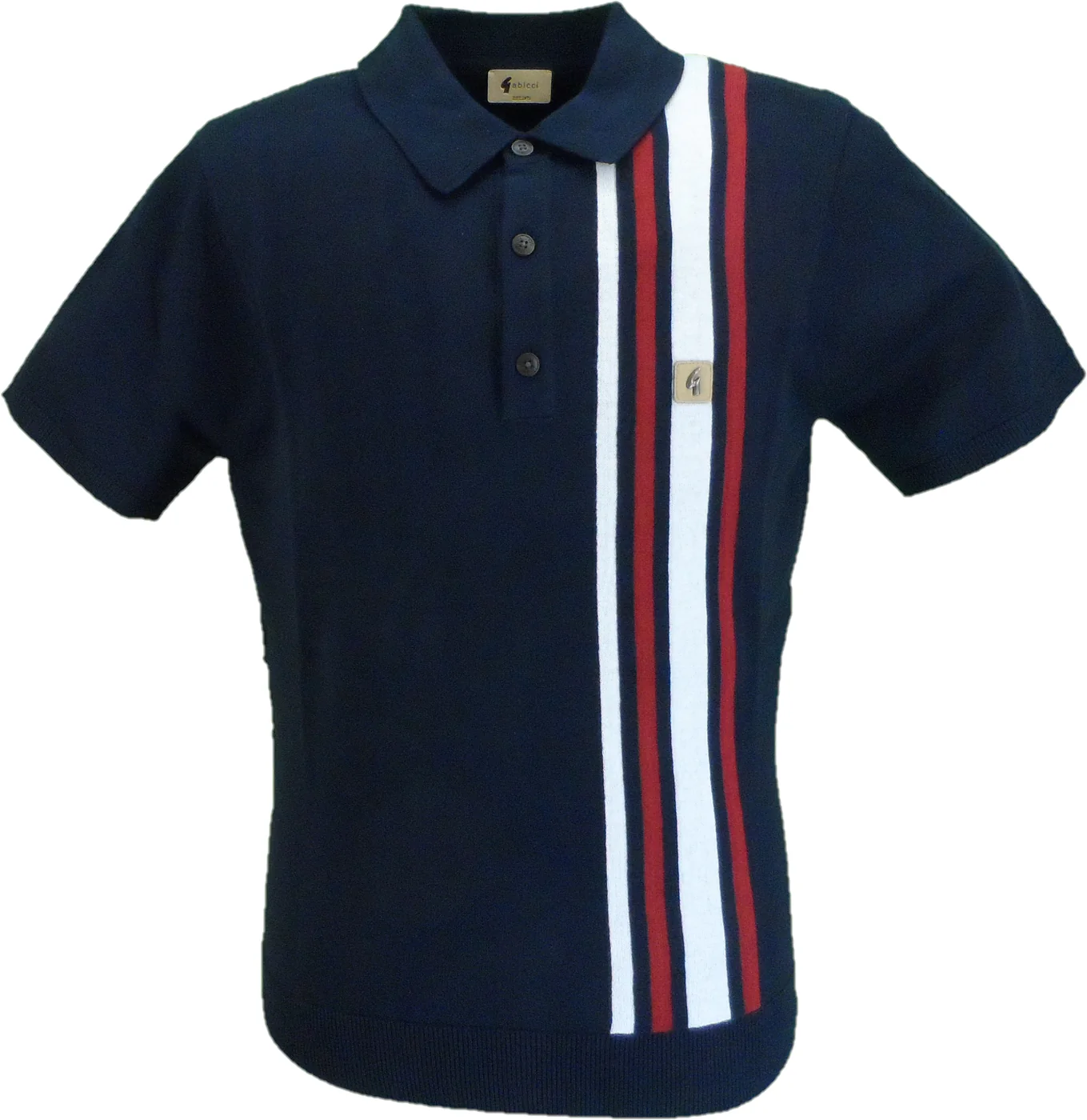 Gabicci Vintage Stripe Mod polo. An authentic Mod design this polo takes inspiration from the classic 60s polo cardigan, typically seen with vertical stripes down the front. Contrasting Stripes adorn the front of this short sleeve polo. Ribbed fold down trimmed collar adds the overall Mod feel