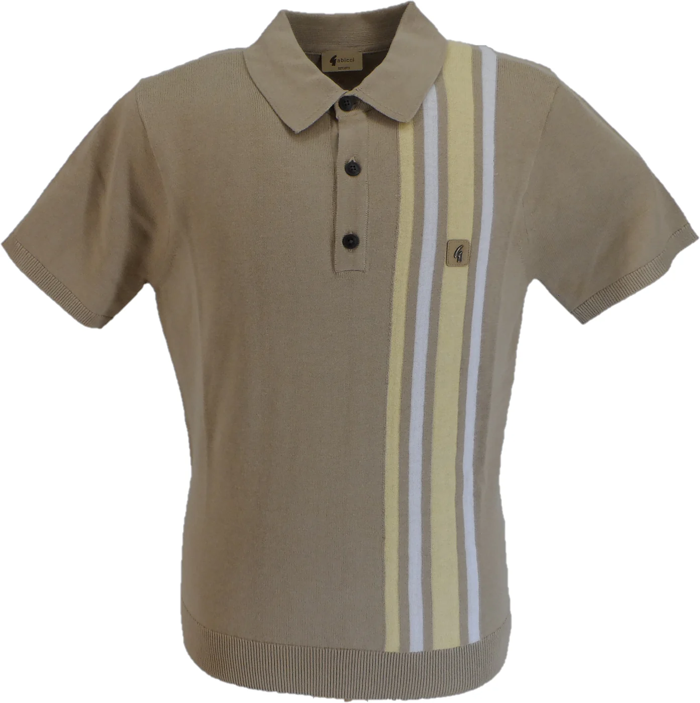 Gabicci Vintage Stripe Mod polo. An authentic Mod design this polo takes inspiration from the classic 60s polo cardigan, typically seen with vertical stripes down the front. Contrasting Stripes adorn the front of this short-sleeve polo. Ribbed fold down trimmed collar adds the overall Mod feel