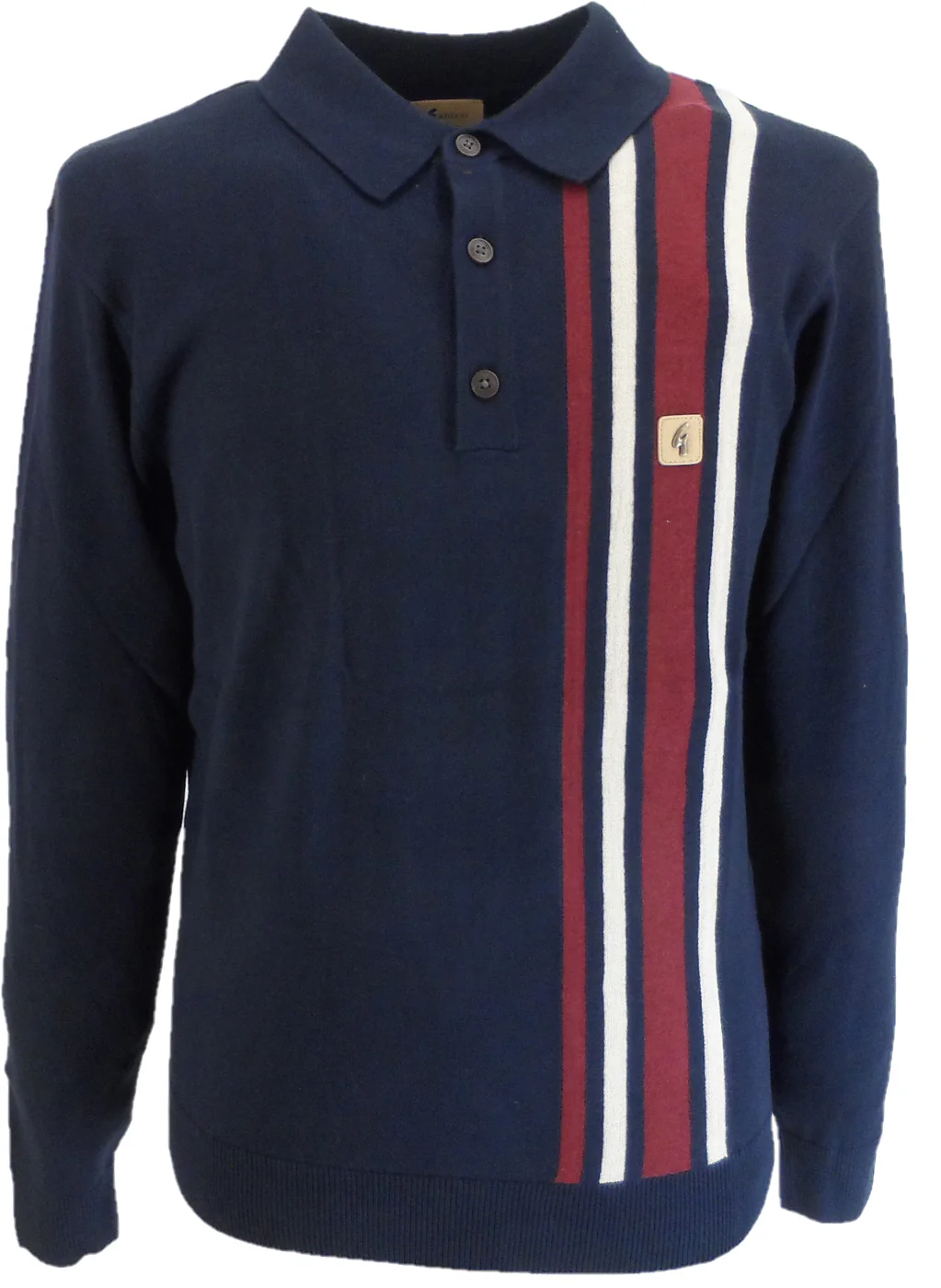 Gabicci Vintage ‘Soda’ Racing Stripe Mod polo. An authentic Mod design this polo takes inspiration from the classic 60s polo cardigan, typically seen with vertical stripes down the front. Contrasted adorn the front of this long sleeve polo. Ribbed fold-down collar adds the overall Mod feel. Ribbing to cuffs and hem make this perfect for any occasion through the colder months