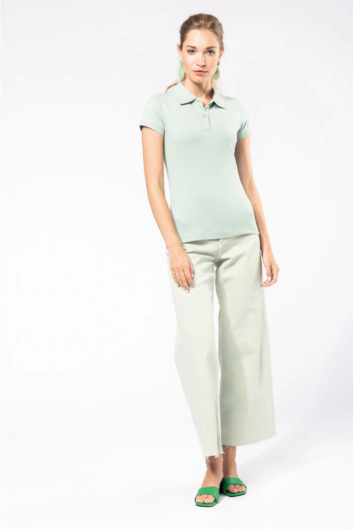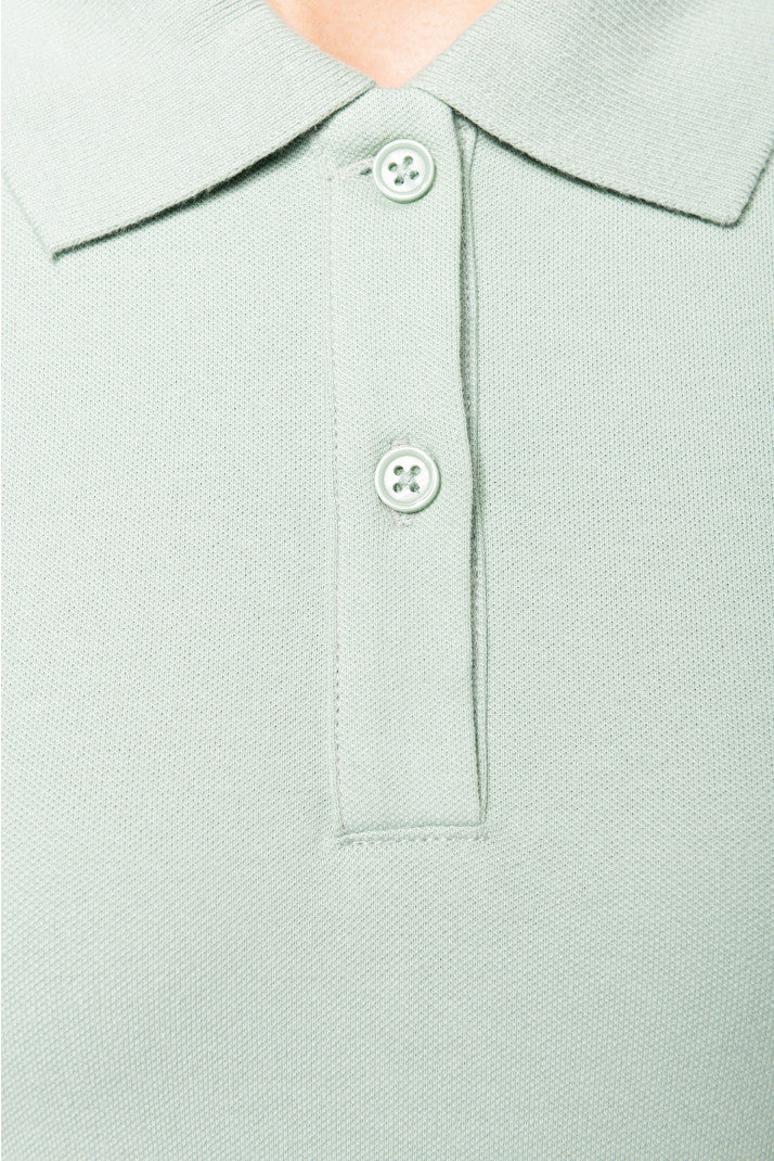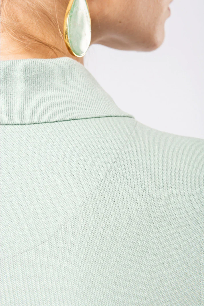 95% Cotone / 5% Elastan. Tessuto Piquè. Collo con bordi. Nastrino di rinforzo al collo. Spacchetti laterali e cuciture a doppio ago. Chiusura a 2 bottoni.