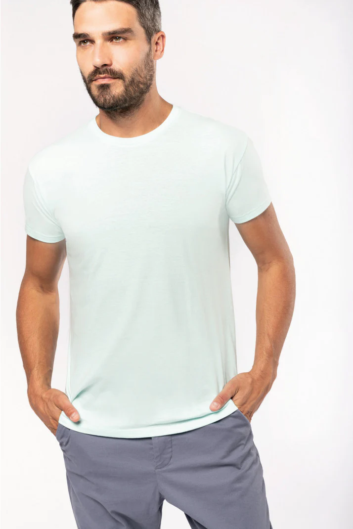 Tinta unita : 100% cotone. Colore Ash Heather : 98% cotone / 2% viscosa. Tinta Oxford Grey : 90% cotone / 10% viscosa. Tinte Wine Heather ; French Navy Heather ; Green Marble Heather ; Cloudy Blue Heather : 80% cotone / 20% poliestere. E i tinta Grey Heather : 70% cotone / 30% poliestere. Tutti i colori sono realizzati in cotone in conversione biologico. Girocollo a costine con elastan. Nastrino di rinforzo tono su tono al collo. Taglio tubolare. Finitura a doppia impuntura a fondo manica e fondo capo. Certificato STANDARD 100 by OEKO-TEX®N° CQ1007/7, IFTH.