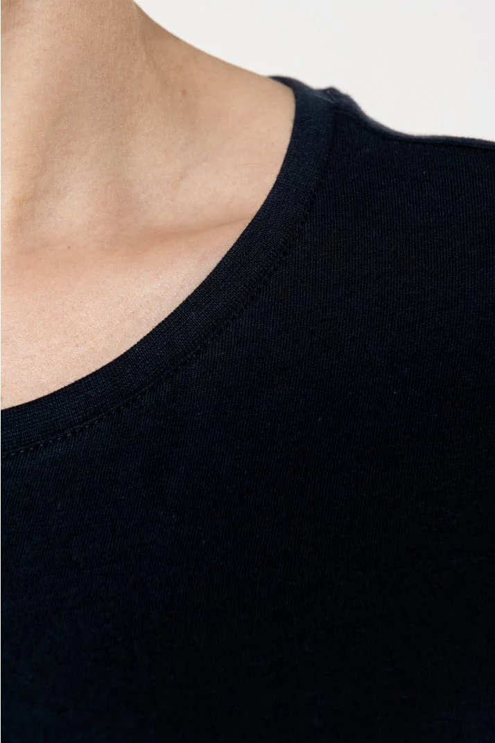 Tinta unita : 100% cotone. Colore Ash Heather : 98% cotone / 2% viscosa. Tinta Oxford Grey : 90% cotone / 10% viscosa. Tinte Wine Heather ; French Navy Heather ; Green Marble Heather ; Cloudy Blue Heather : 80% cotone / 20% poliestere. E i tinta Grey Heather : 70% cotone / 30% poliestere. Tutti i colori sono realizzati in cotone in conversione biologico. Girocollo a costine con elastan. Nastrino di rinforzo tono su tono al collo. Taglio tubolare. Finitura a doppia impuntura a fondo manica e fondo capo. Certificato STANDARD 100 by OEKO-TEX®N° CQ1007/7, IFTH.