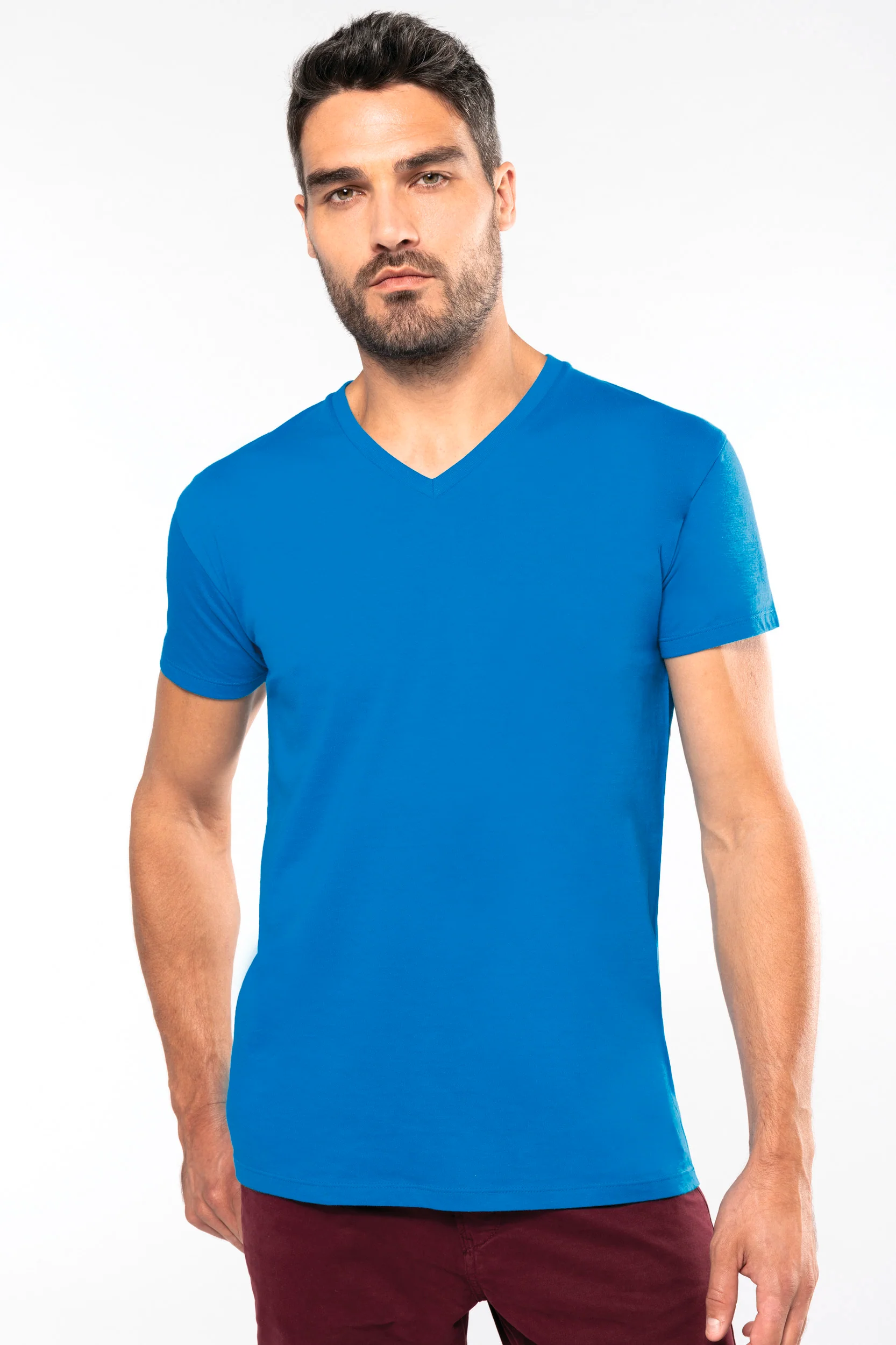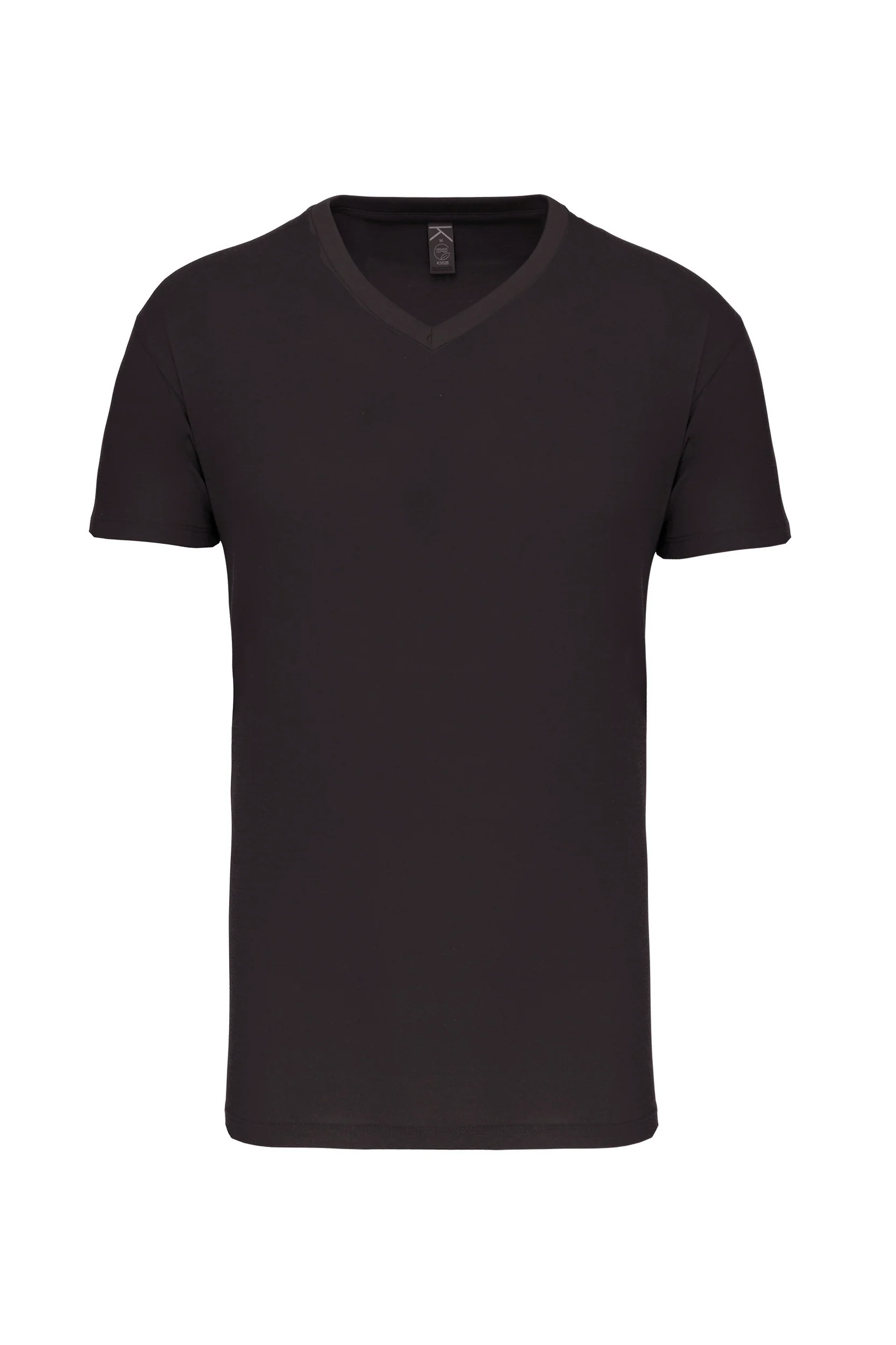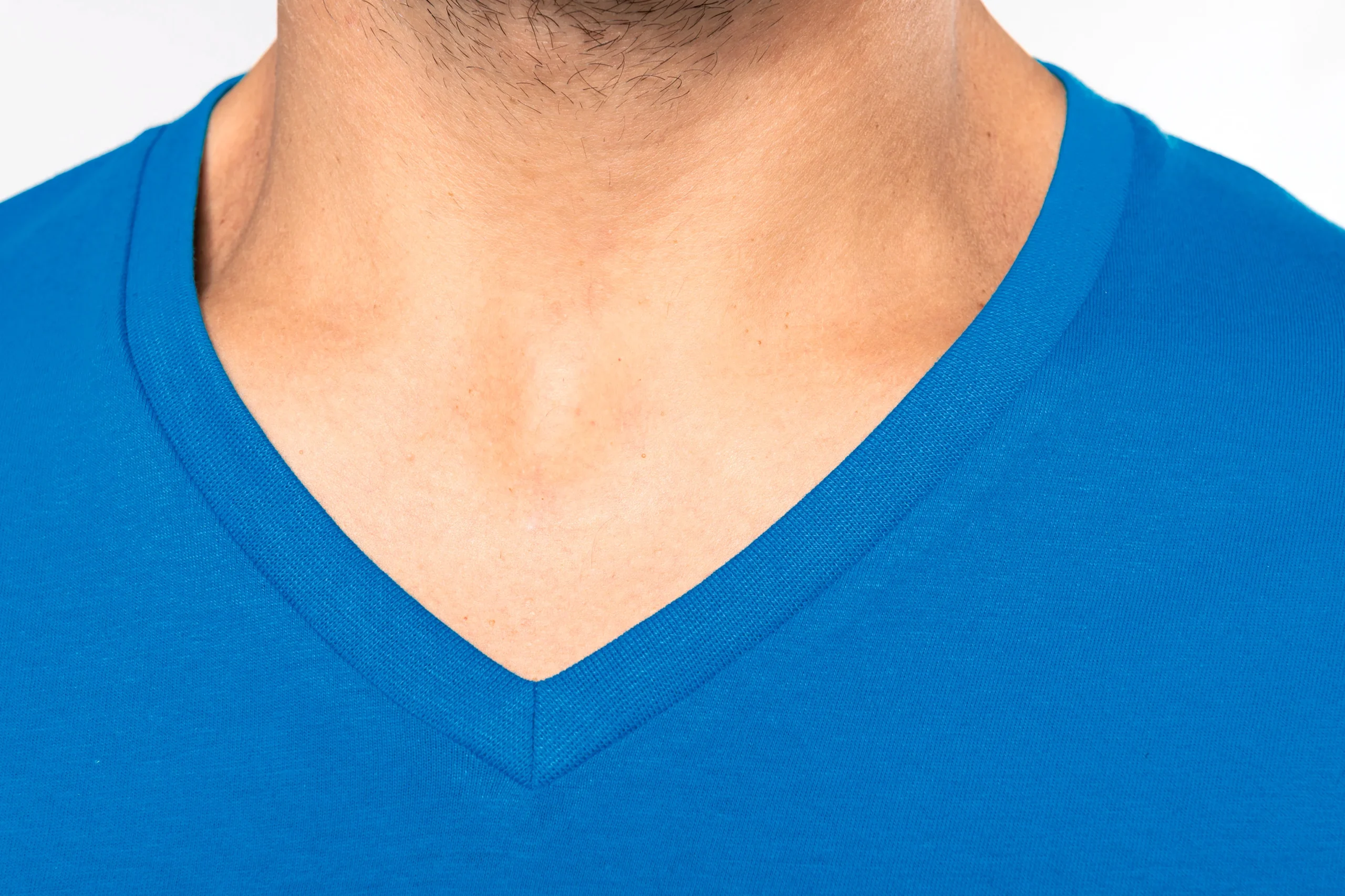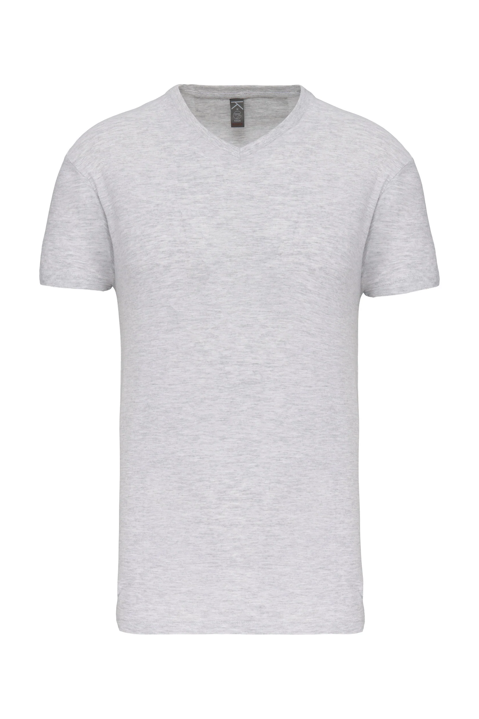 Tinta unita: 100% cotone biologico. Colore Ash Heather: 98% cotone biologico / 2% viscosa, e Oxford Grey: 90% cotone biologico / 10% viscosa. Collo a V a costine con elastan. Nastrino di rinforzo tono su tono sul collo. Taglio tubolare. Finiture a doppio ago sui polsini e a fondo capo. Certificato STANDARD 100 by OEKO-TEX®N° CQ1007/7, IFTH.