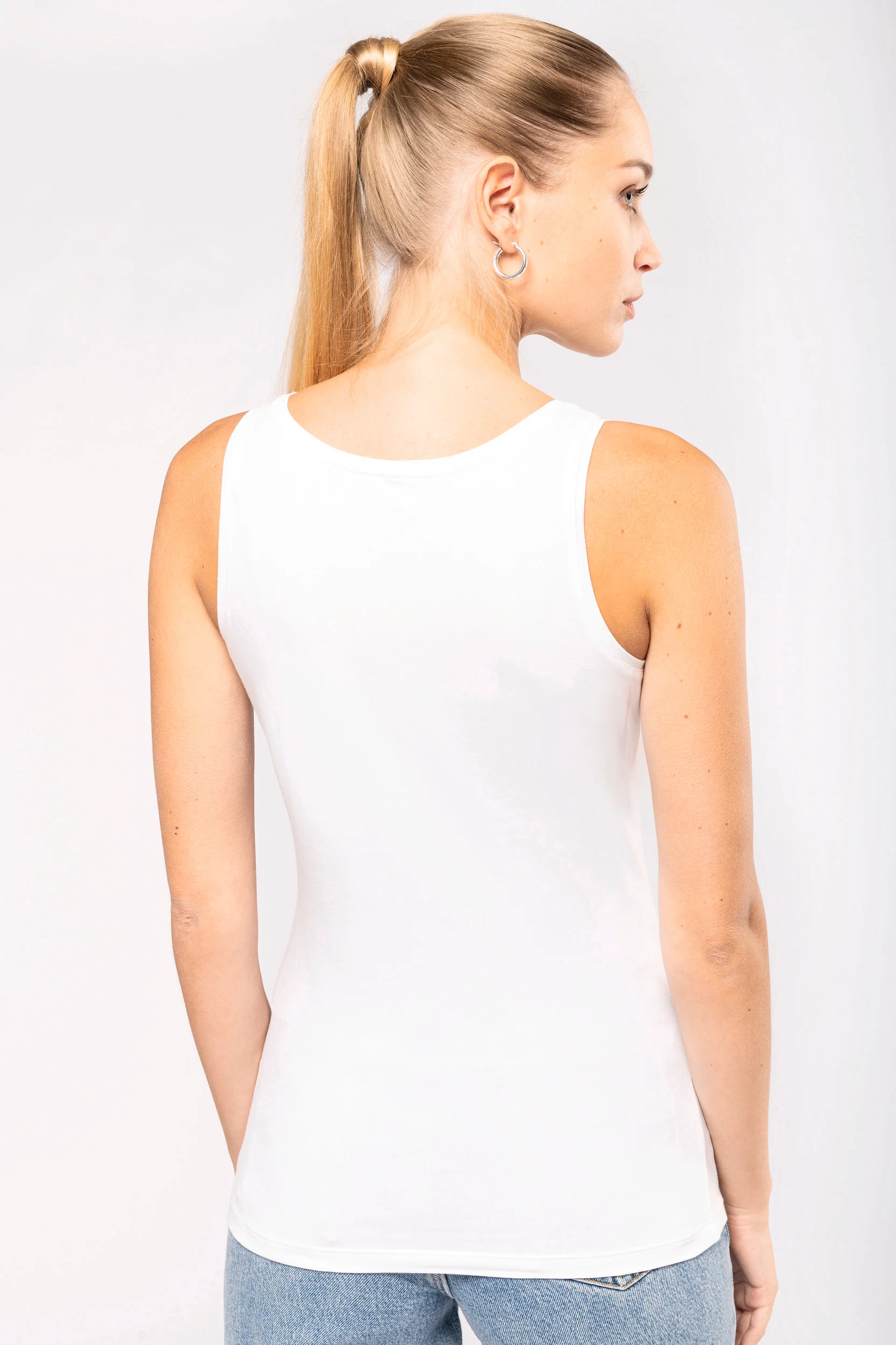 95% Cotone / 5% Elastan. Vestibilità femminile alla moda. Tessuto in soffice Jersey elasticizzato. Scollo ampio con nastrino. Girocollo e giromanica rilegati. Cuciture a doppio ago a fondo capo. Certificato STANDARD 100 by OEKO-TEX®N° CQ1007/7, IFTH.
