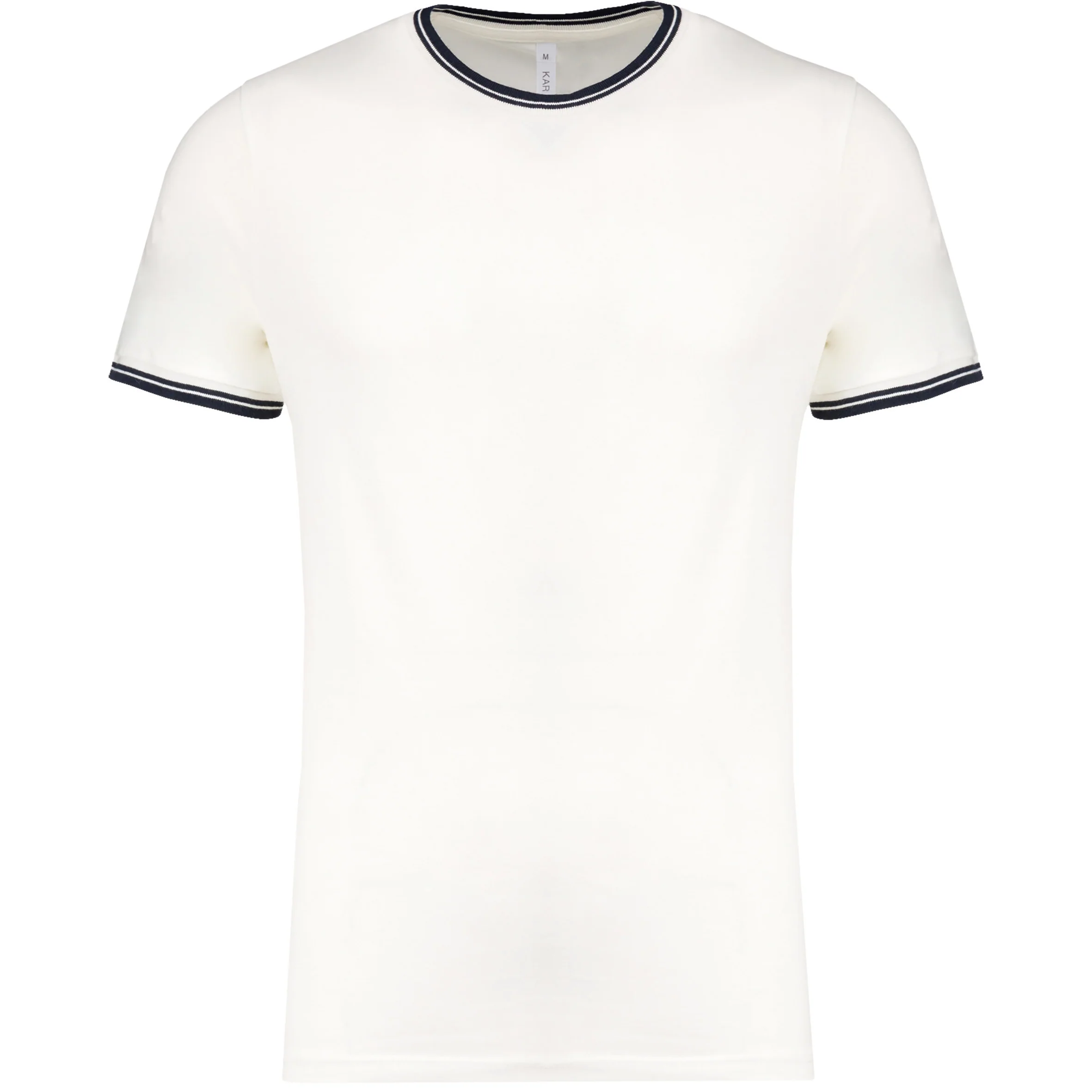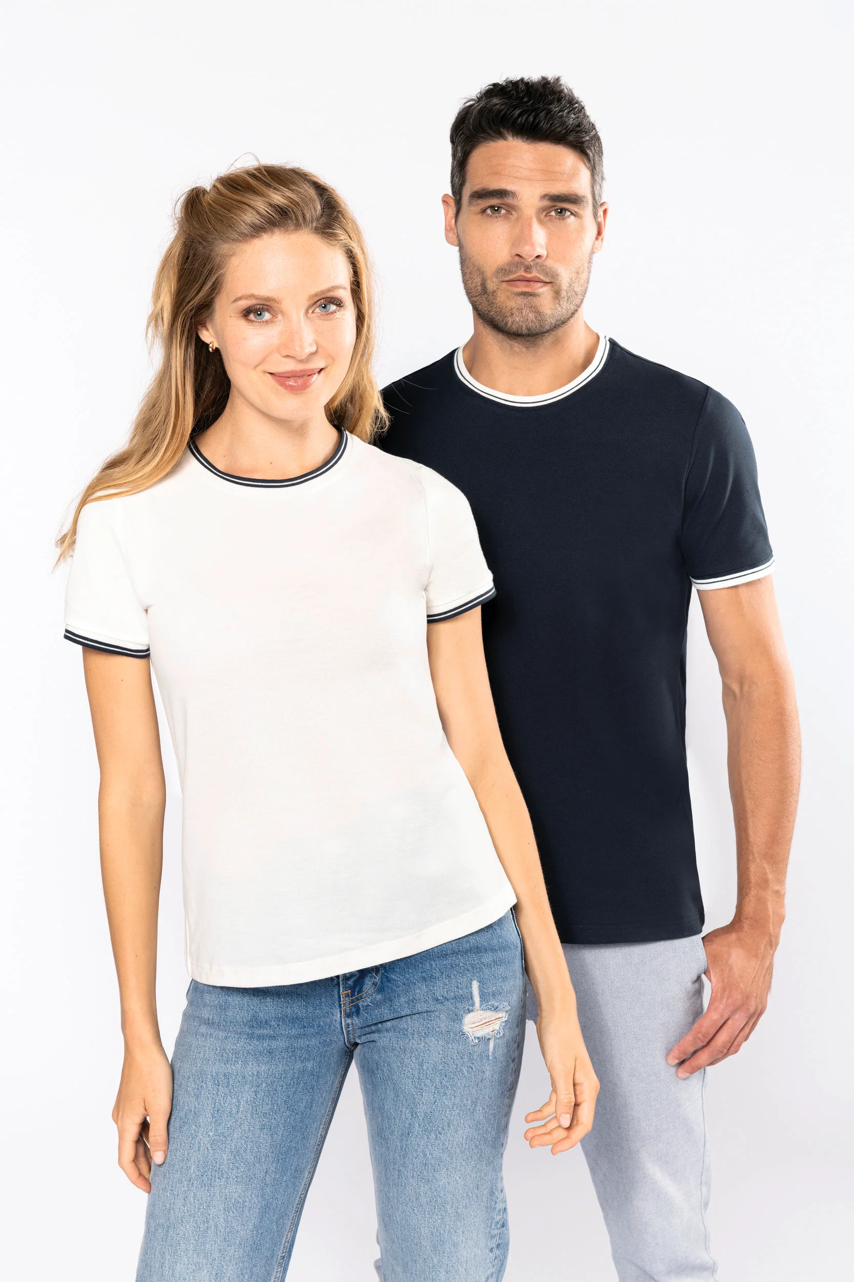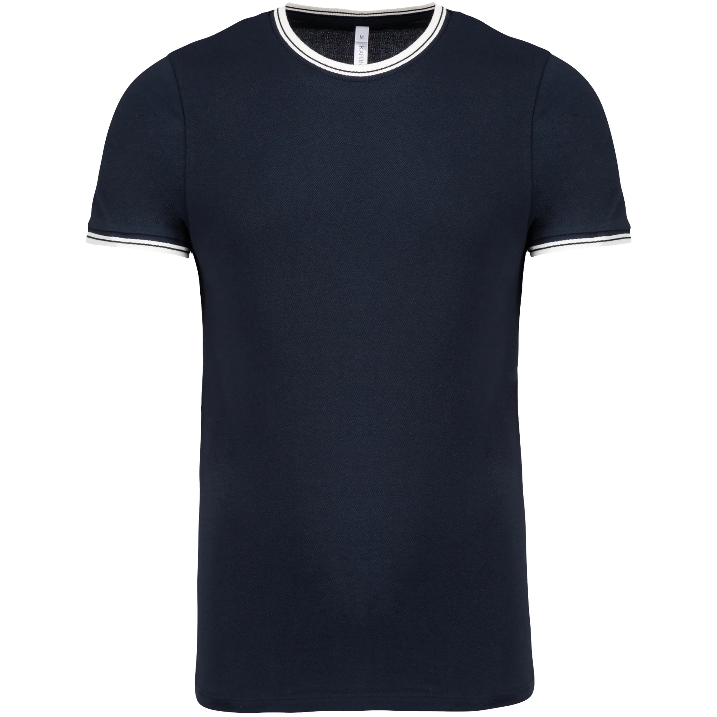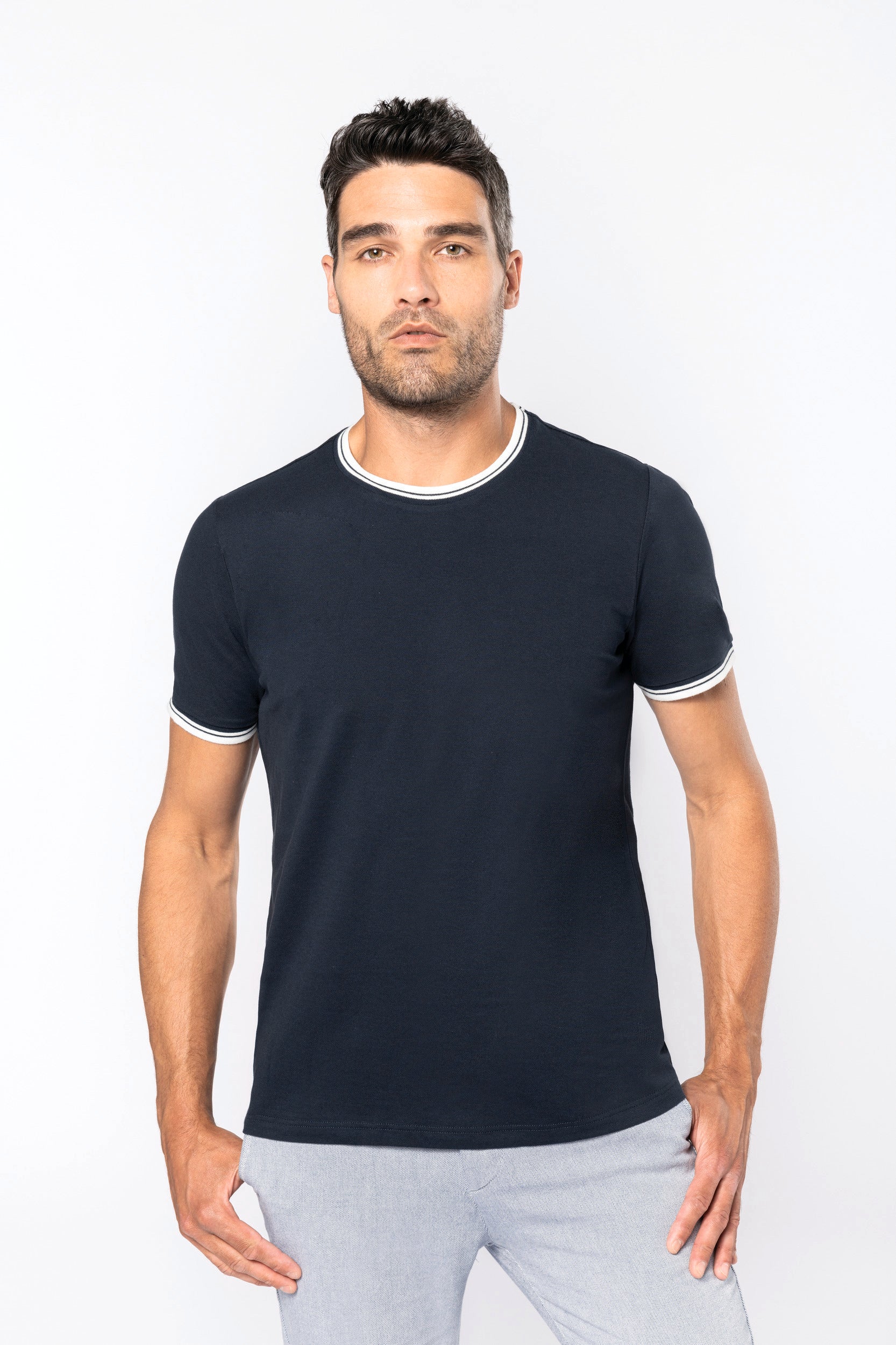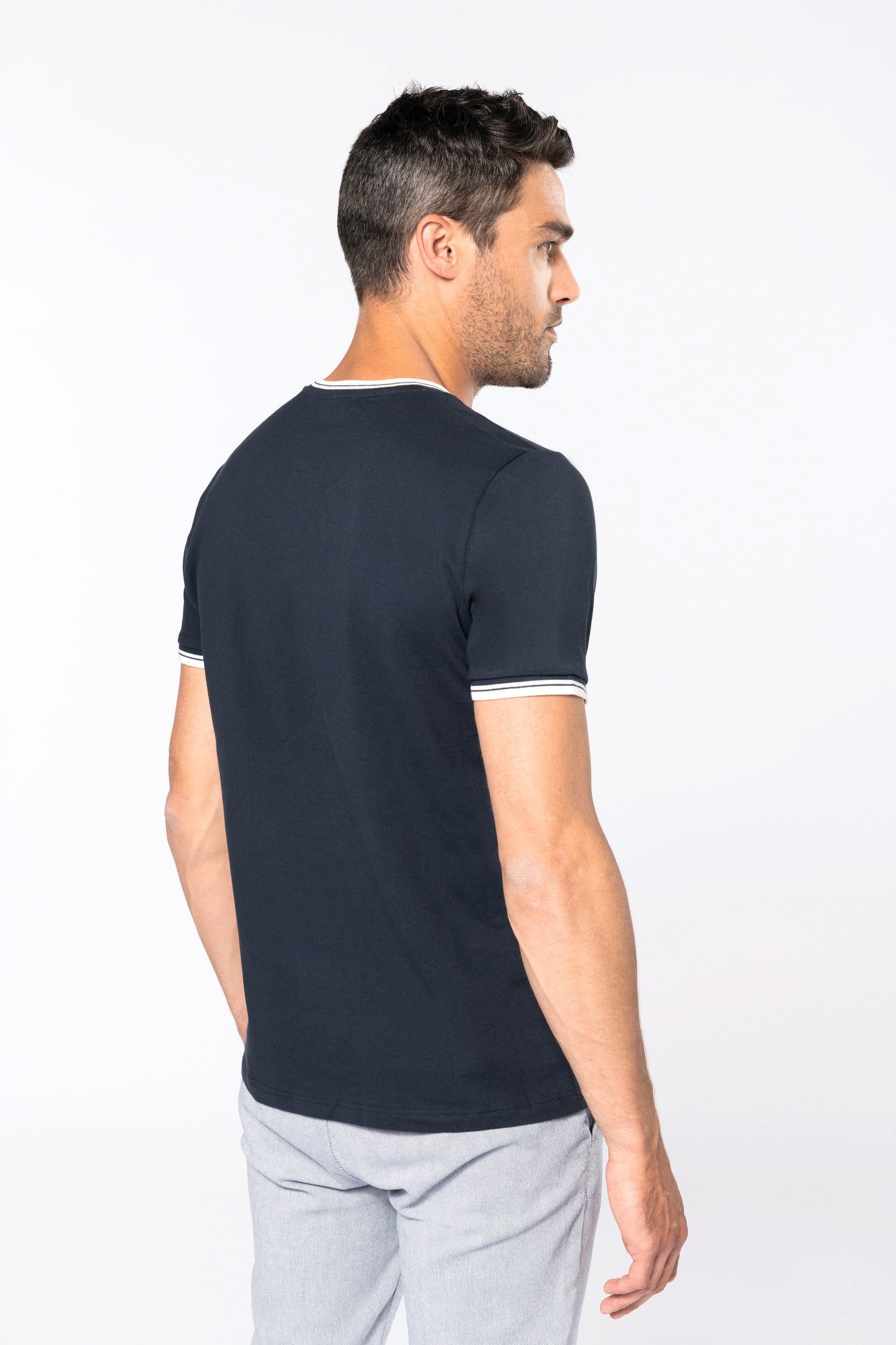 100% cotone pettinato piqué. Collo e fondo manica a costine con righe a contrasto. Nastrino di rinforzo sul collo. Finitura a doppia impuntura a fondo capo. Certificato STANDARD 100 by OEKO-TEX® N° CQ 1007/7, IFTH.