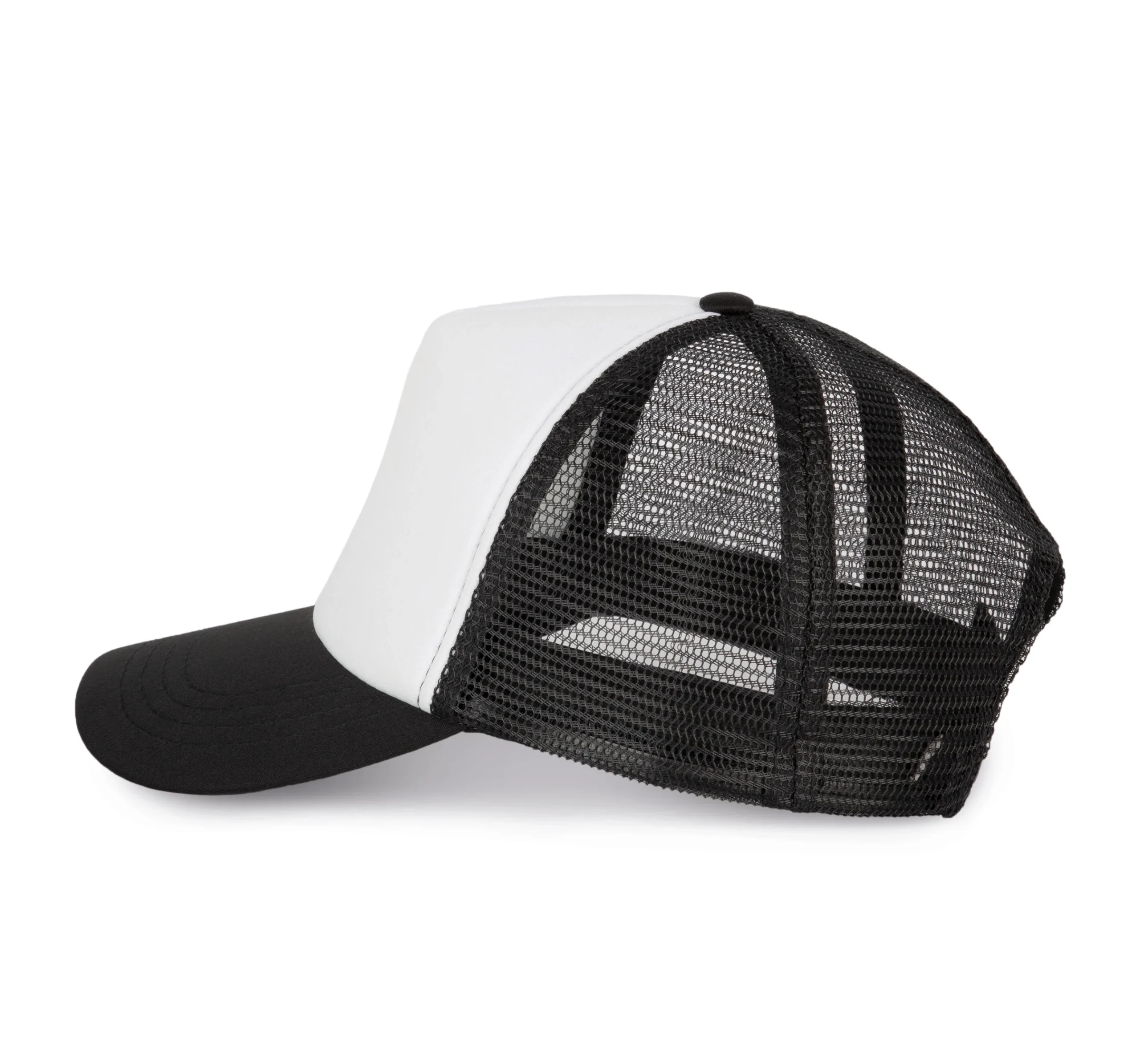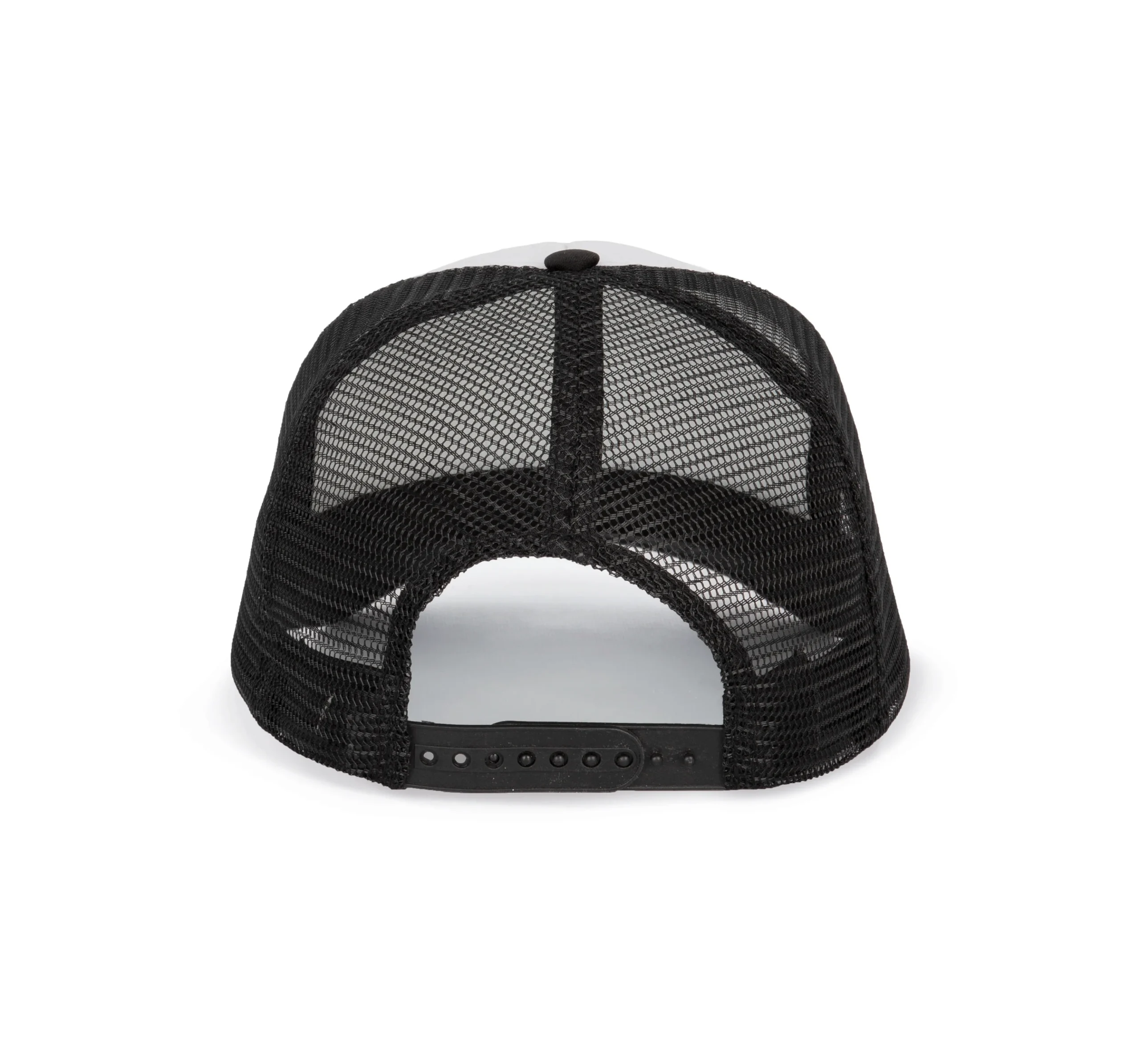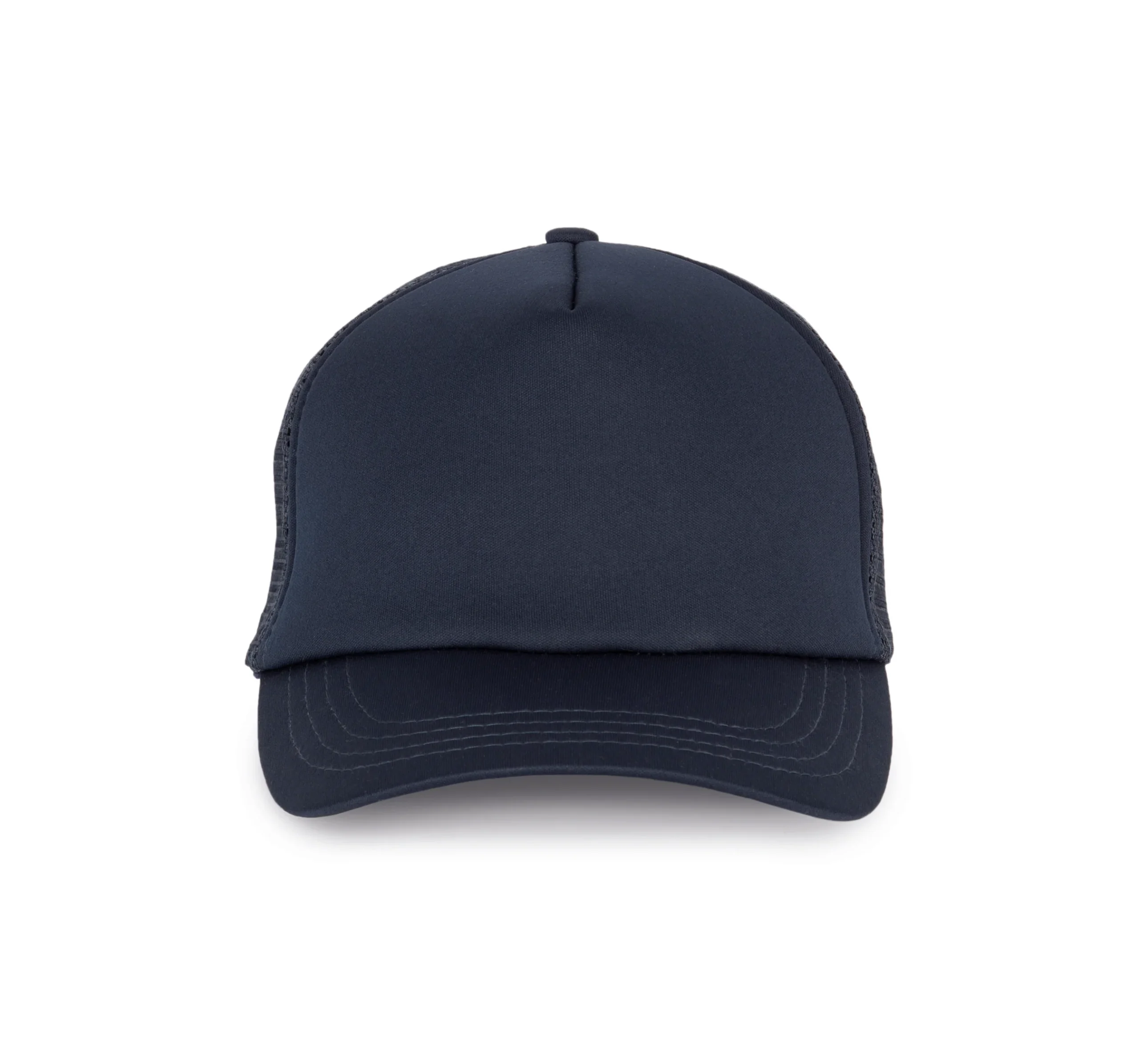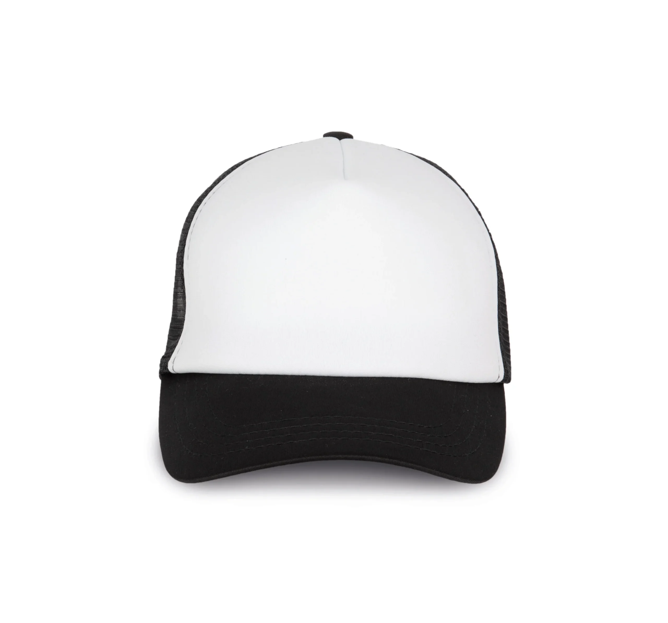 100% Poliestere. Cappellino 5 pannelli laminati con ampio pannello frontale per la personalizzazione. Chiusura in plastica regolabile.