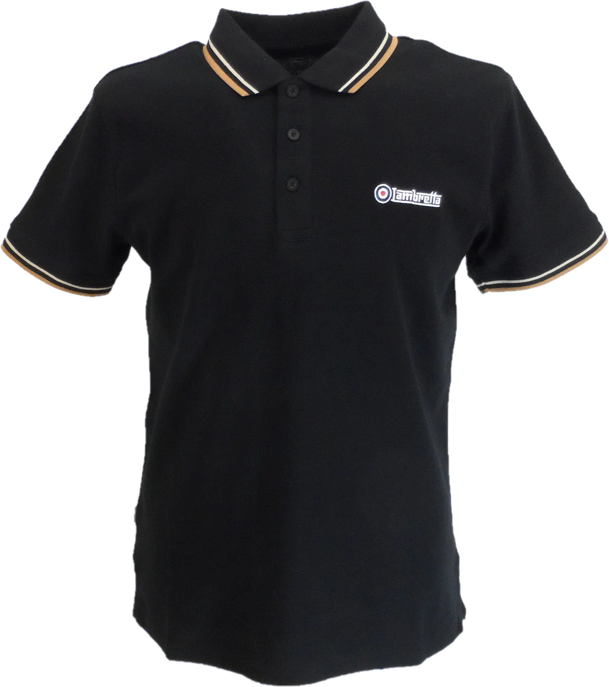 A smart casual tipped polo from Lambretta. A cotton tipped design with an embroidered logo to the chest and target embroidery to the sleeve. Traditional 3 button placket.
