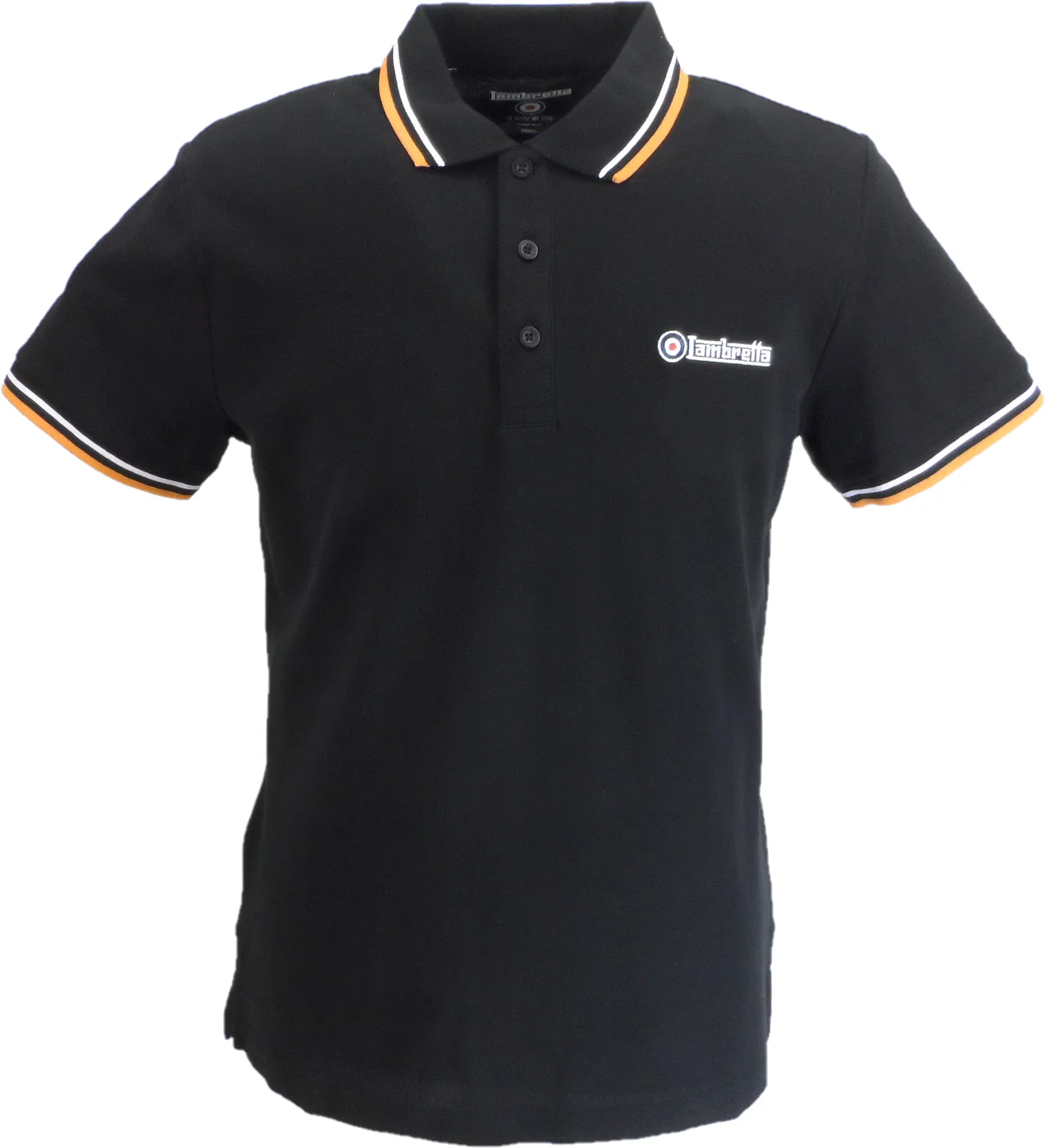 A smart casual tipped polo from Lambretta. A cotton twin tipped design with an embroidered logo to the chest and target embroidery to the sleeve. Traditional 3 button placket.