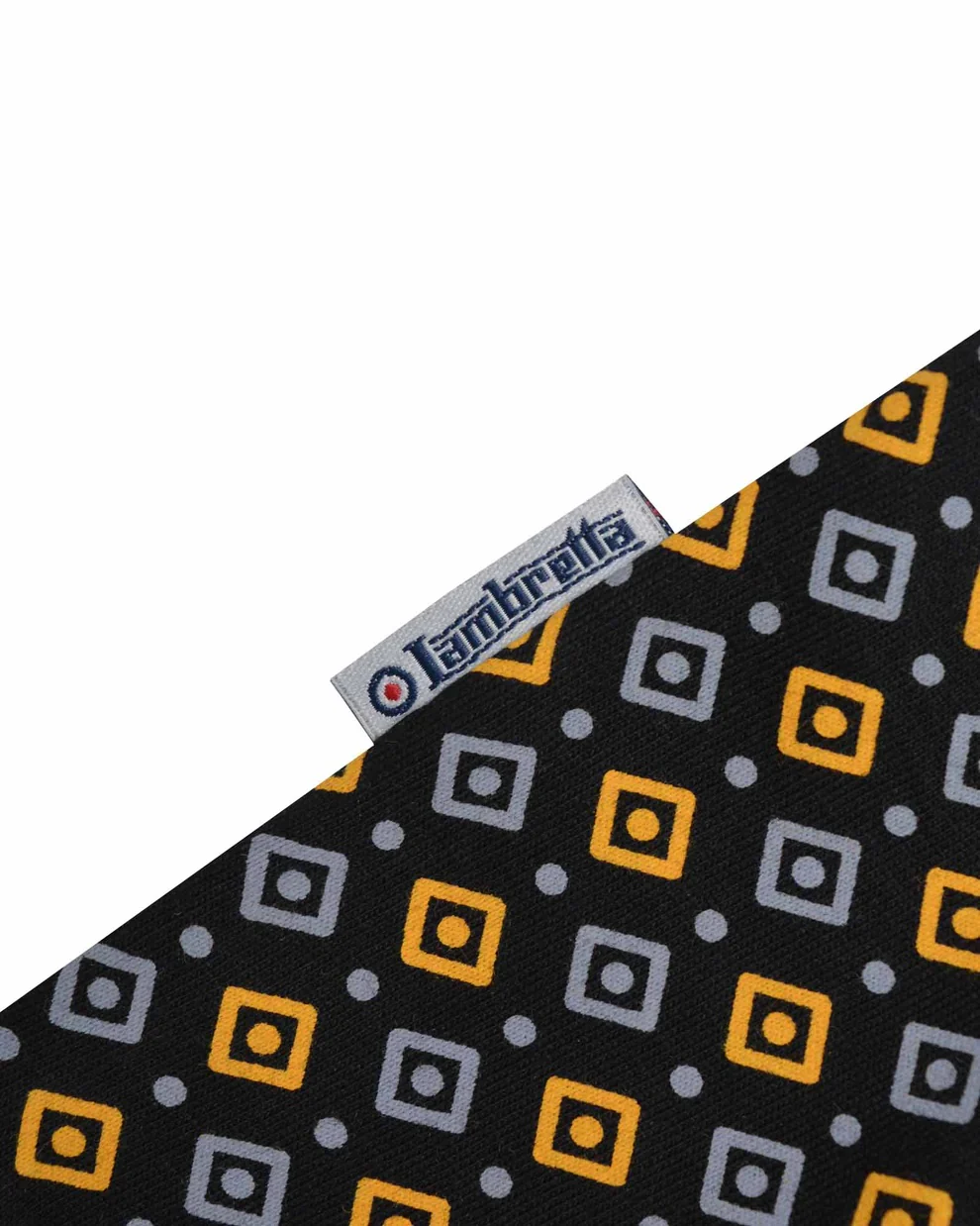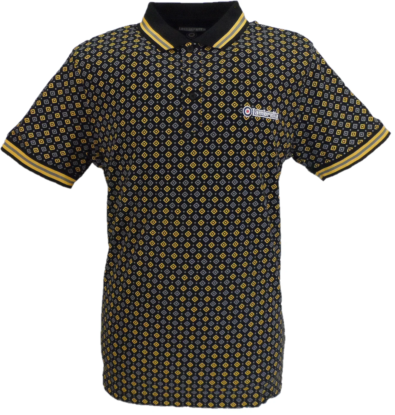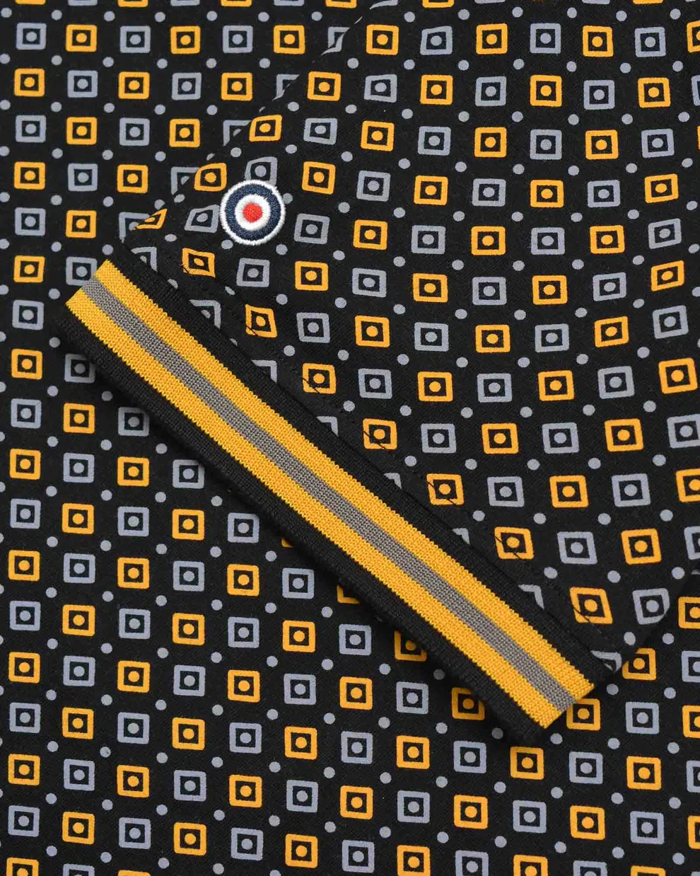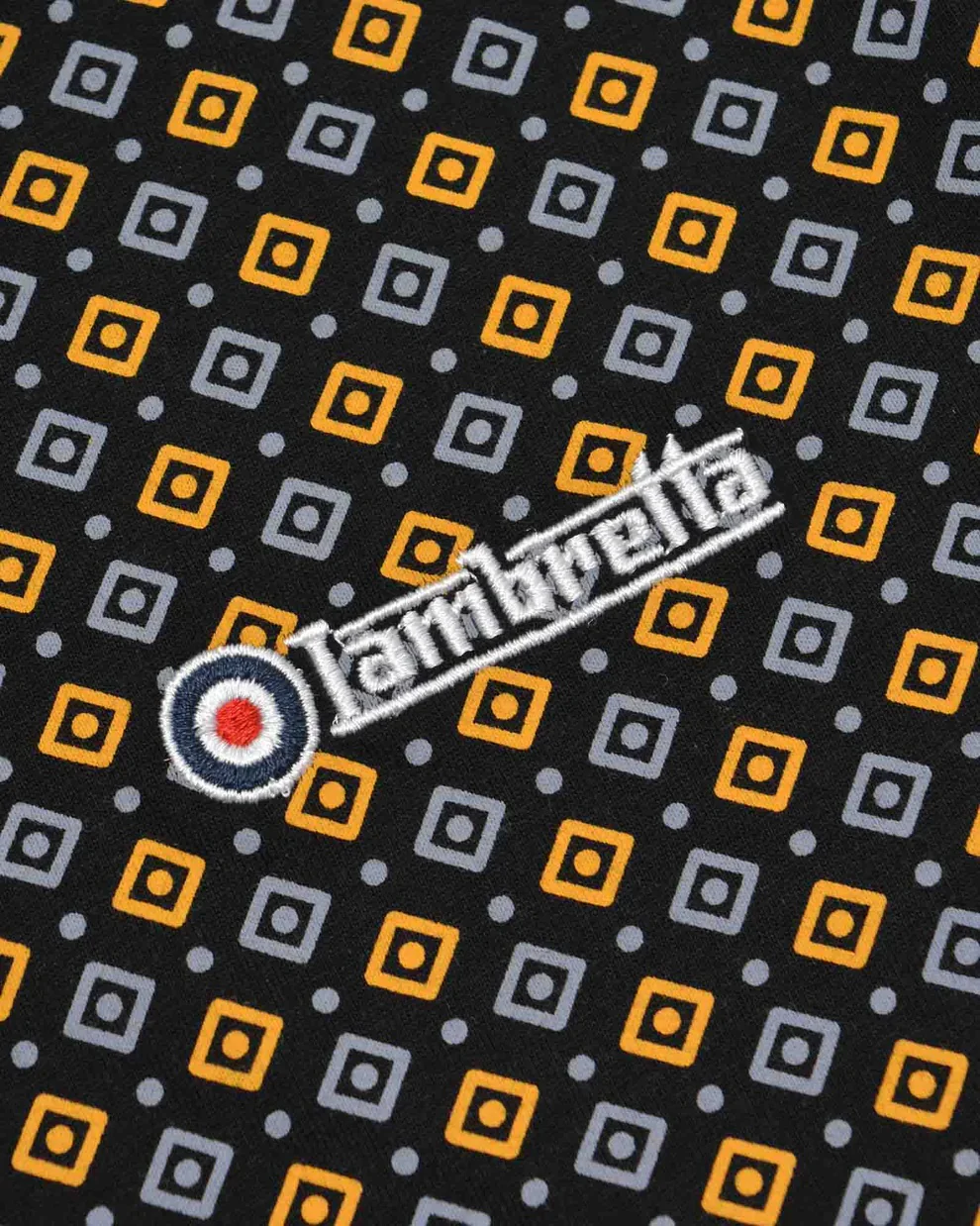 Lambretta all-over Geo print Tipped Collar Polo. Featuring chambray back-neck with logo/target/size printed. Embroidered block Lambretta logo with a target to the chest.