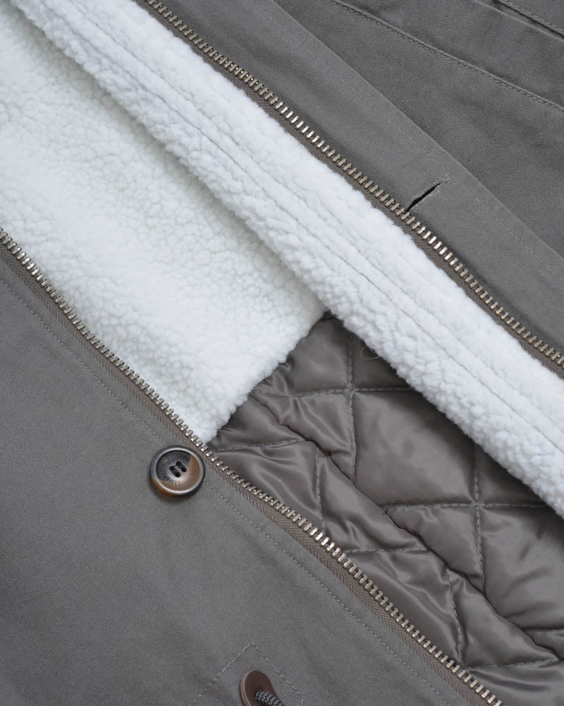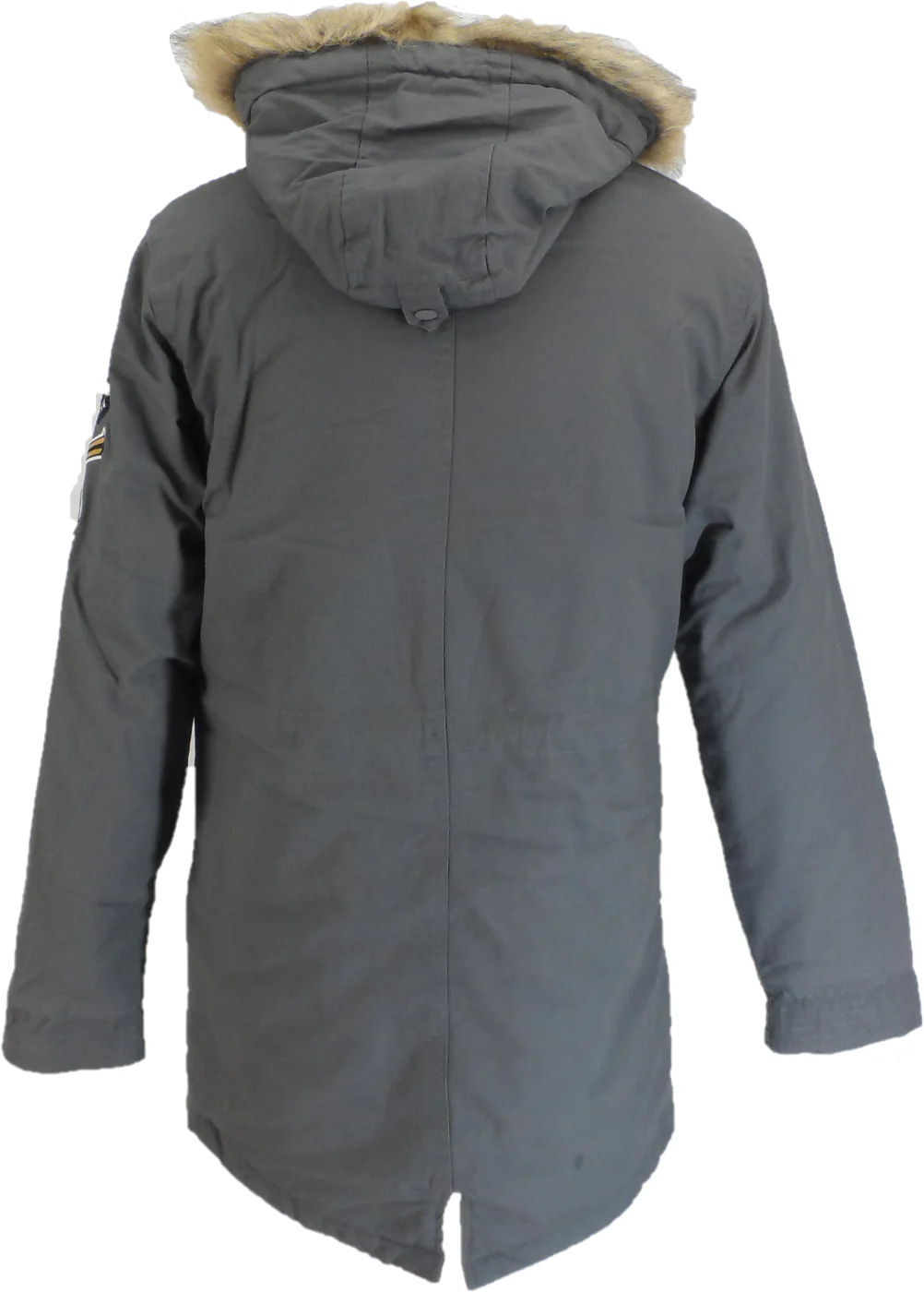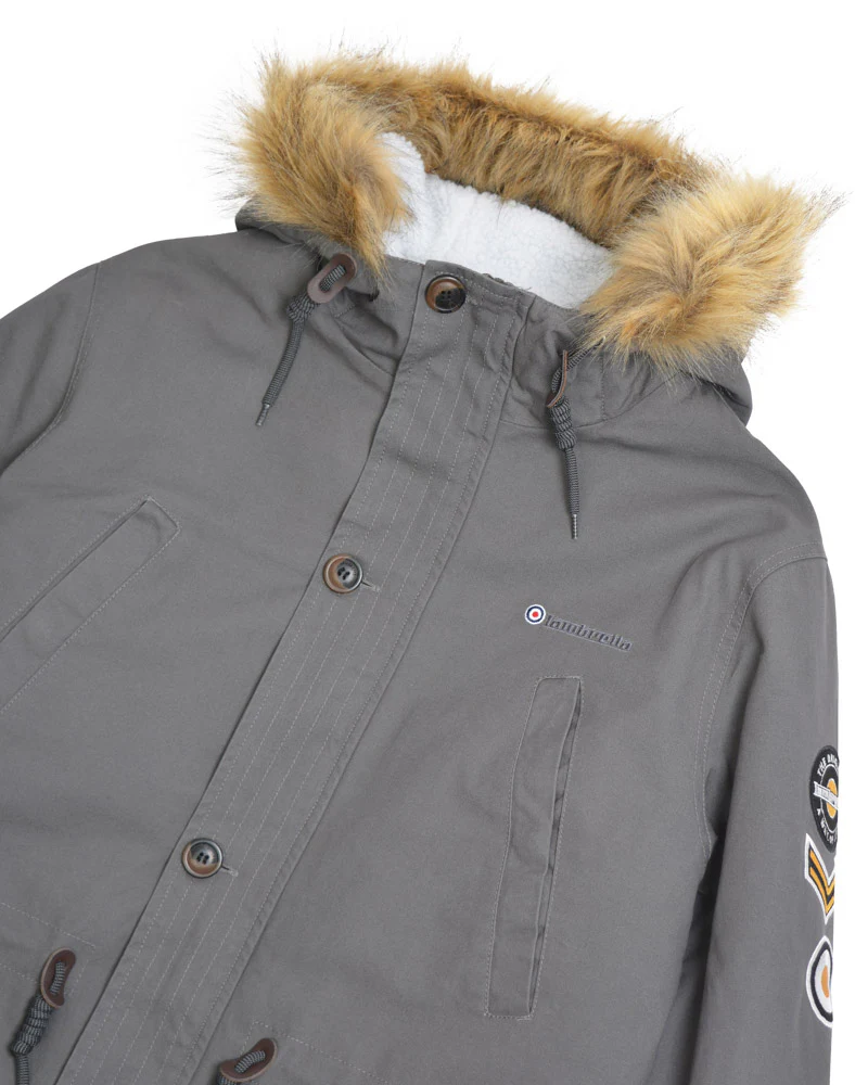 A 4 pocket design with 2 at the waist and 2 at the chest all Sleeve badges are present on this model with the addition of an embroidered logo to the chest and a woven label to the bottom right-hand pocket, a drawstring is also fitted to the waist area. Zip fastening with a button over flap. A great looking winter parka