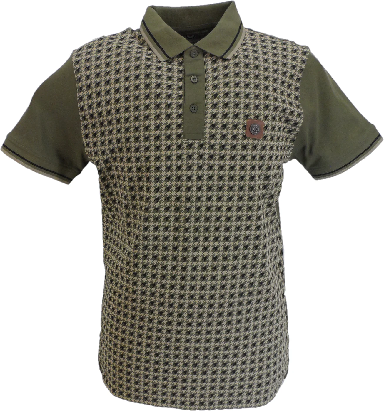 Lambretta Mens Houndstooth print Front with Plain Back Tipped Collar Polo. It features a chambray back-neck with a printed logo/target/size.Finished with leather Look metal target to the chest.