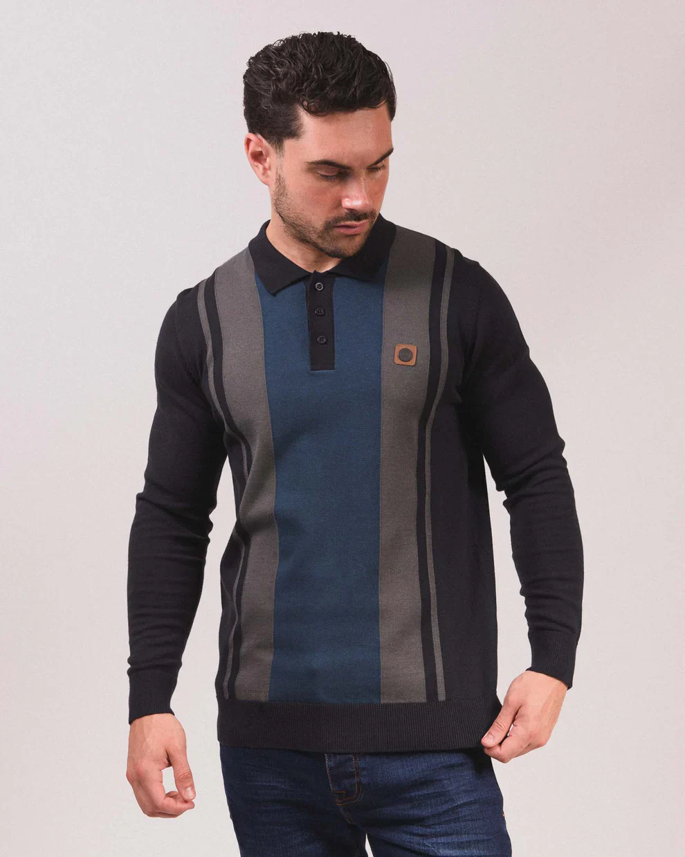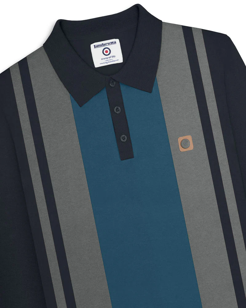 This Lambretta long-sleeved knitted polo features a stylish stripe panel on the front, complemented by a leatherette badge for a touch of distinction. Designed with a 3-button fastening, ribbed cuffs, and hem, it ensures a comfortable and tailored fit. A woven label on the side seam adds a subtle branded detail, making this polo an essential piece for smart casual wardrobes.