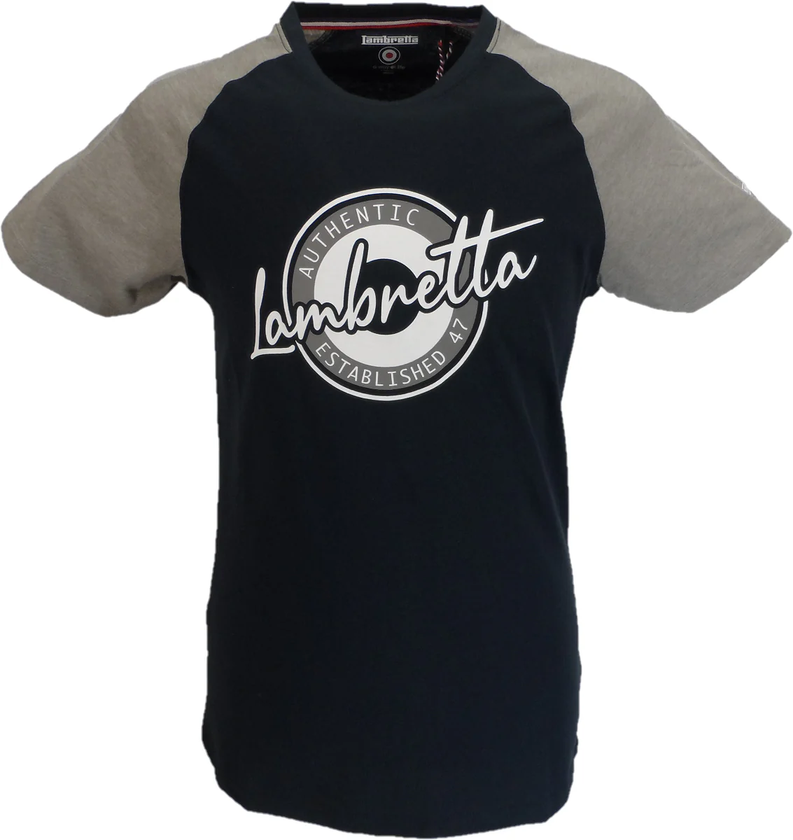Lambretta Mens Authentic Raglan T Shirt With Retro Lambretta script chest print and Contrast raglan sleeves also with Embroidered branding to sleeve Finished with Branded woven label to side seam.
