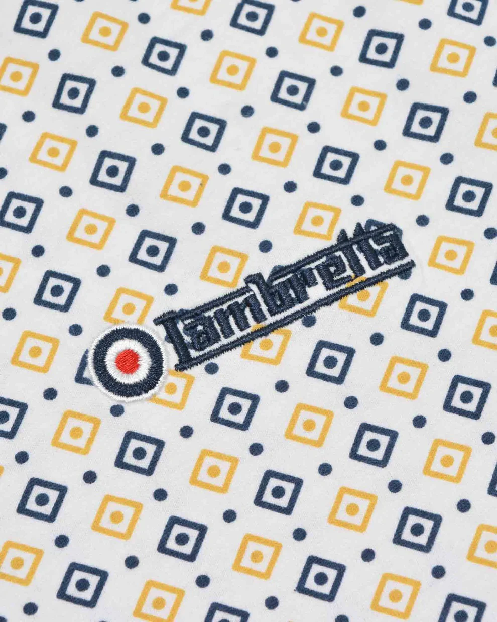 Lambretta all-over Geo print Tipped Collar Polo. Featuring chambray back-neck with logo/target/size printed. Embroidered block Lambretta logo with a target to the chest.