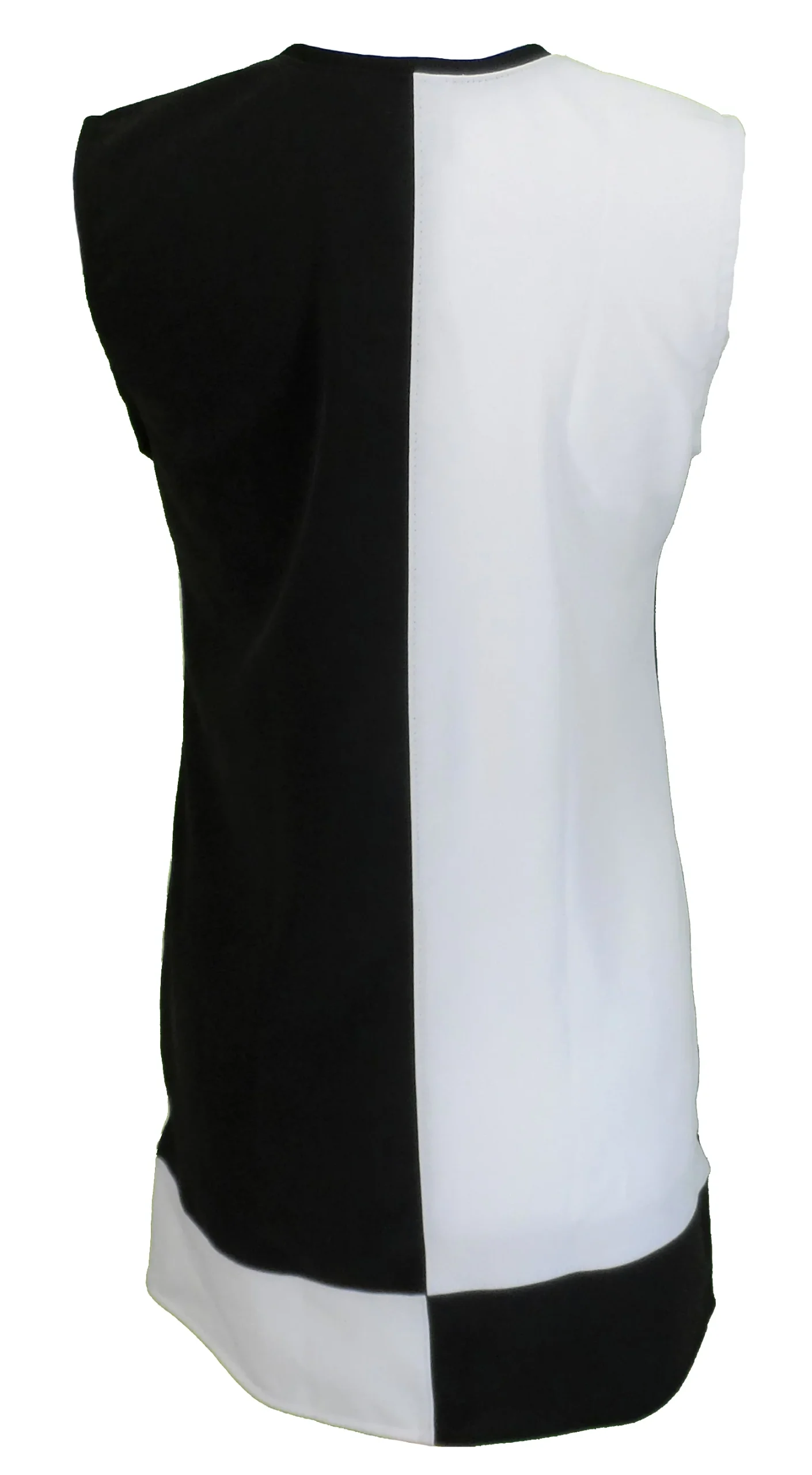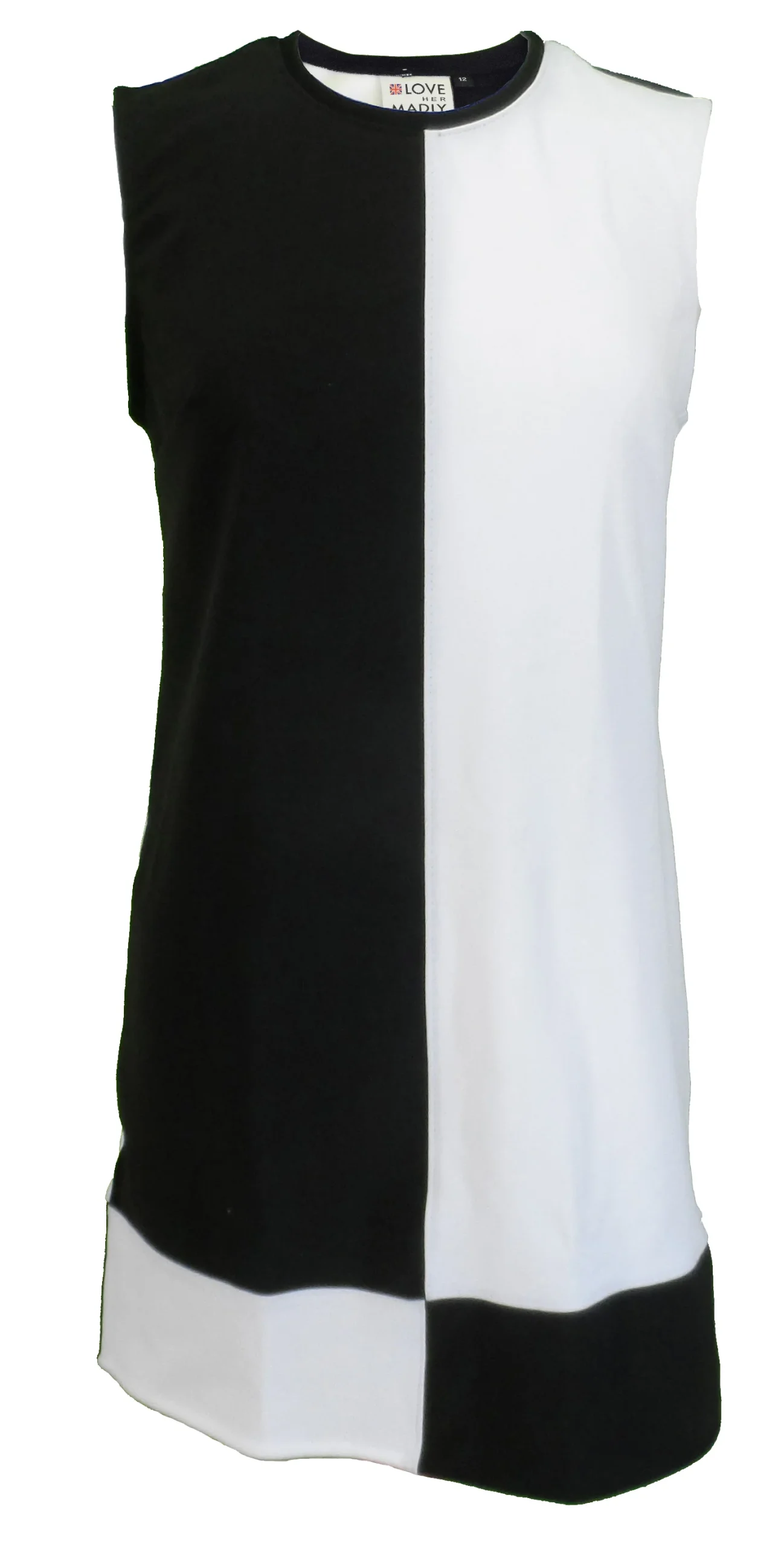 Two-tone classic mod dress. Matching pattern on front and back. Soft, stretchy mixed blend fabric, in pure black and white. This stand out dress starred in the hit West End musical, All Or Nothing, the story of the Small Faces.