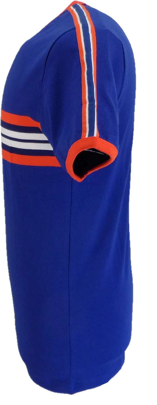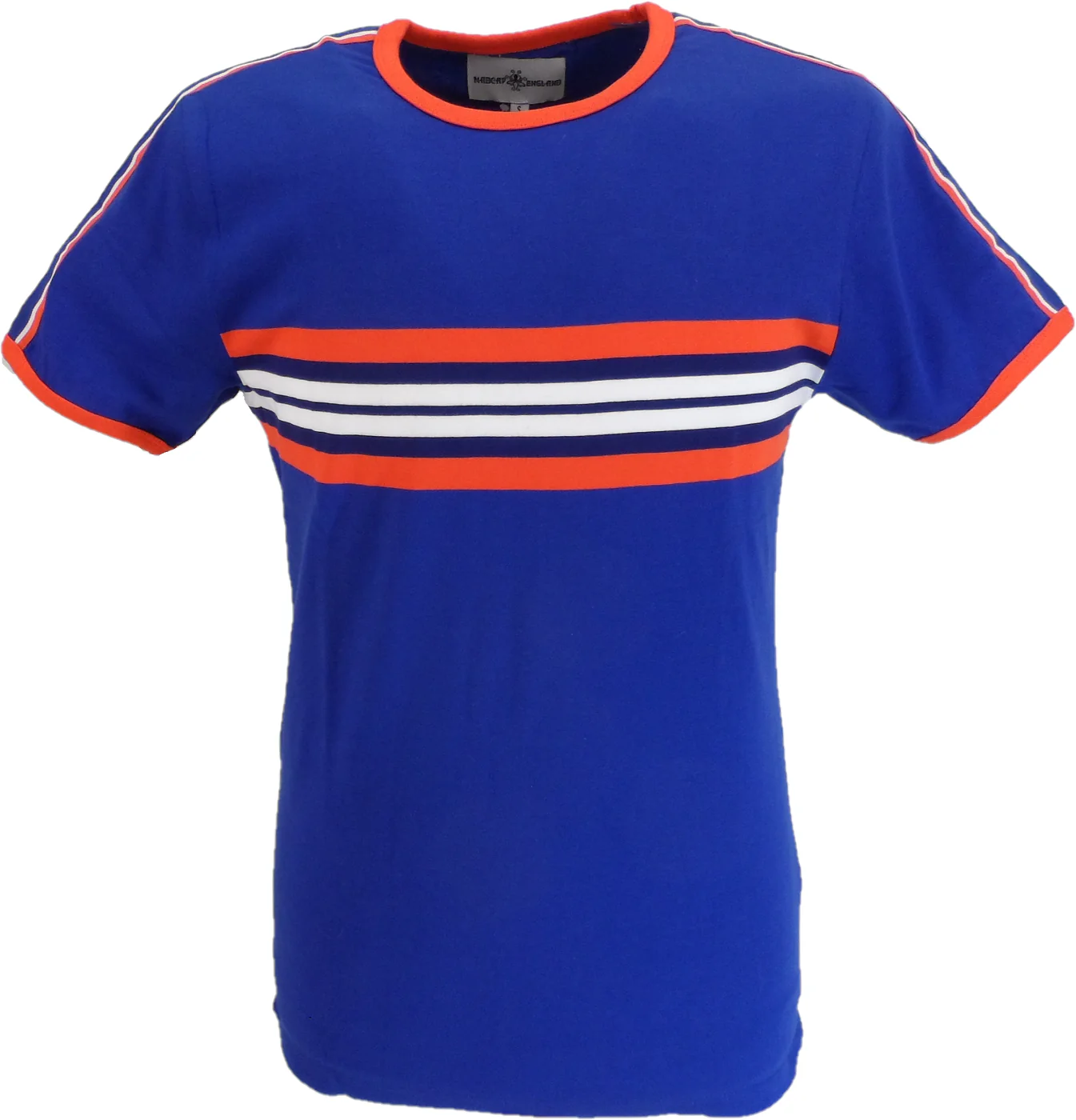 Madcap England Cassette men’s retro chest stripe tee in Sodaalite Blue Stripe tape detail to shoulders and sleeves. Contrast ringer trims.Madcap England Octopus embroidery to the sleeve.