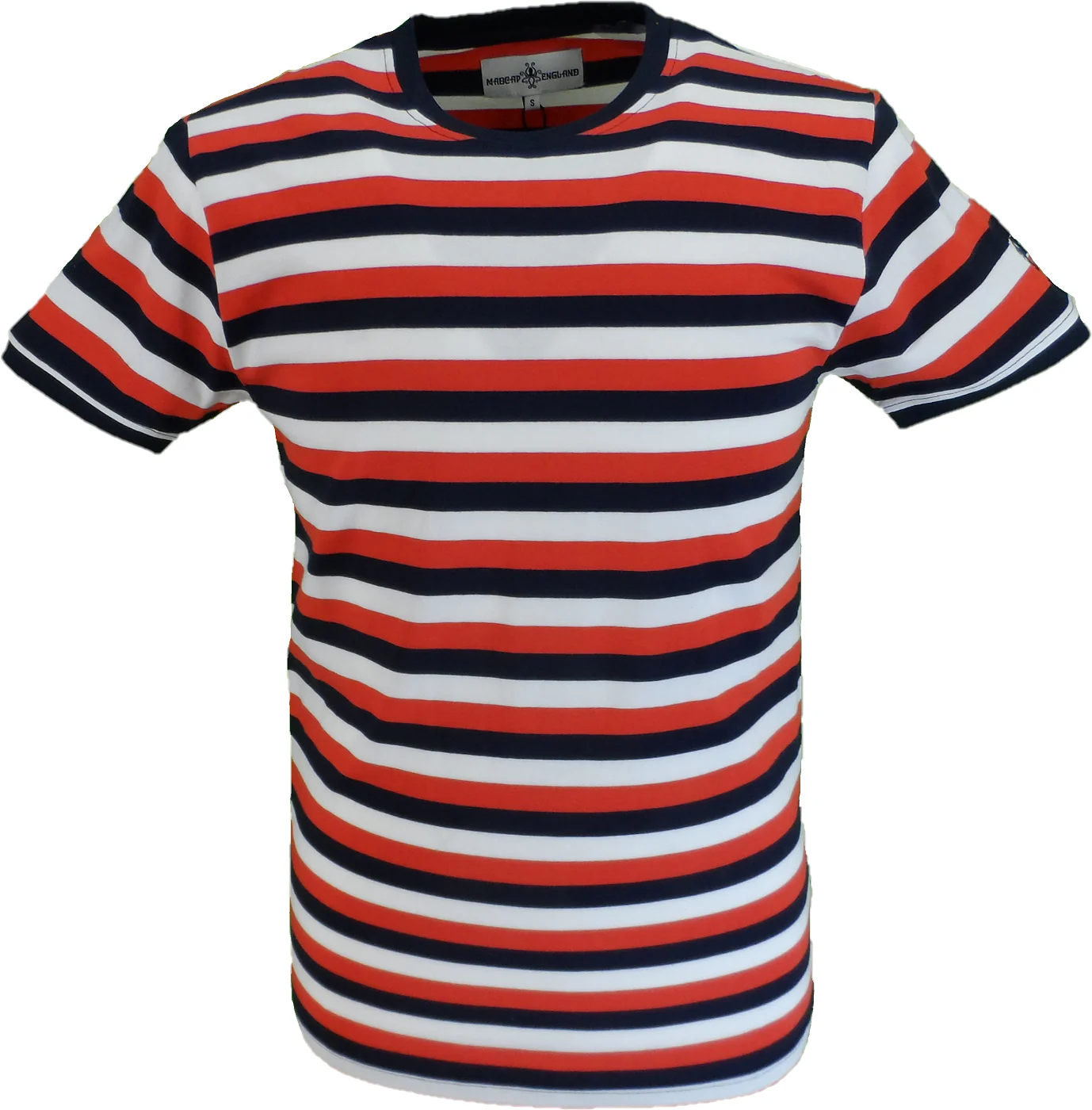 Madcap England Cassette Beatwave Tri-stripe T-shirt in Red/White/Navy.Crew neck tee.with1.5cm stripes.and Octopus embroidery on the left sleeve with sewn-on cuff.and a Retro ringer collar.