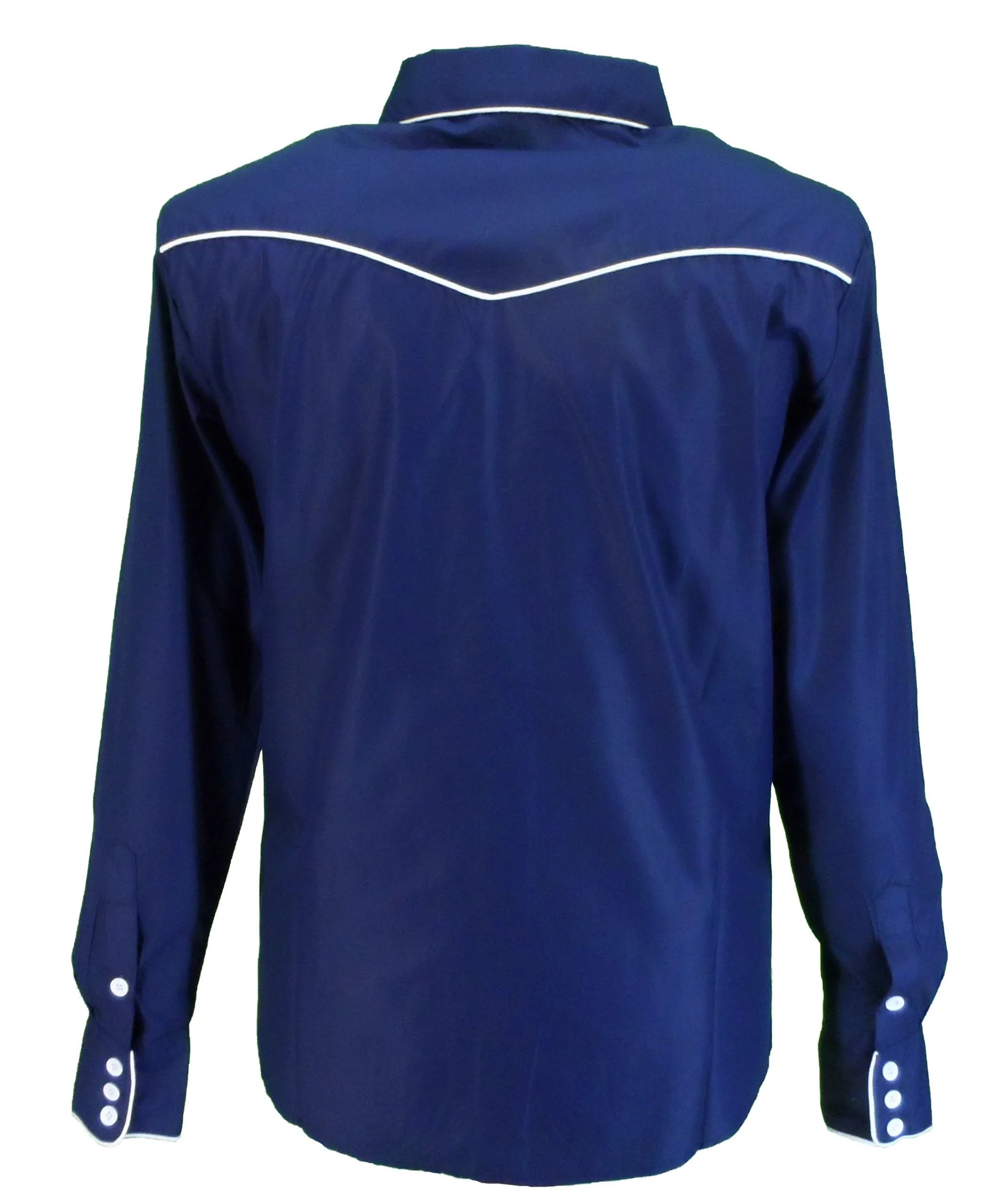Classic cowboy shirts made of Polycotton with Button fastening at the front 4 Button cuff fastening and 2 slanted breast pockets, front back and collar embroidery finished with white piping