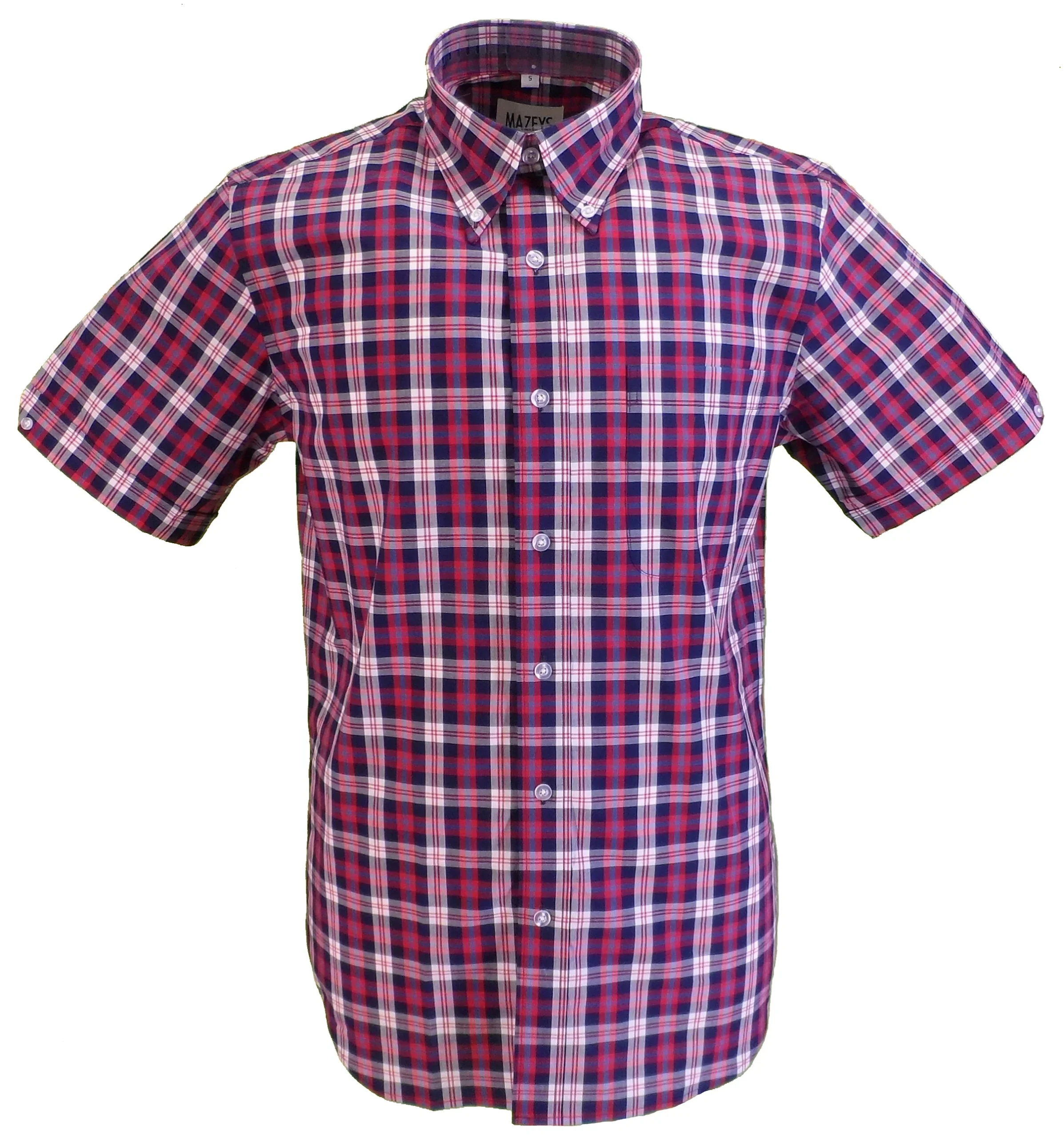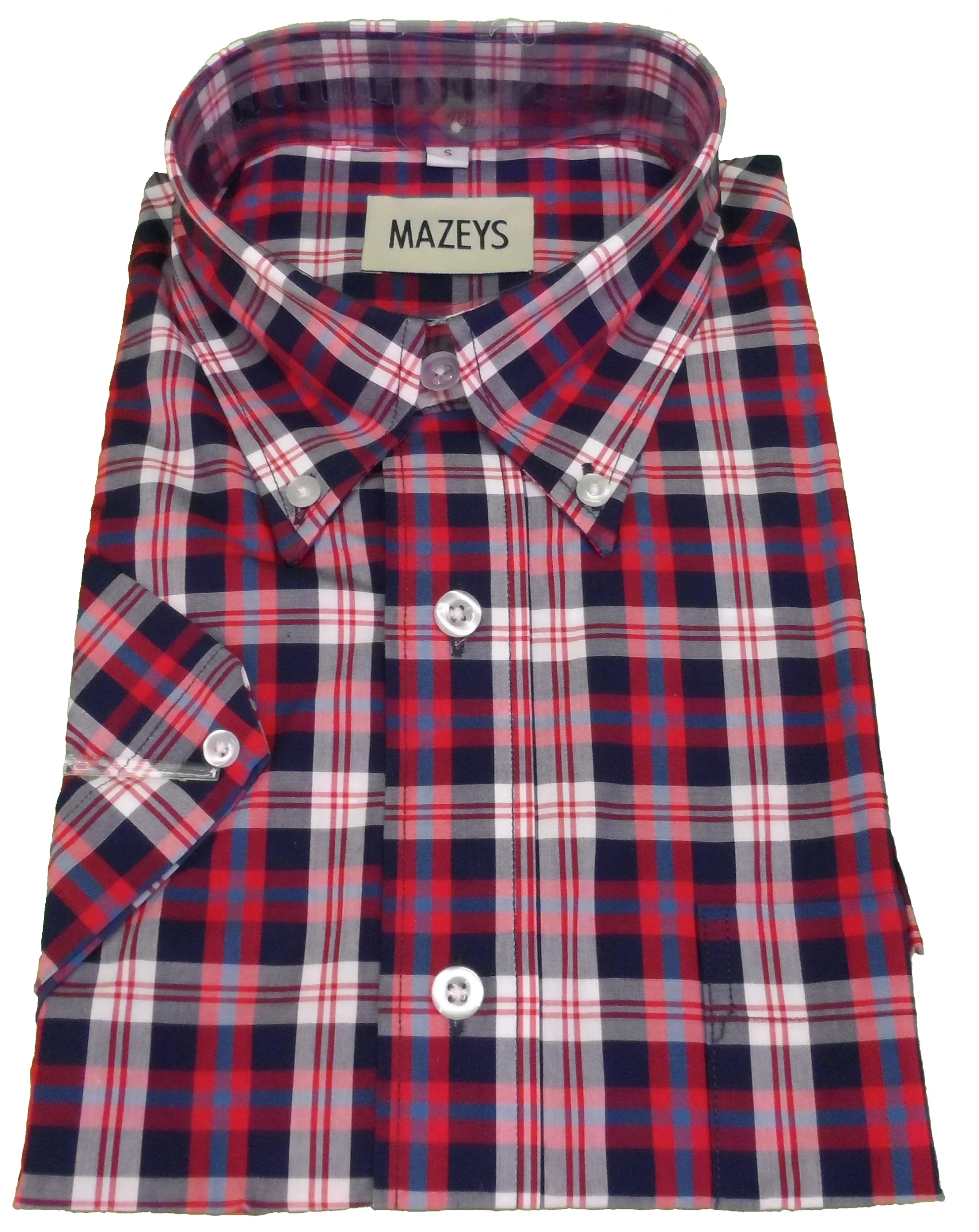 Mazey’s Mens Classic 3 finger Button Down Collar RedWhite/Blue100% Cotton Checked Shirts with Half Back Pleat and loop with 2 buttons finishing on the sleeves Approximate sizing as follows: