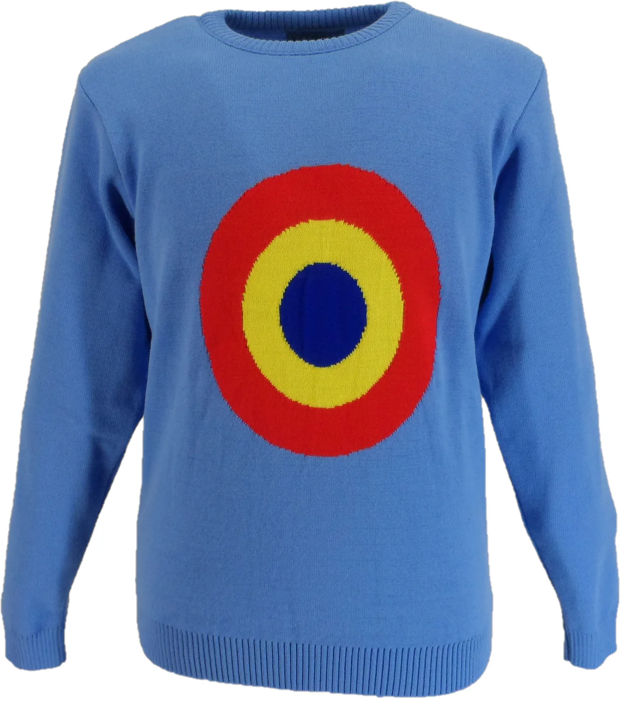 Inspired by the Target knitwear worn by Keith Moon, this is a fine gauge Crew neck, with a knitted in Target. Also worn by The Jam drummer, Rick Buckler on the single cover for News Of The World.