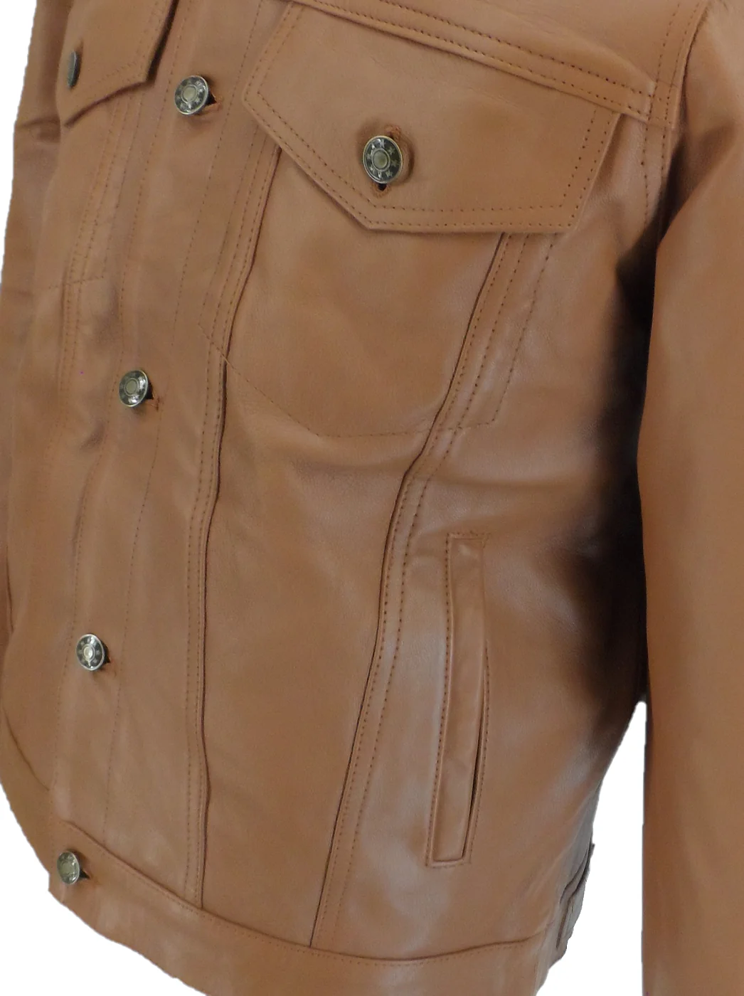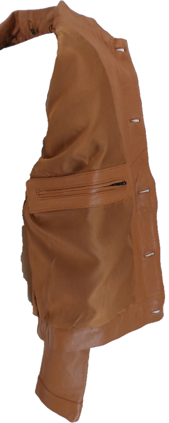 This Classic retro-inspired Leather jacket is made from very soft Lamb Leather made in the classic western style, slim-fitting, tapered fit, with adjustable waist tabs, two chest pockets and two side pockets, with metal buttons. zipped 2 Inside Pockets with Back button adjustment