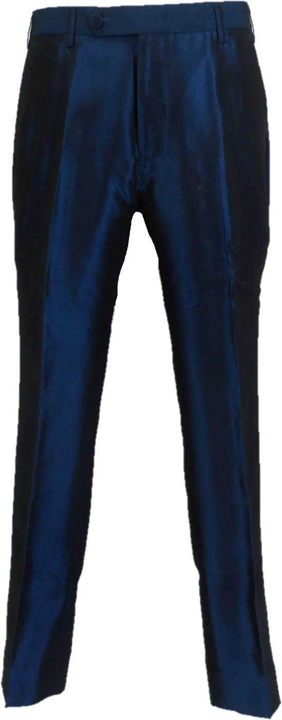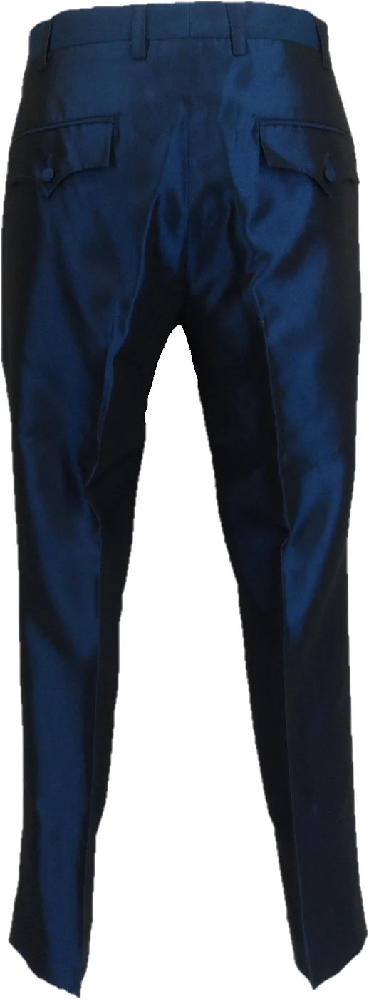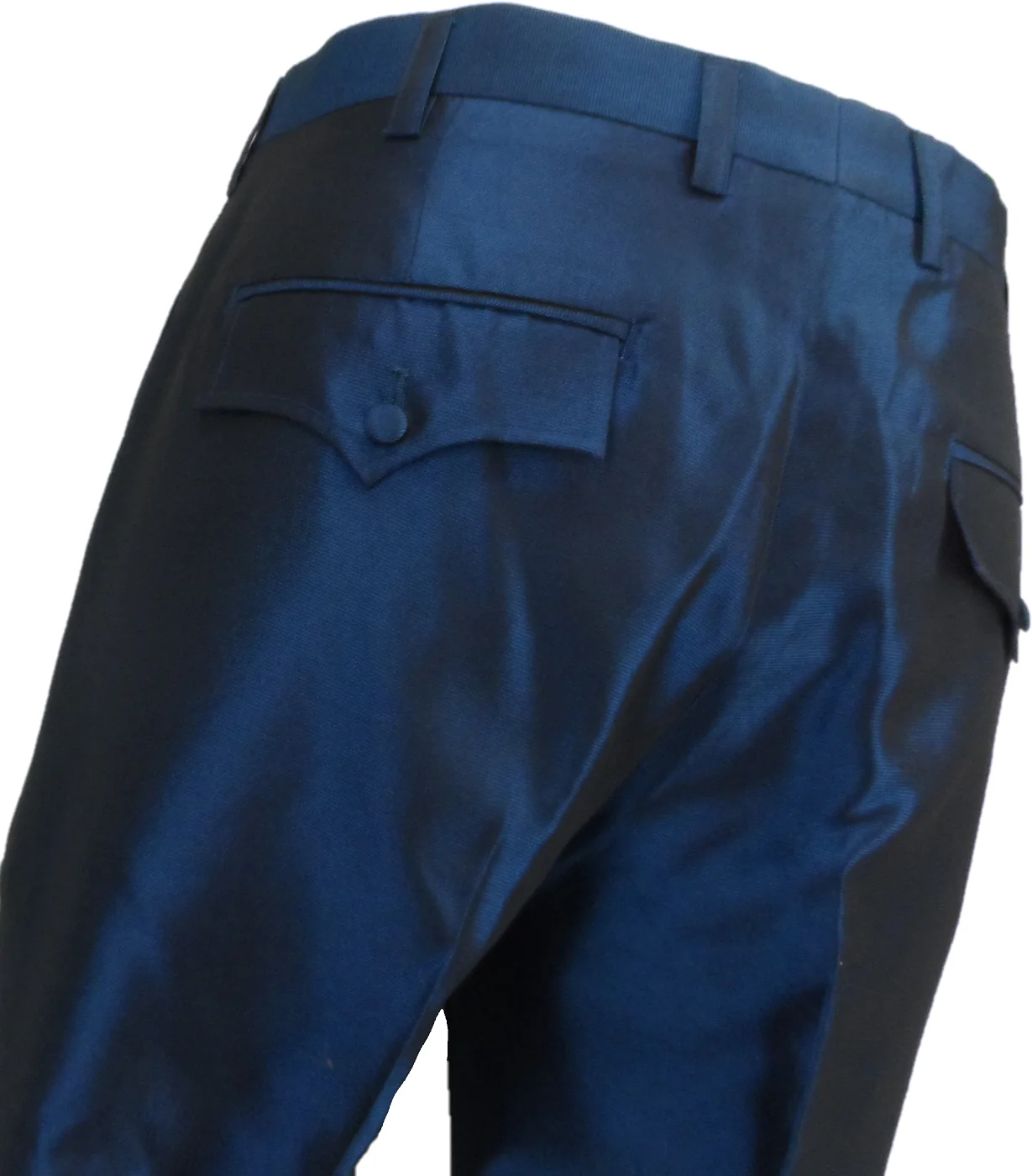 This Tonic Blue with Black Sheen suit features a classic retro design with a fastening of 3 covered buttons, 3 pockets and a top breast pocket, and a 4-button effect cuff. a two-finger width collar, and a paisley lining for added style. The suit is completed with a single vent for comfortable wear.