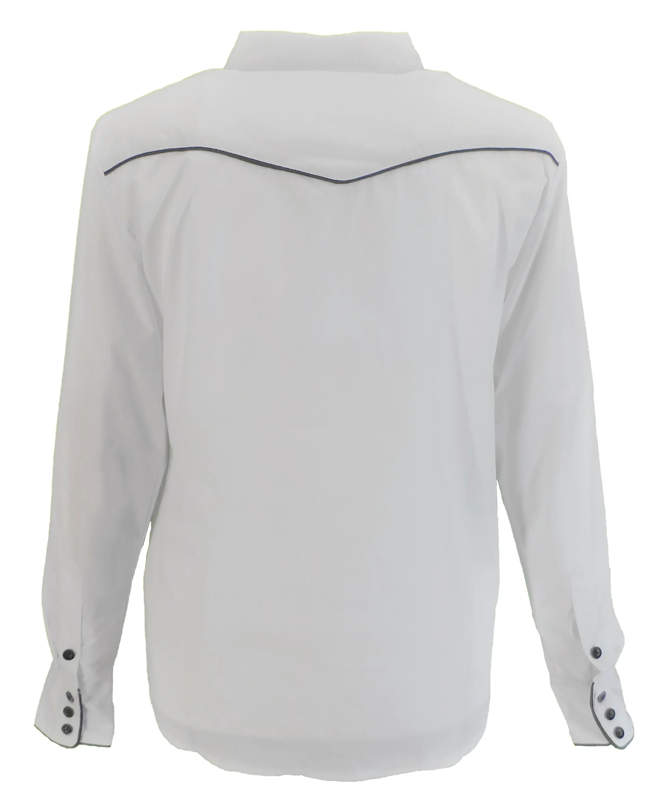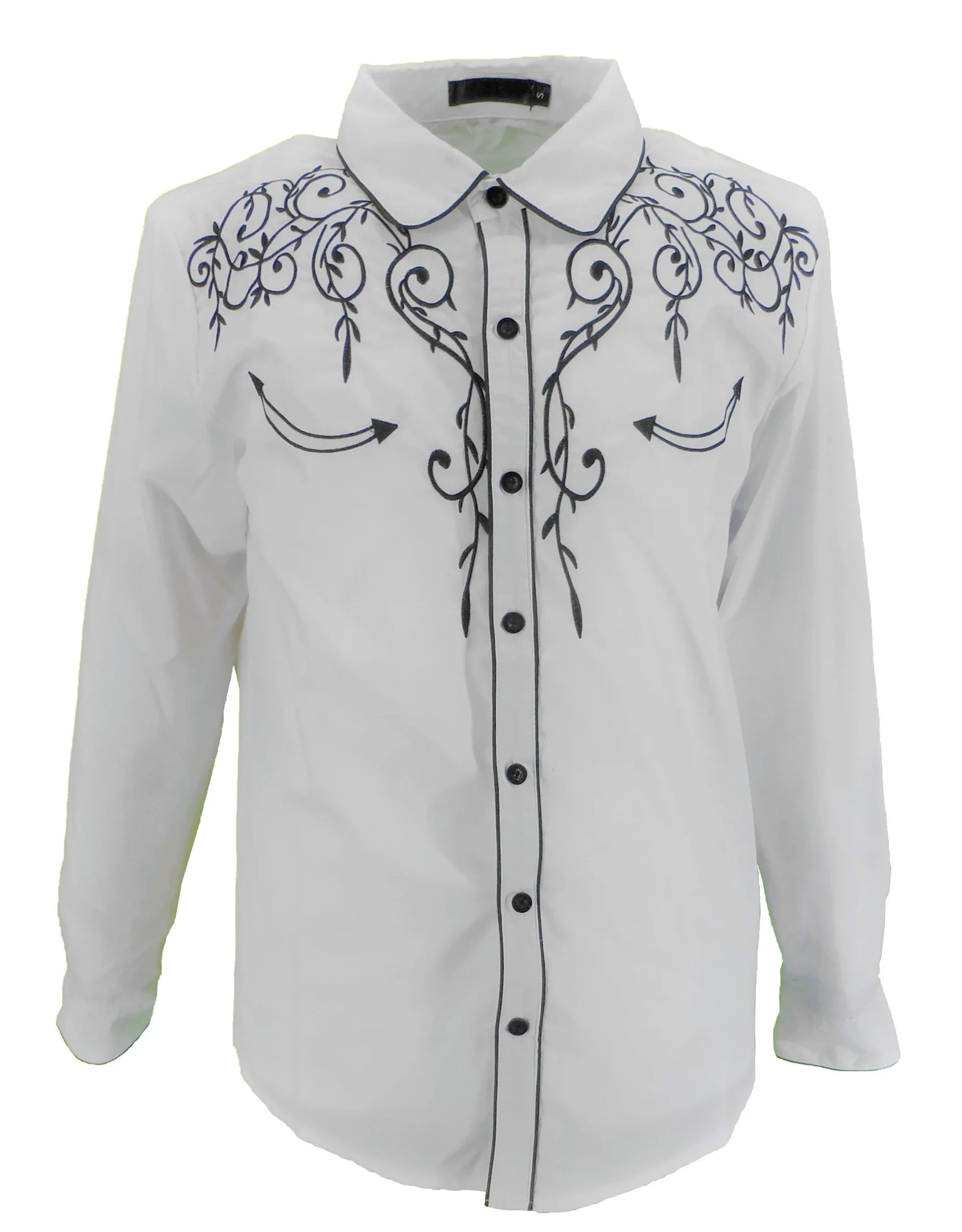 Classic cowboy shirts made of Polycotton with button fastening at the front 4 button cuff fastening and 2 slanted breast pockets, front back and collar embroidery finished with black piping