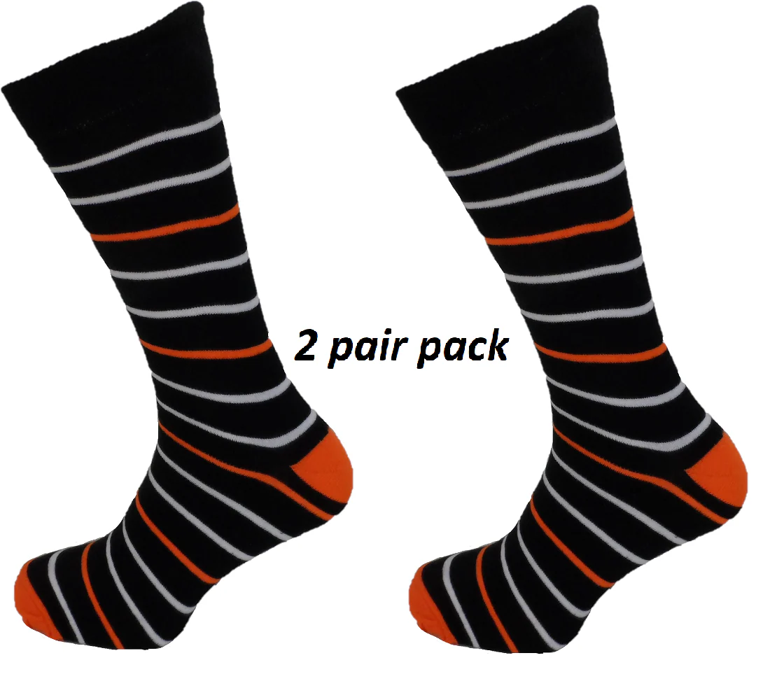Mens 2 Pair Pack Black Orange and White Striped Retro Socks