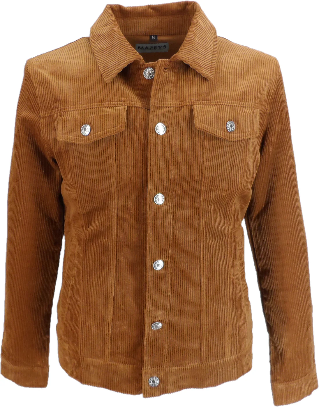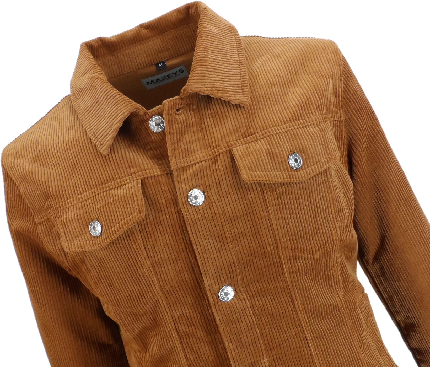 Capture timeless style with this men’s 60s-inspired tan cord western trucker jacket. Featuring a slim, tapered fit and adjustable waist tabs, it delivers a tailored silhouette. Equipped with two chest pockets, two side pockets, and durable metal buttons, this jacket blends vintage charm with practical design.