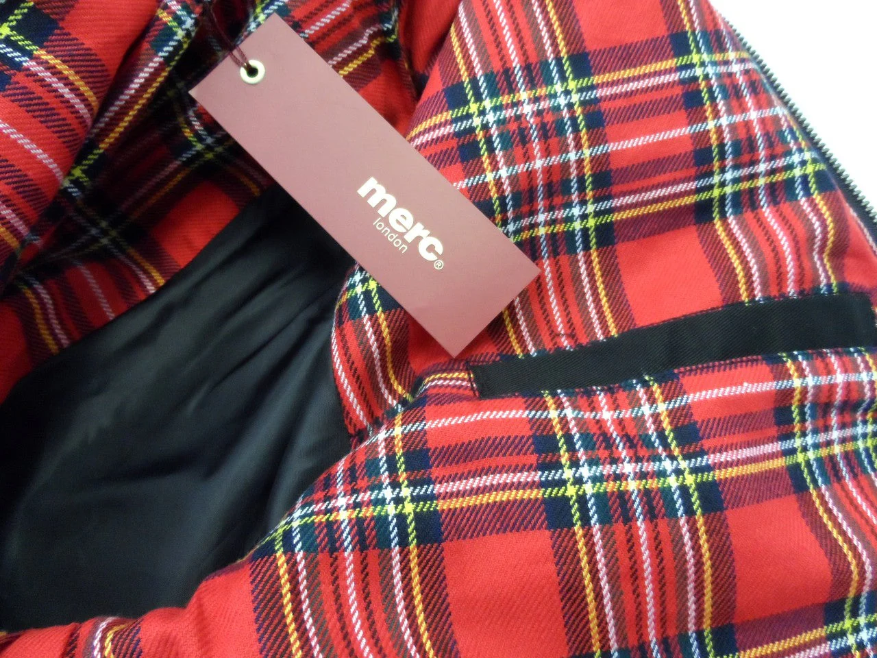 The Mary Harrington jacket is lined with a bold and contrasting red tartan and features an inside button pocket; detailed with the embroidered merc crown.