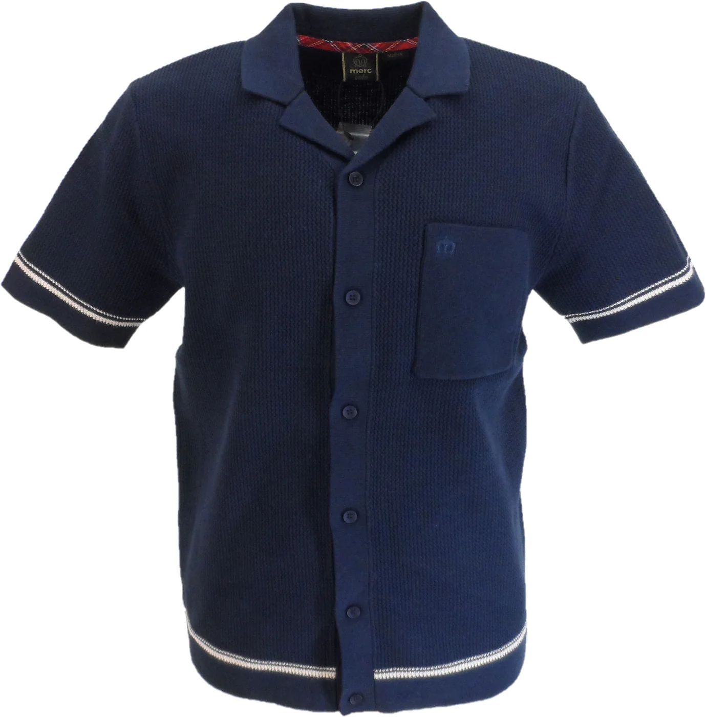 Experience the perfect combination of style and comfort with the Merc Mens Navy Blue Knitted Vintage Mod Polo Shirts. Made from high-quality cotton knit, this regular fit shirt features a textured design and a tonal button through fastening. The Retro notched camp collar gives it a classic touch, while the finely ribbed cuffs and hem add a modern twist. Complete with twin tipping and a chest pocket featuring the iconic Merc tonal crown embroidery, this shirt is a must-have for any fashion-forward individual.