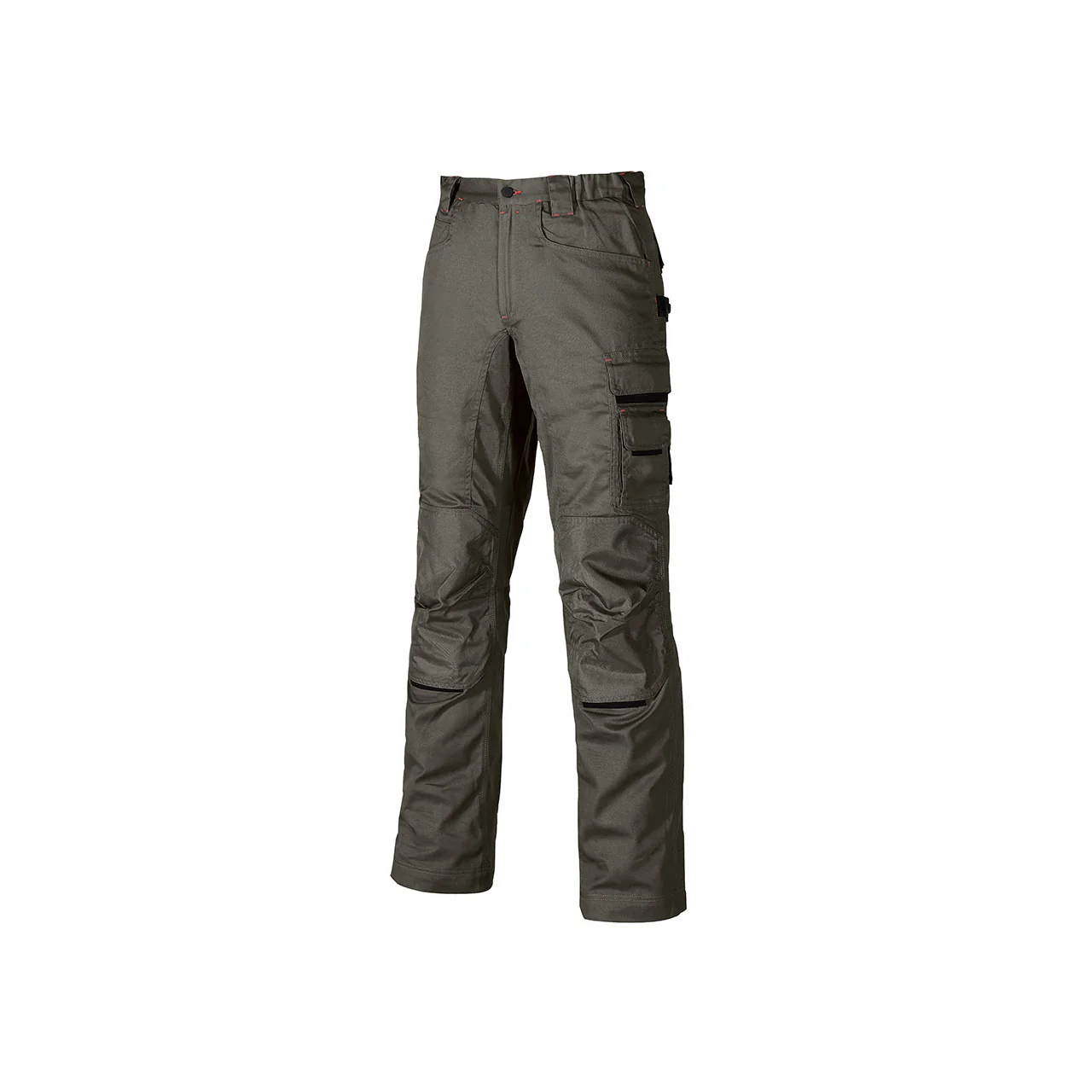 Pantalone da lavoro in policotone twill dotato di 2 ampie tasche anteriori, tasca laterale portautensili, tasca laterale multifunzionale, porta badge, 2 tasche posteriori con pattina chiuse con velcro, 2 tasche porta ginocchiere con tessuto di rinforzo antiusura; fettuccia porta martello regolabile, regolazione in vita con elastico.