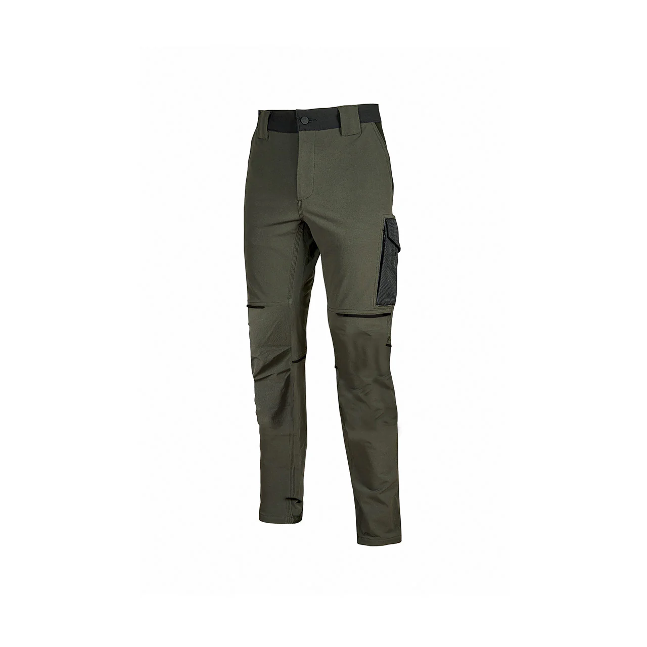 Pantalone in tessuto U-4 (U-Power 4 way stretch) molto comodo, resistente, morbido sulla pelle, idrorepellente, traspirante e asciuga rapidamente. Dotato di due ampie tasche anteriori, elastico in vita con un sistema innovativo di regolazione a scomparsa. Carrè posteriore accentuato per una maggior protezione della parte lombare e nastro reflex su passante tubolare posteriore. Tasca laterale porta utensili, multifunzionale con porta badge a scomparsa, due tasche posteriori di cui una con pattina e una con chiusura di sicurezza a velcro, battitacco in resistente polyoxford 600D. Due tasche, chiuse con zip in corrispondenza del tascone laterale e della tasca frontale destra. Triple cuciture, bottone antigraffio, zip YKK, Slim Fit.