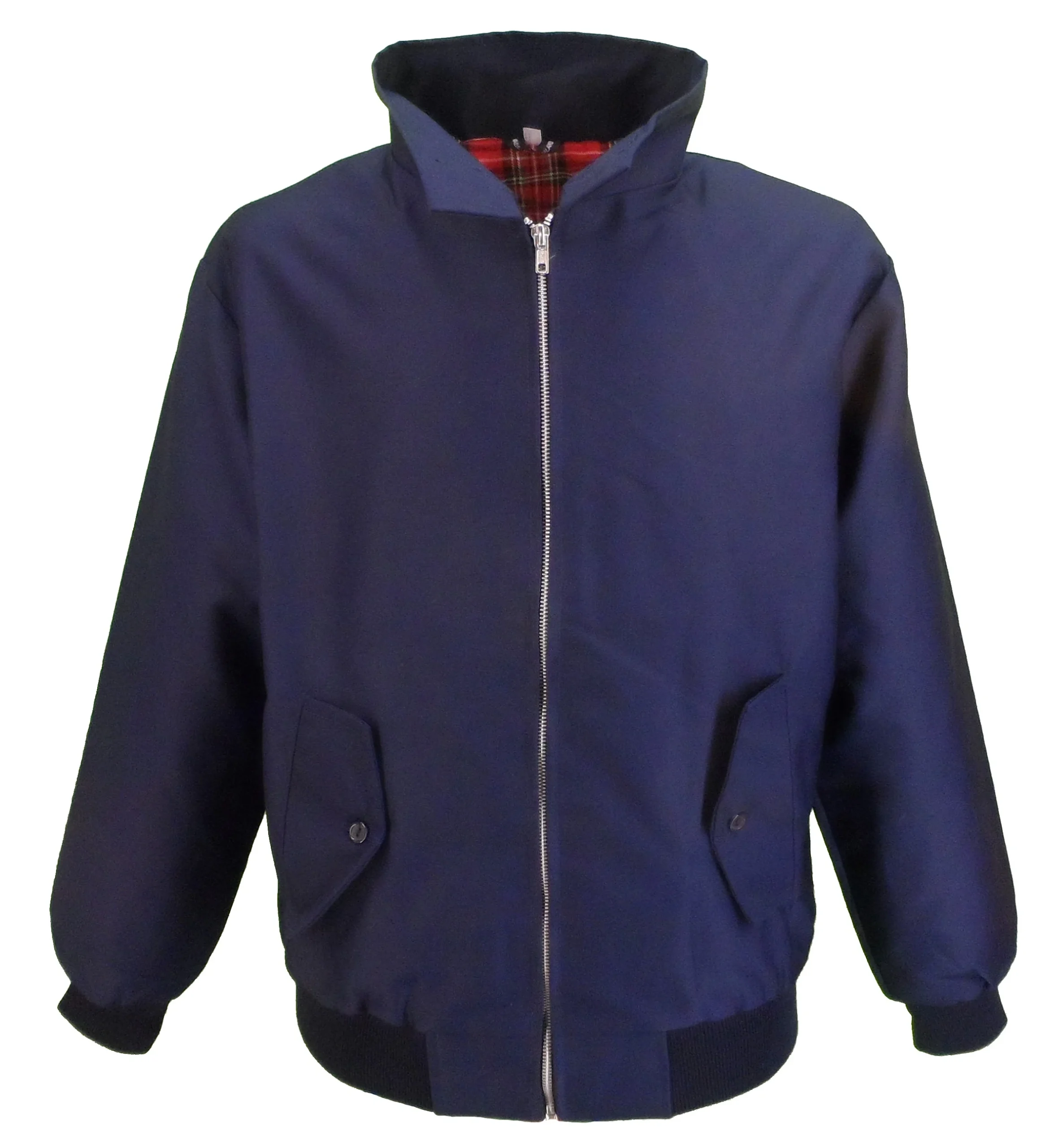 Mazey’s Men’s Classic Navy Harrington Jacket Metal Zipped with tartan lining and inner pocket two side pockets with button-up flaps collared with the option for buttoning up with two buttons.