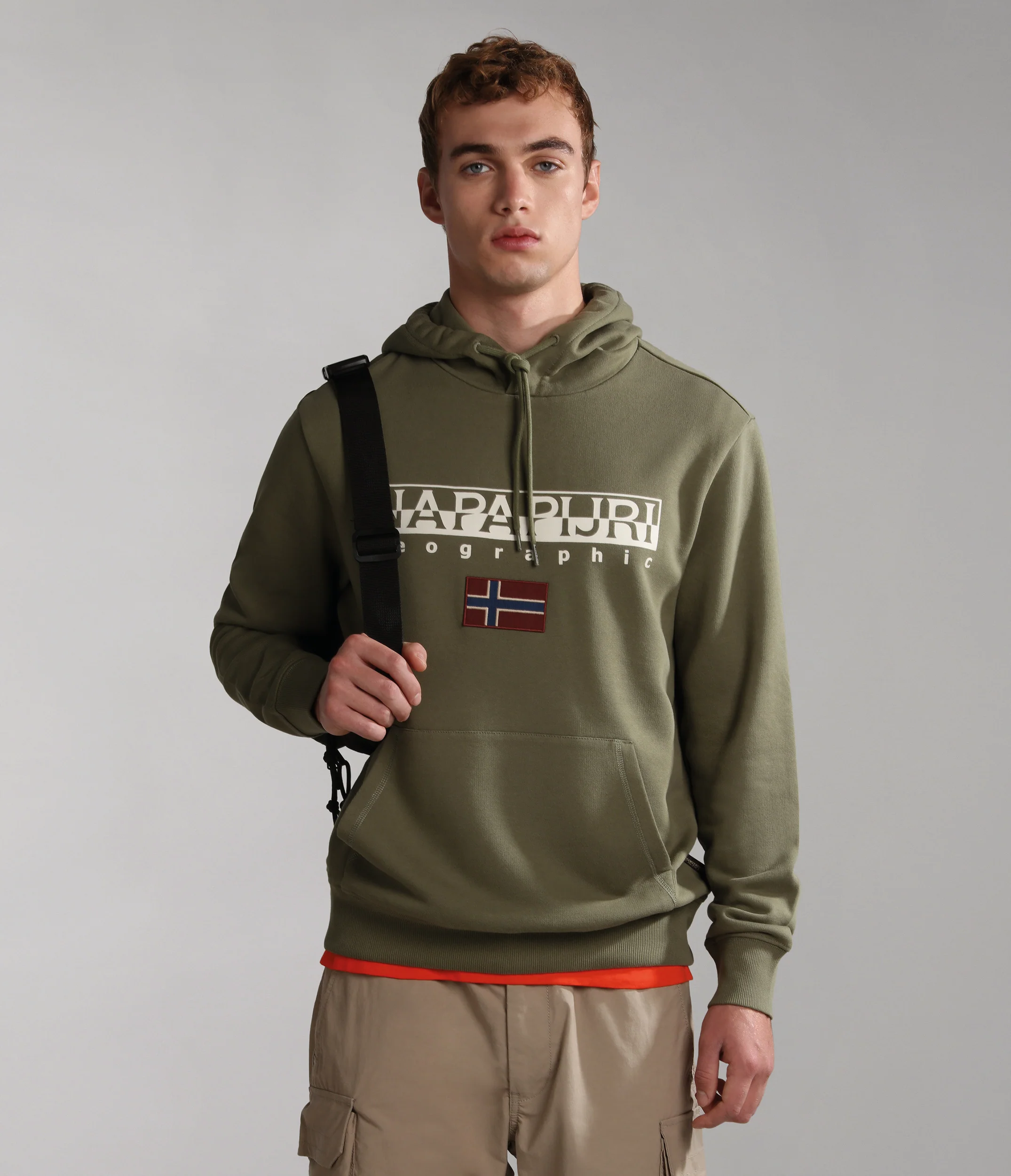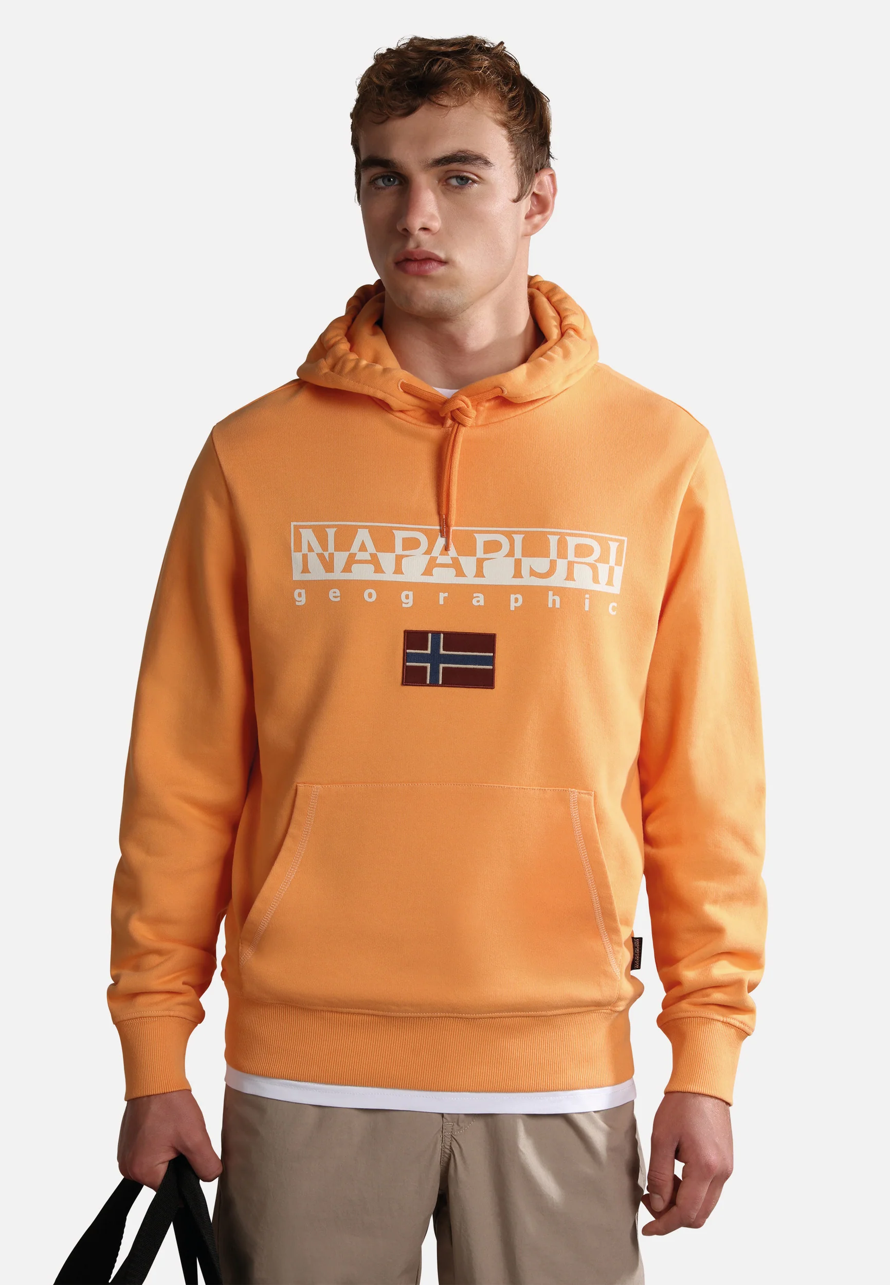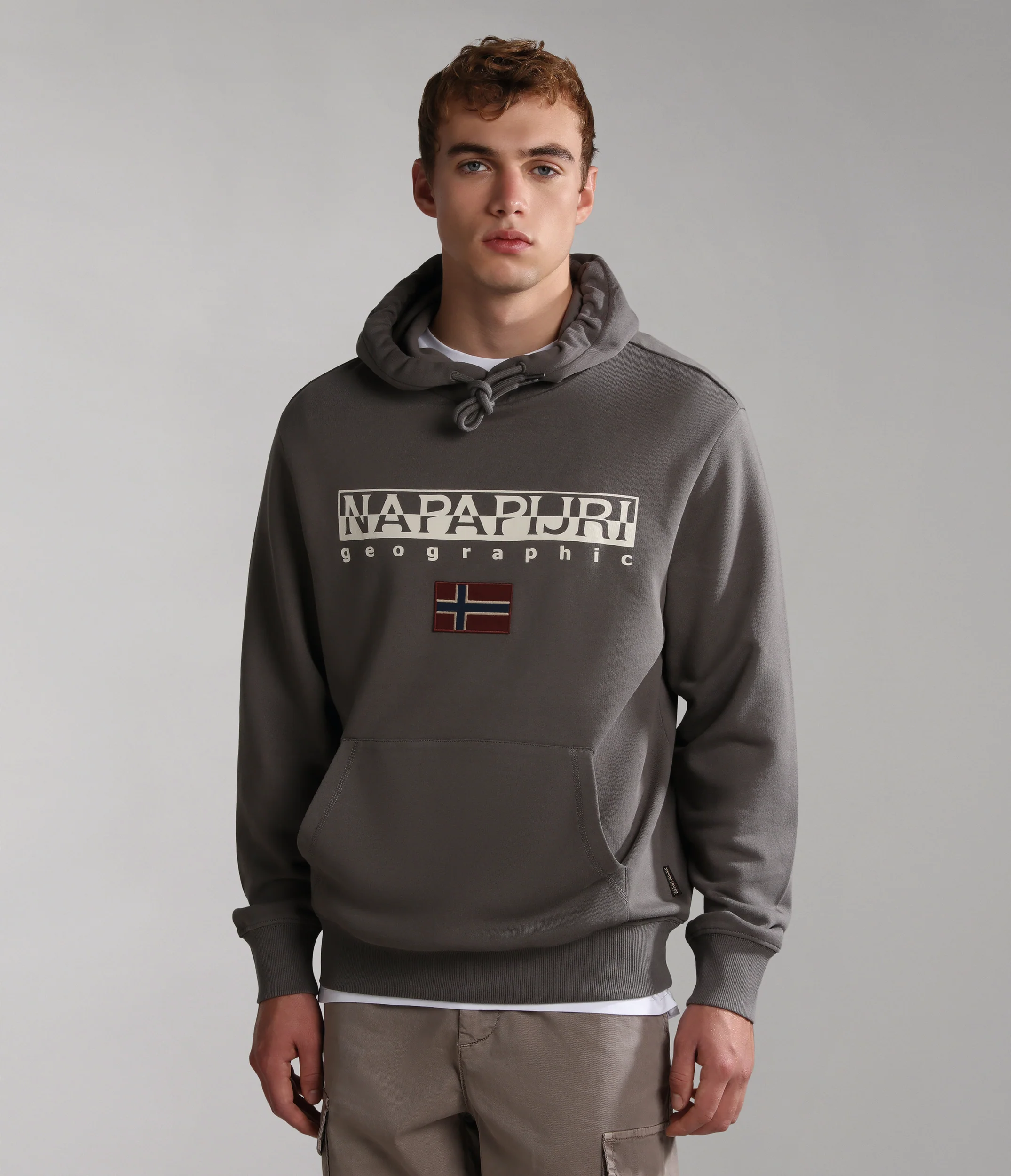 100% cotone. Presenta cappuccio regolabile e tasca a marsupio, distintivo logo Napapijri Geographic e bandiera norvegese stampati sul petto.