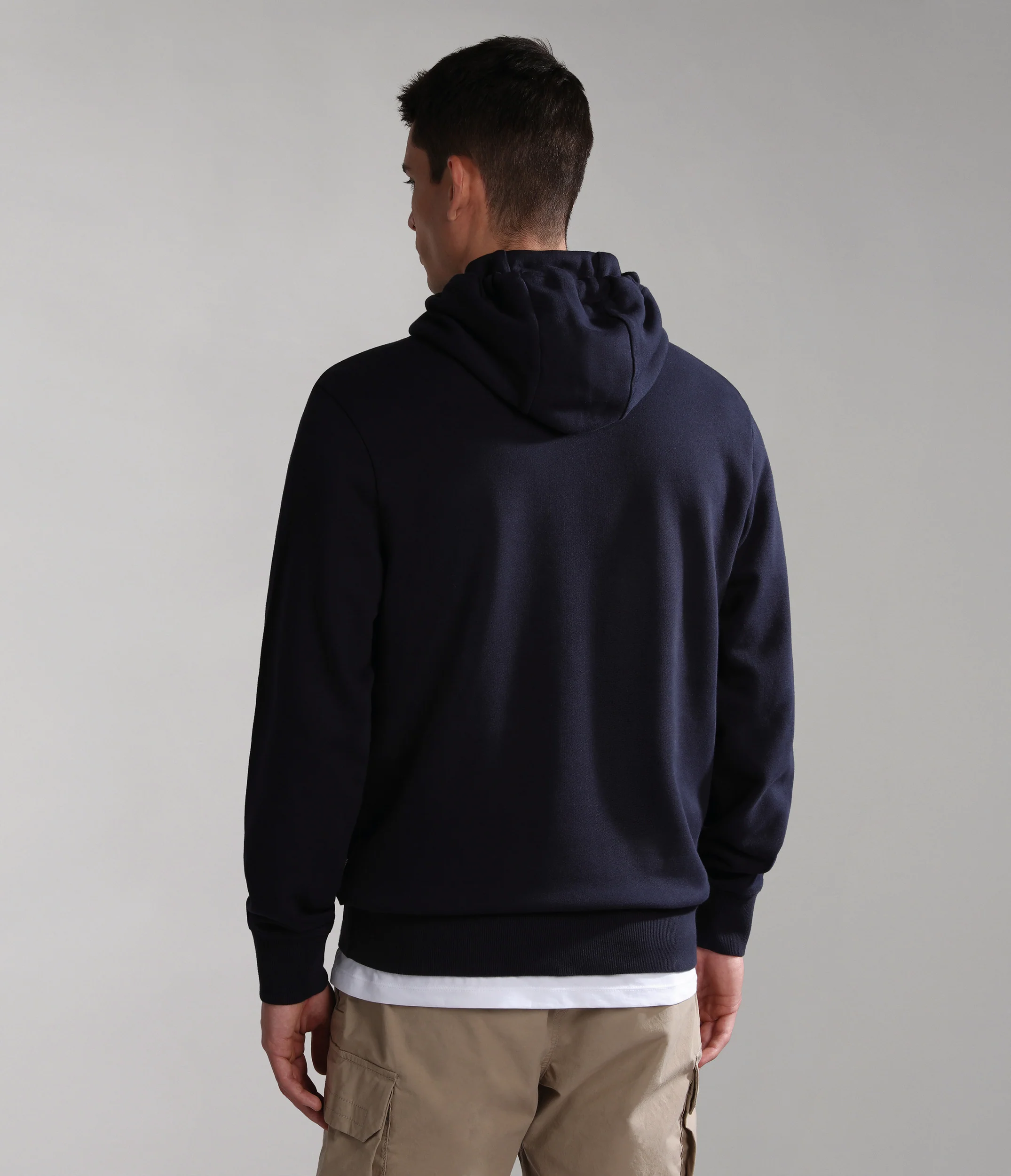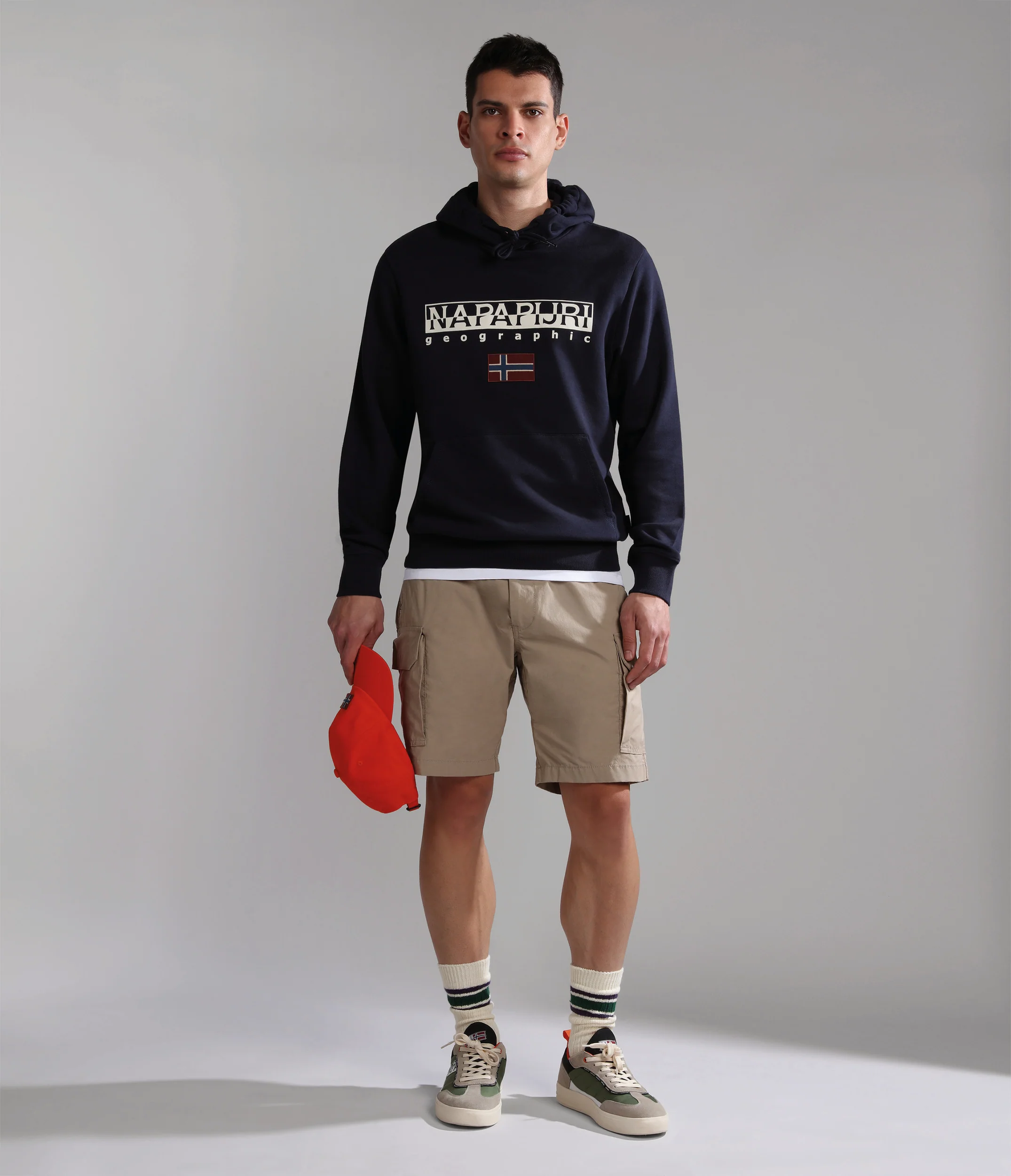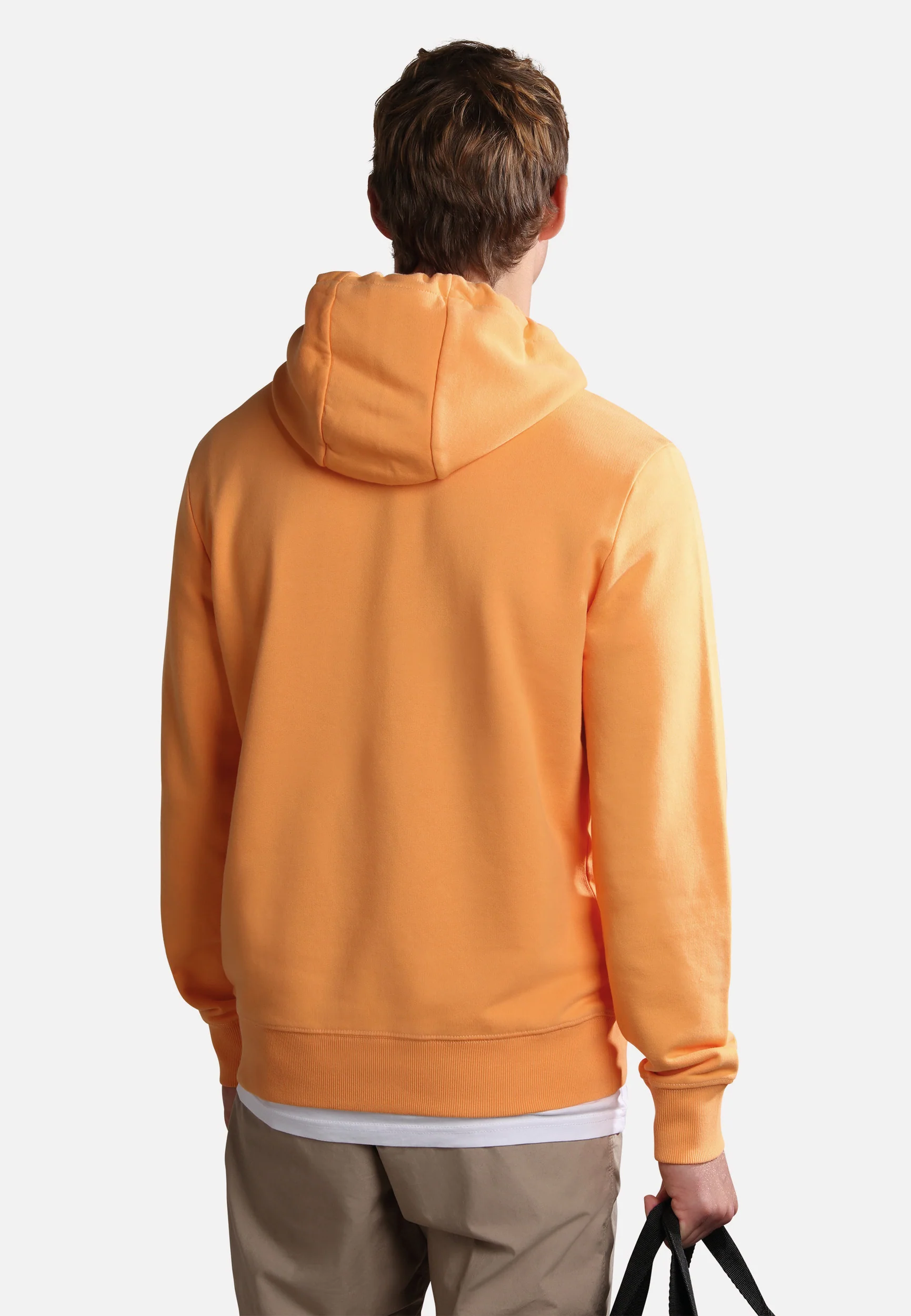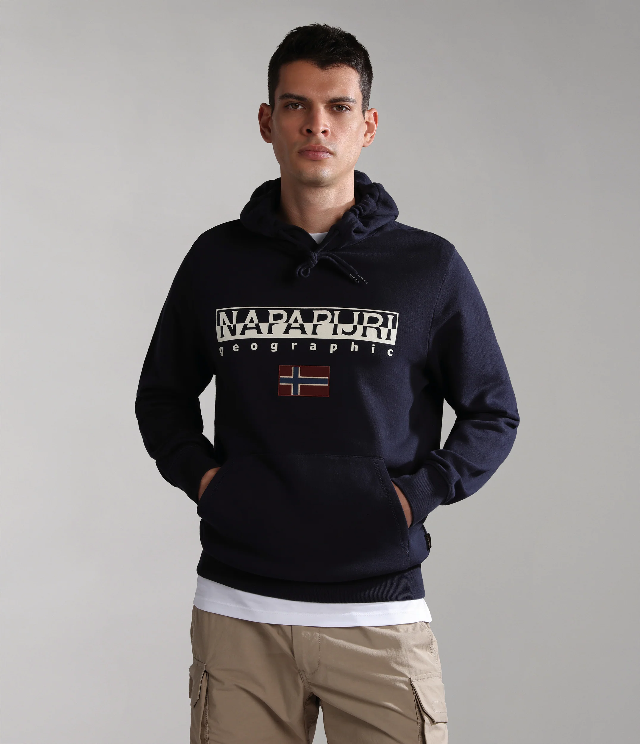 100% cotone. Presenta cappuccio regolabile e tasca a marsupio, distintivo logo Napapijri Geographic e bandiera norvegese stampati sul petto.