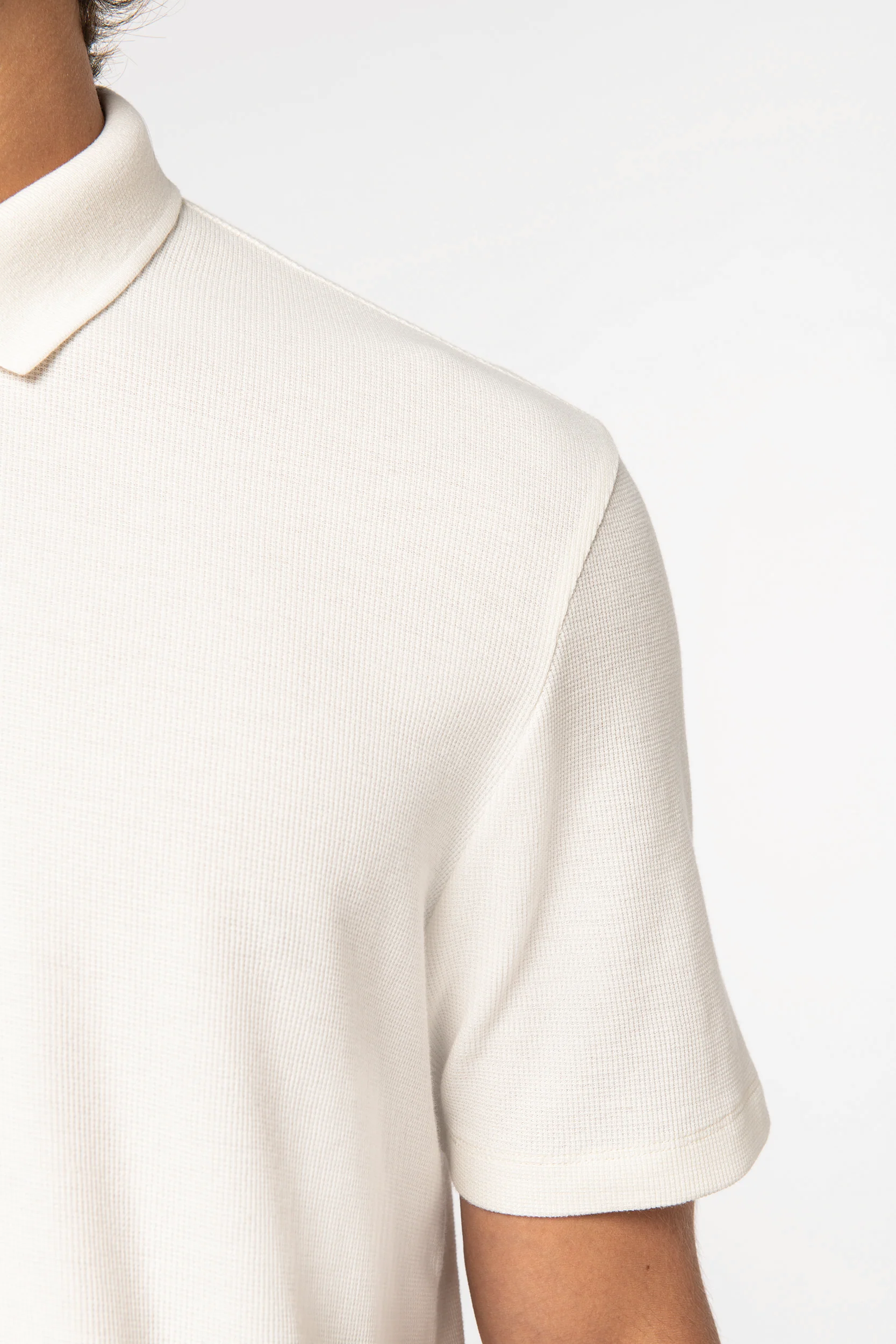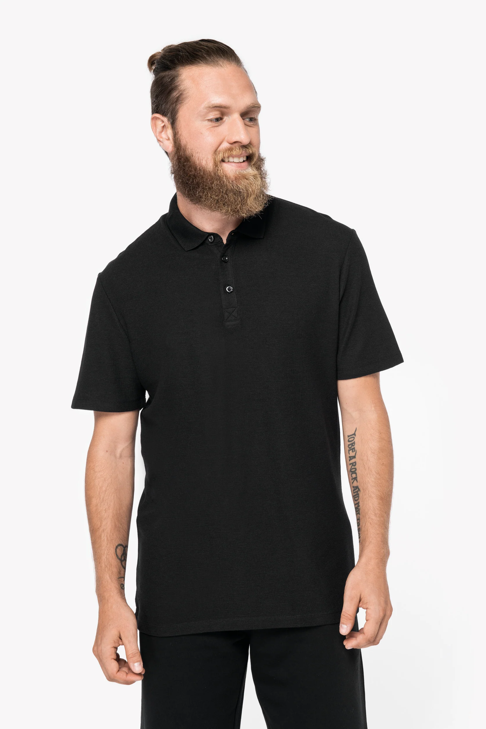 50% cotone biologico / 50% modal TENCEL™. *TENCEL™ è un marchio di Lenzing AG. Cotone pettinato ringspun. Taglio aderente. Maglia goffrata. Collo con interno collo. Pattina con 3 bottoni tono su tono in plastica riciclata. Spacchetti laterali con finitura dotata di nastrino di rinforzo all’interno nel tessuto principale. Doppia sovracucitura a fondo capo e fondo manica.