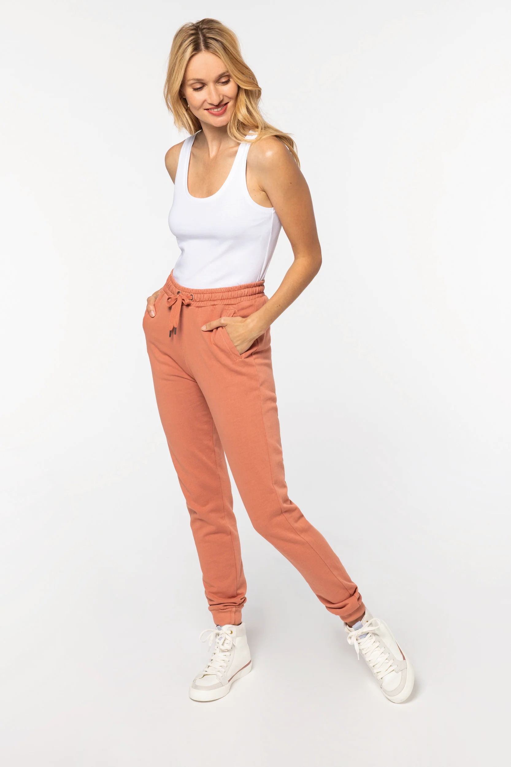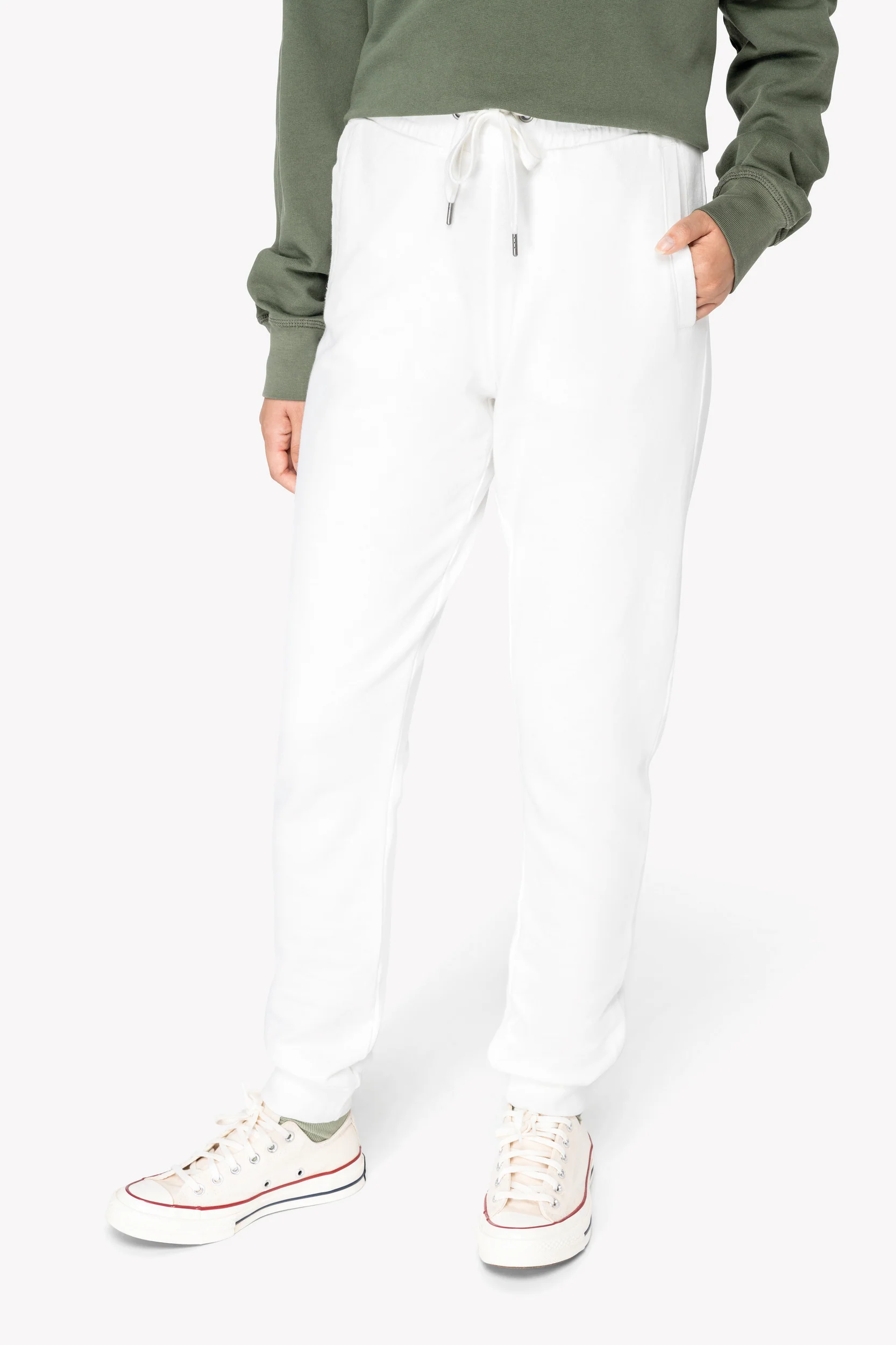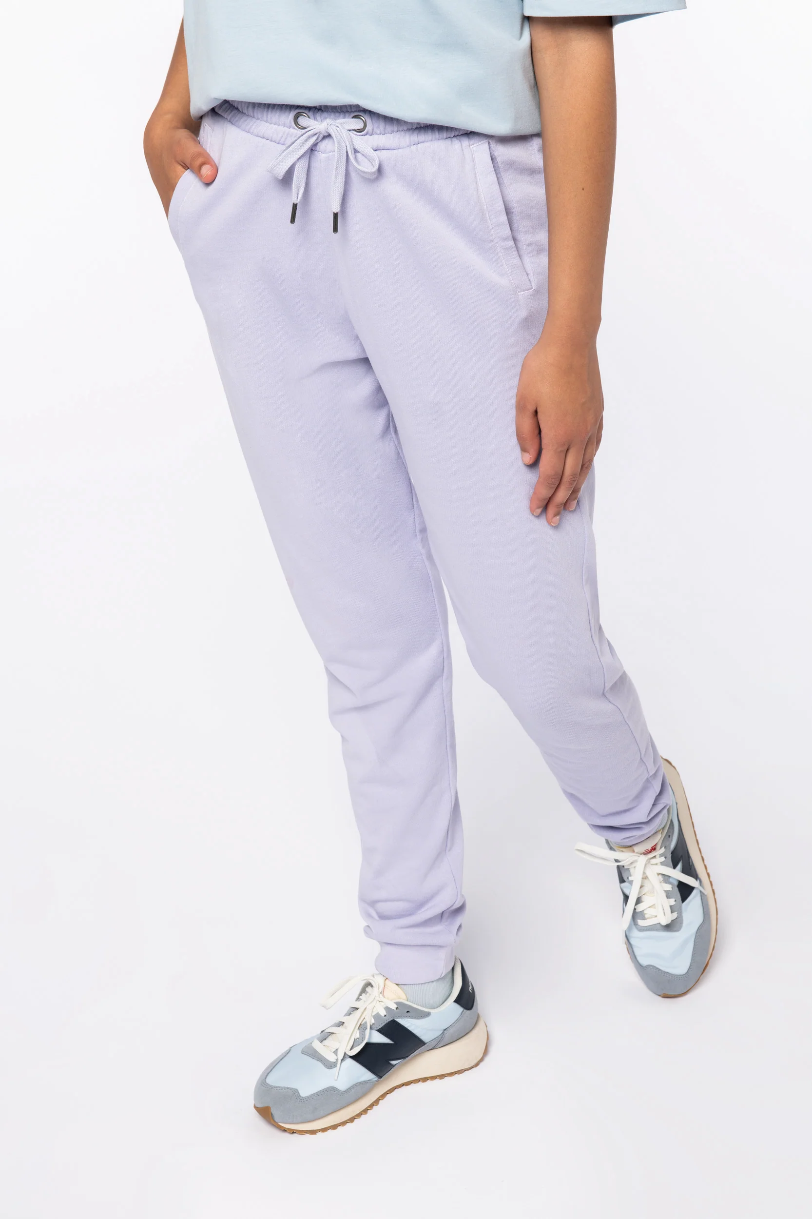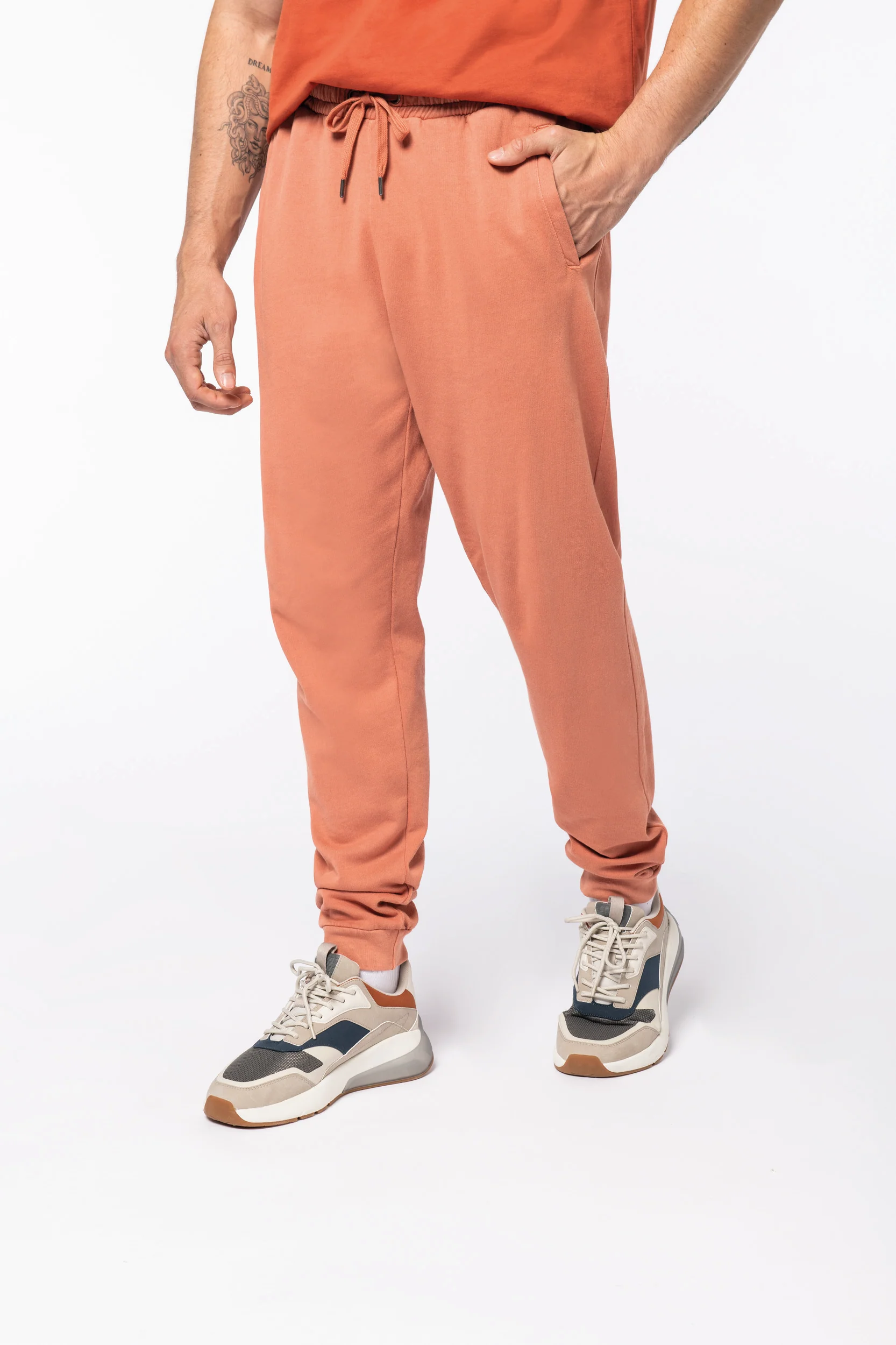 Capo con lavaggio agli enzimi. Due tasche laterali. Girovita elastico con cordone piatto, occhielli e puntali in metallo riciclato. Fondo gamba a costine 1 x 1. Tasche a filetto davanti e dietro. Tinto in capo dopo il confezione: i colori possono variare tra un prodotto e l’altro. A contatto con superfici o indumenti chiari potrebbero stingere.