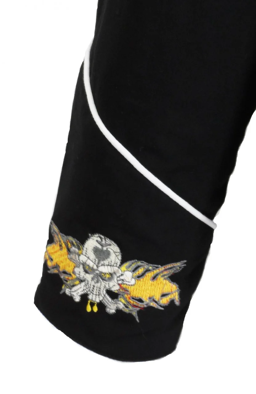 A classic Cowboy shirt made of Polycotton with popper fastening at the front 4 popper cuff fastening and 2 slanted breast pockets, front back and collar embroidery finished with White piping