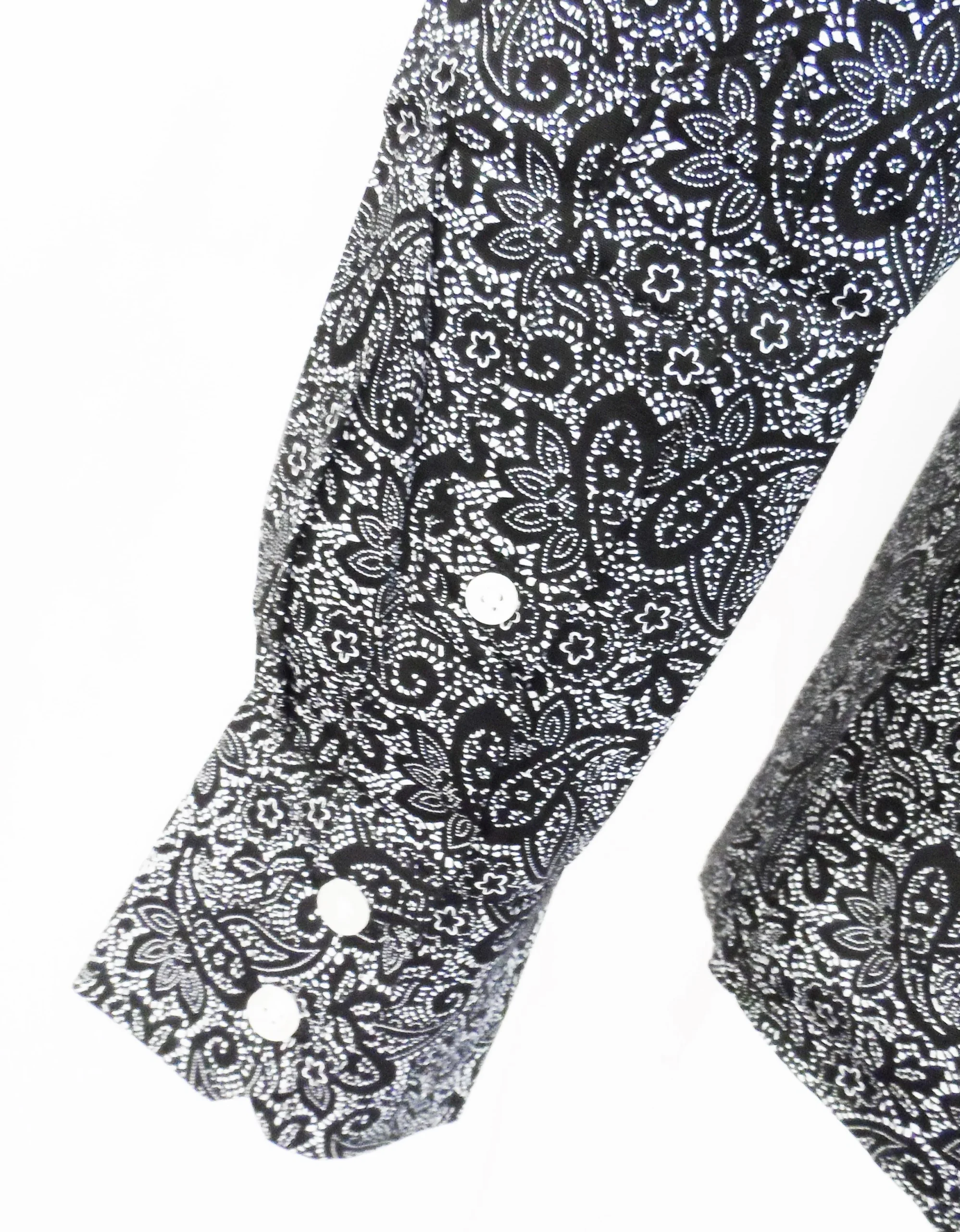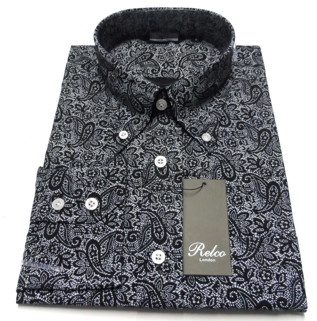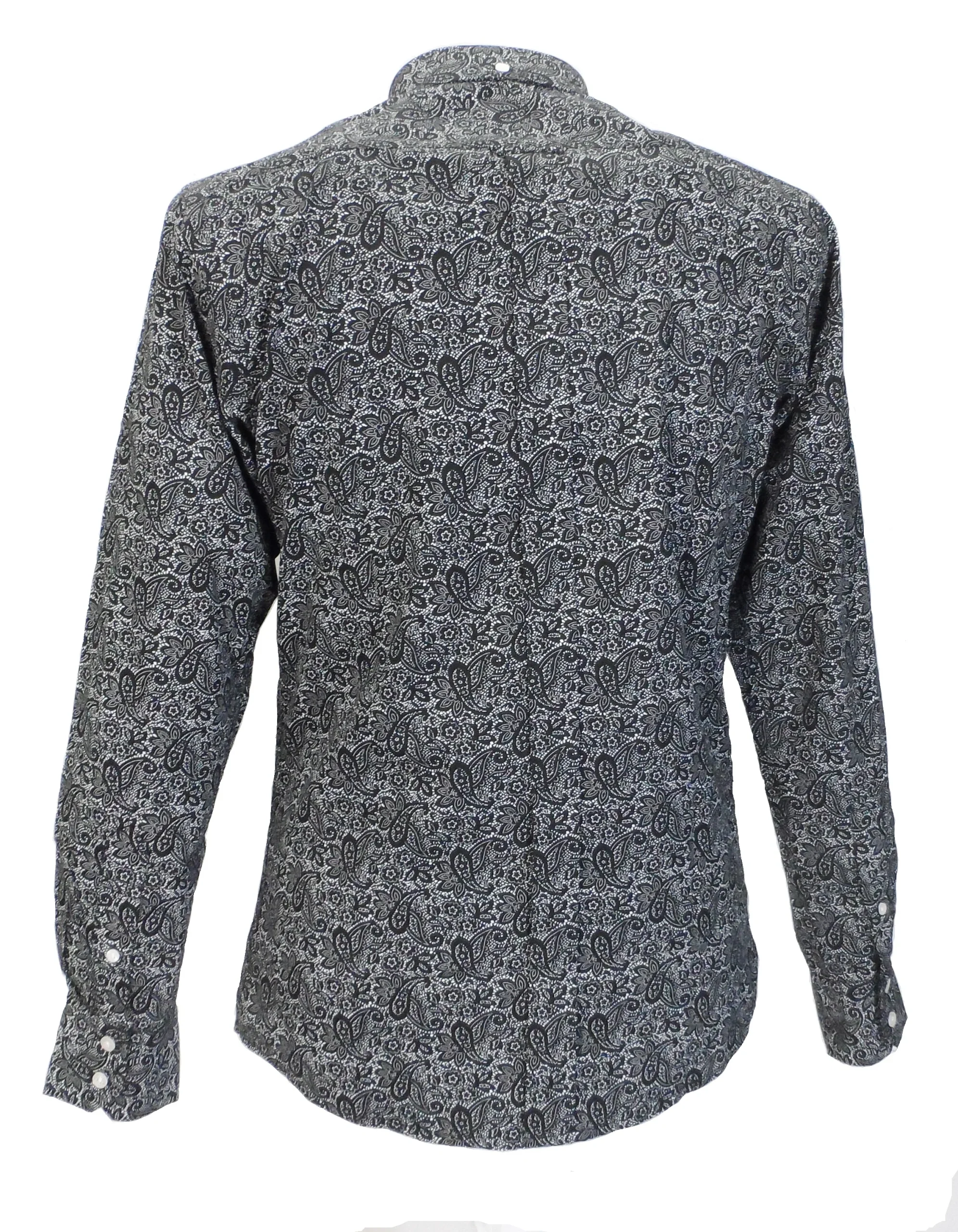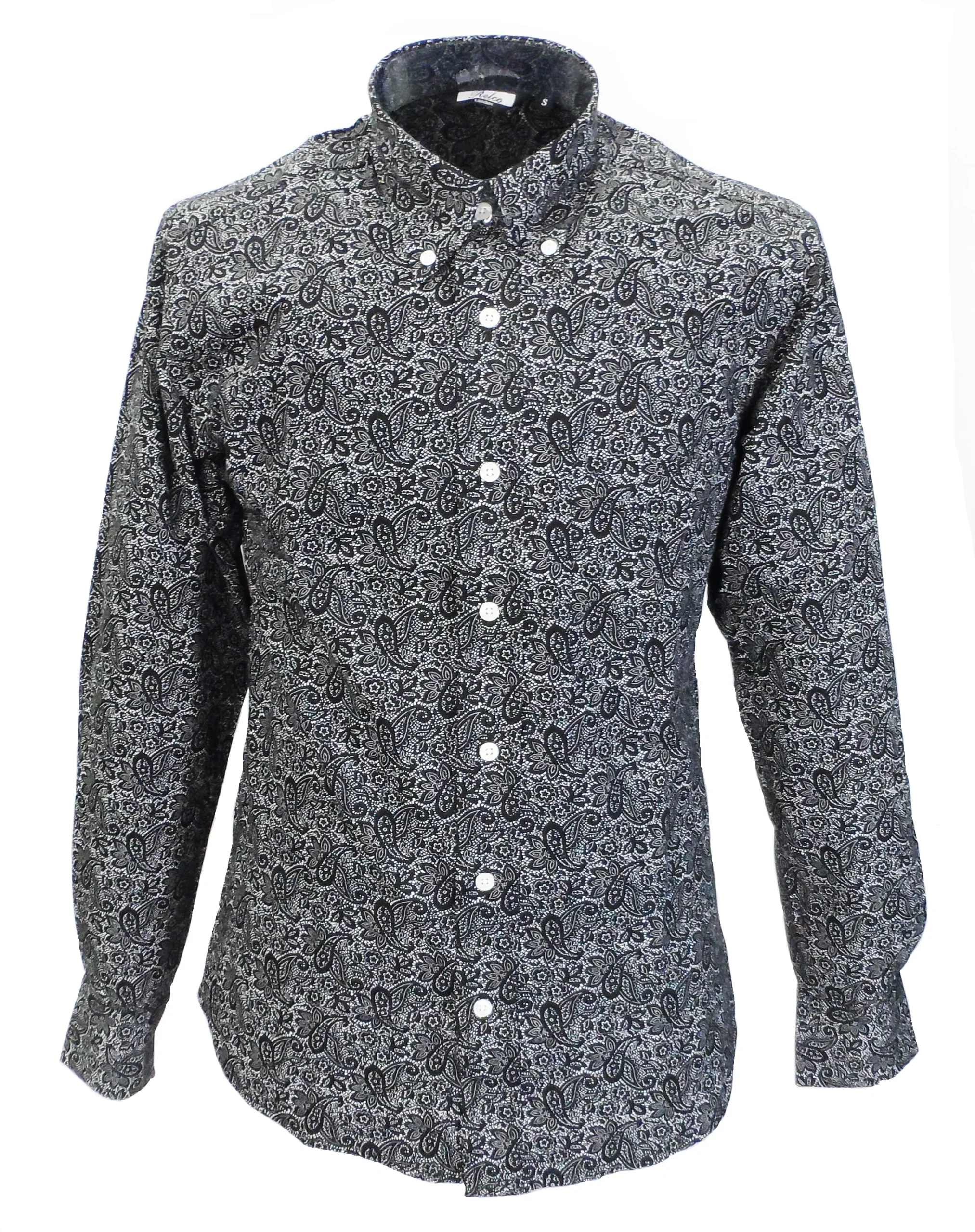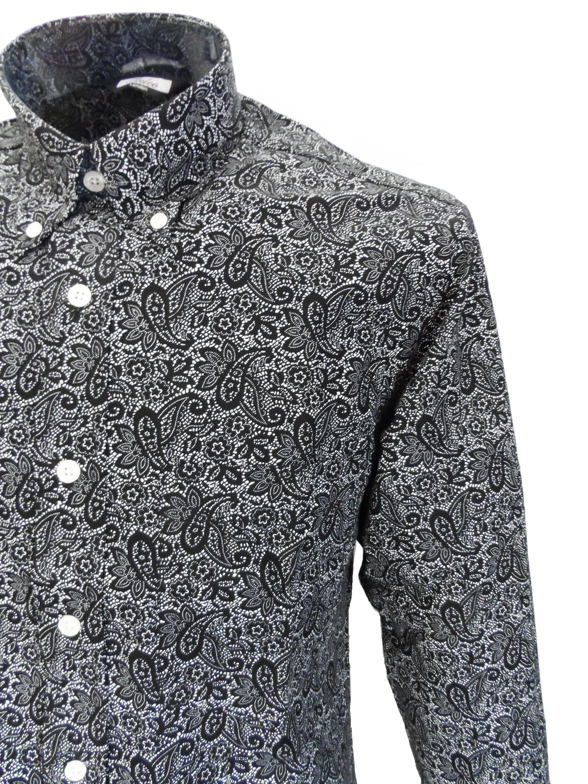A classic vintage styled vintage button down Black Paisley shirt, mod-fit and with full back pleat, with front breast pocket. Part of our Men’s Paisley Shirts collection.