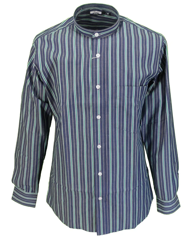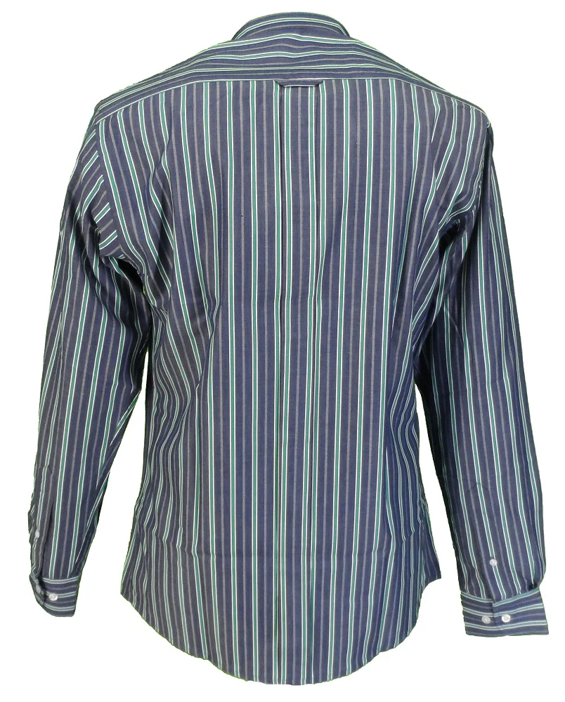 Relco Blue & Green Striped Grandad Collar Long Sleeved Vintage Retro Mod Shirt