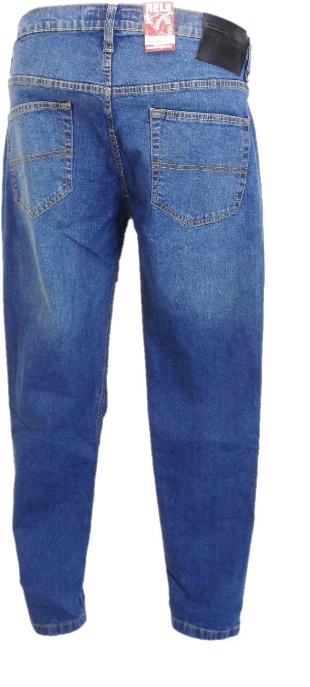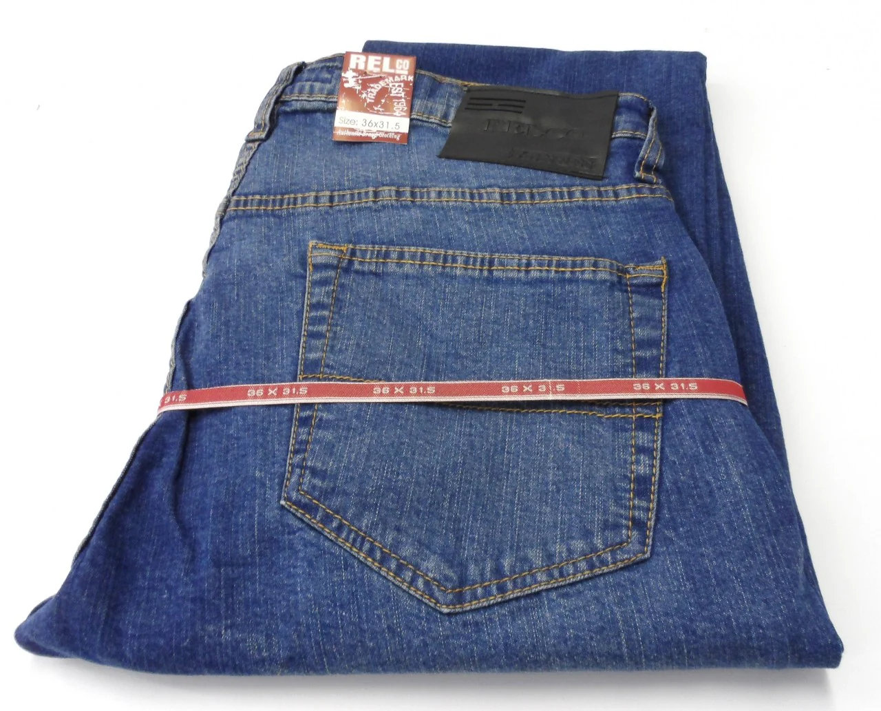 Metal button and YKK fly zip, 5 pockets detail on front, skinny fit with a 31.5-inch leg back Relco brand patch.