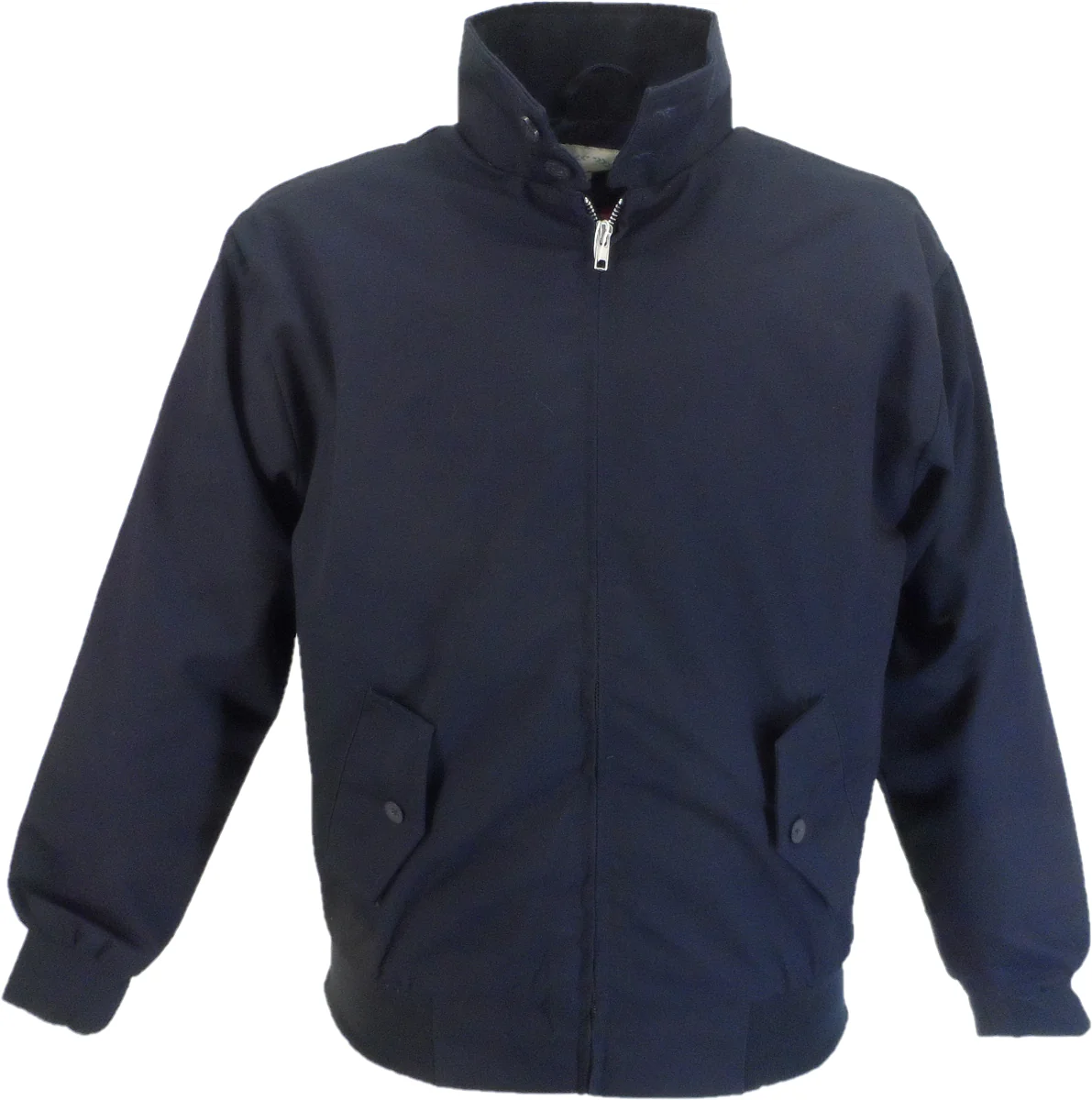 The classic Navy Harrington jacket. Lightweight cotton red tartan lining right up to the zip, double button collar, brass metal zip elasticated cuffs, flap style button pocket, and wavey seam on back shoulder exactly like the originals.