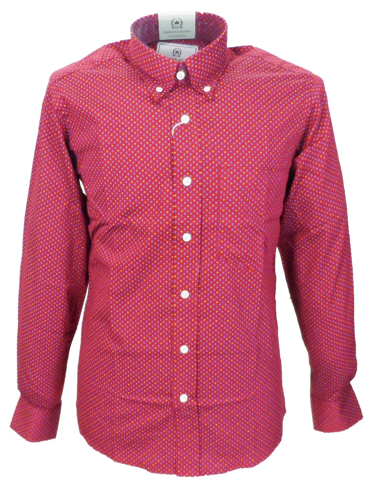 Relco Platinum Red Floral Cotton Long Sleeved Retro Mod Button Down Shirt