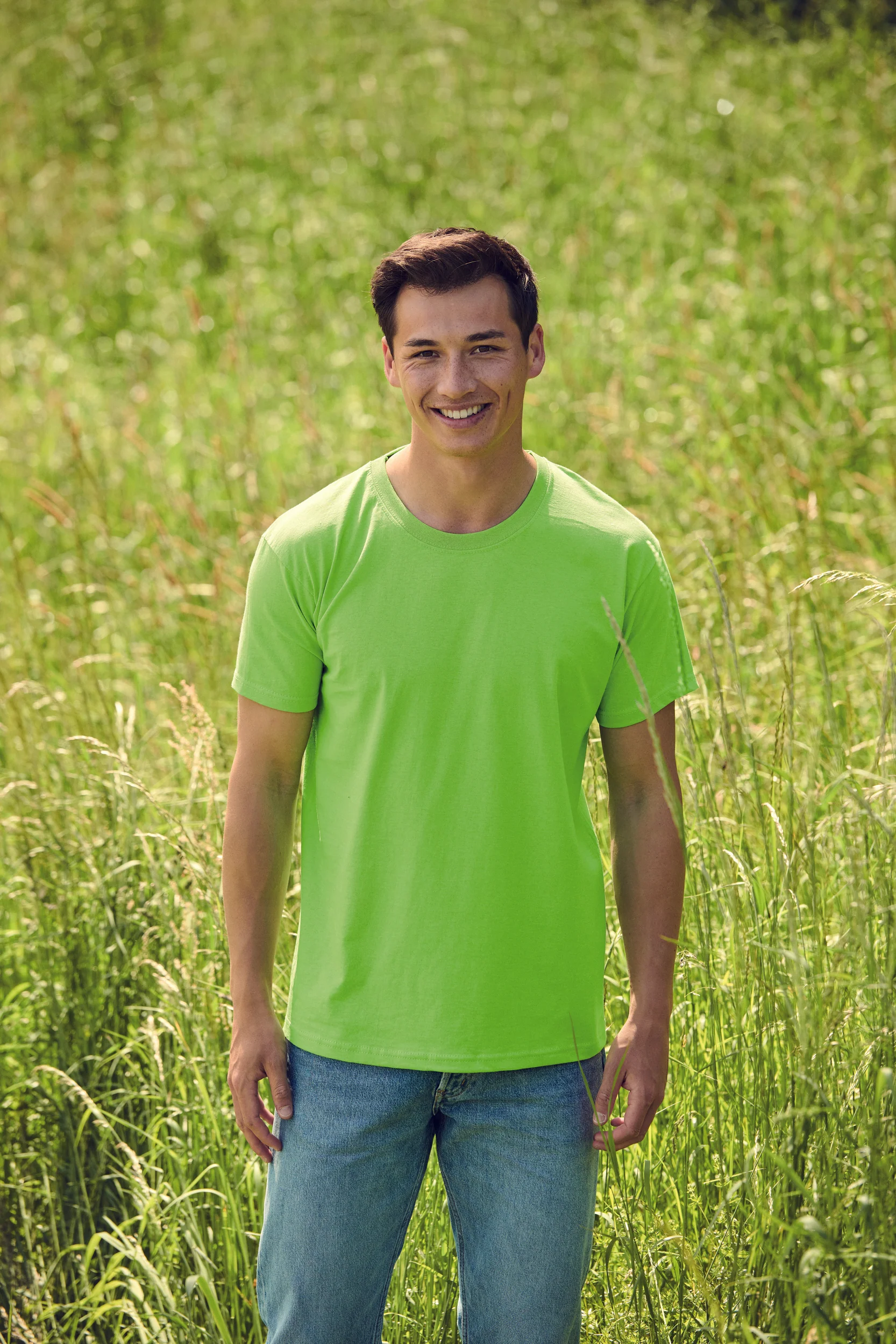 100% Cotone (eccetto Ash: 99% Cotone / 1% Poliestere – Heather Grey: 97% Cotone / 3% Poliestere – altri colori Heather 50% cotone/ 50% poliestere). Collo in cotone / Lycra® con nastrino dello stesso tessuto. Taglio tubolare. Certificato STANDARD 100 by OEKO-TEX®N° 08-5295, Shirley.